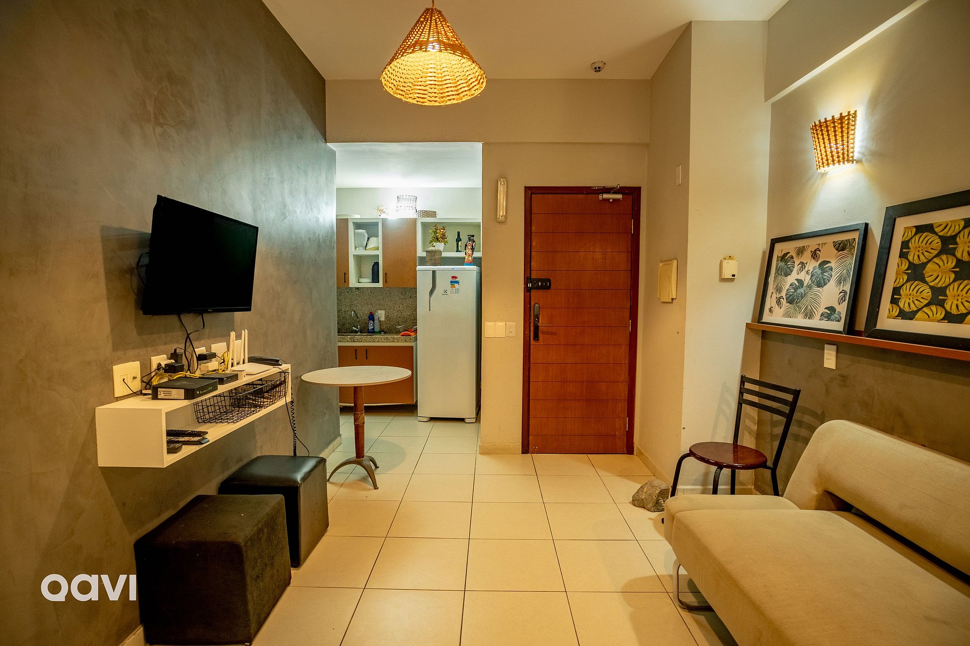 - Sala: Um sofá-cama solteiro e TV de 30 polegadas.