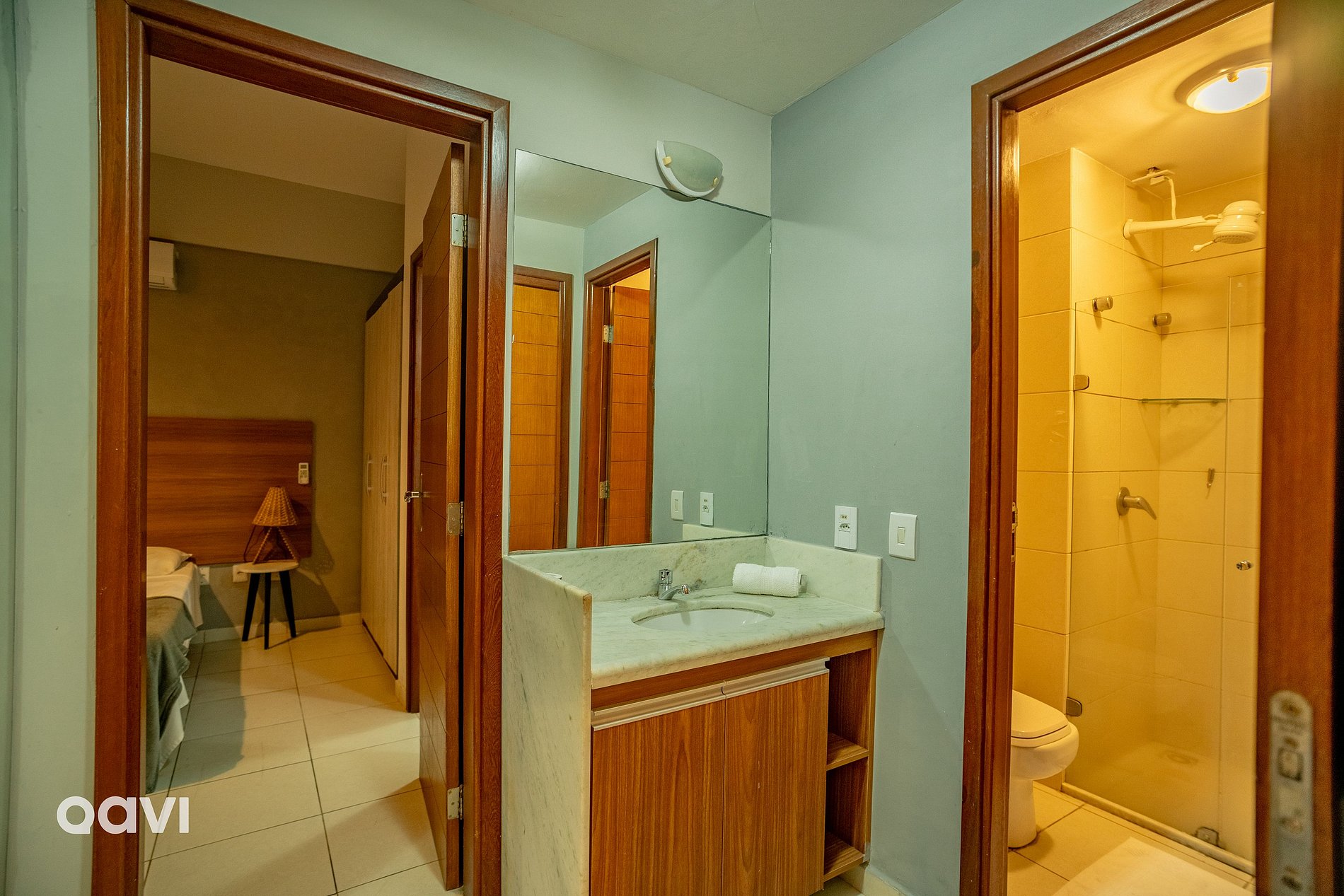 - Quarto Suíte 1: Cama de casal Queen, ar-condicionado, grandes armários para guardar seus pertences e banheiro completo com chuveiro elétrico.