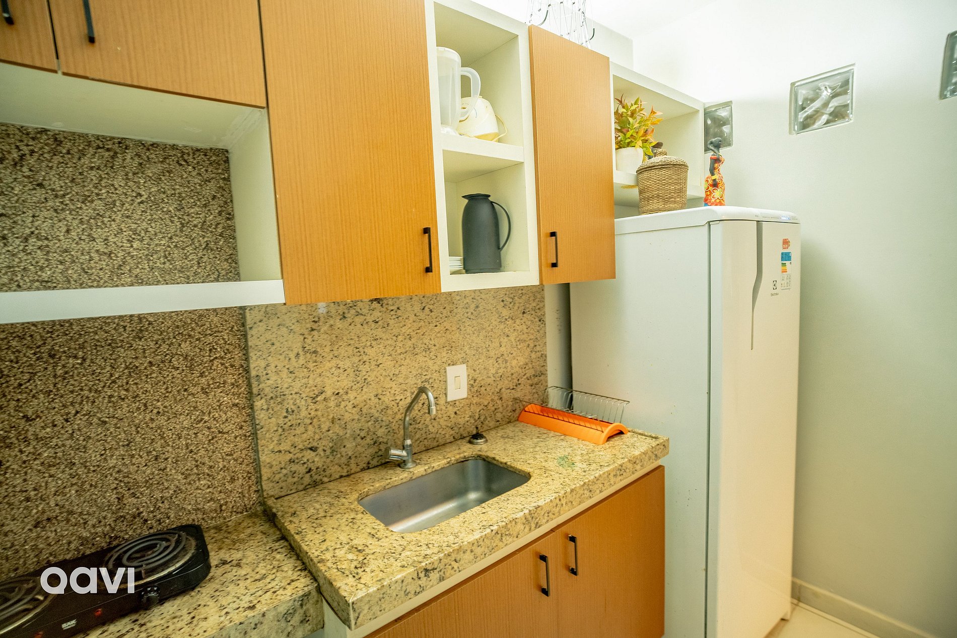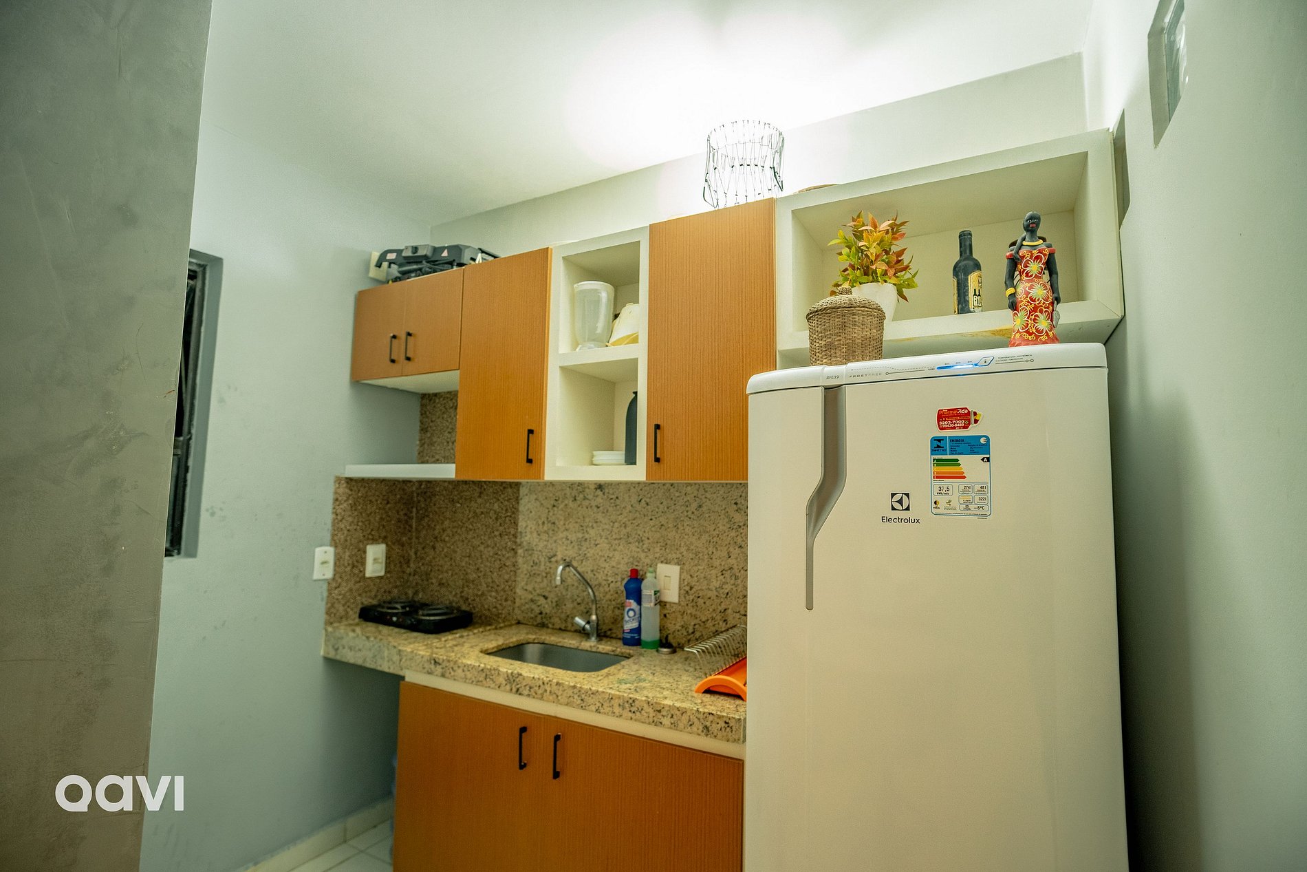 - Cozinha: Geladeira, torradeira, jogo de talheres e pratos, fogão elétrico de duas bocas e diversas panelas.