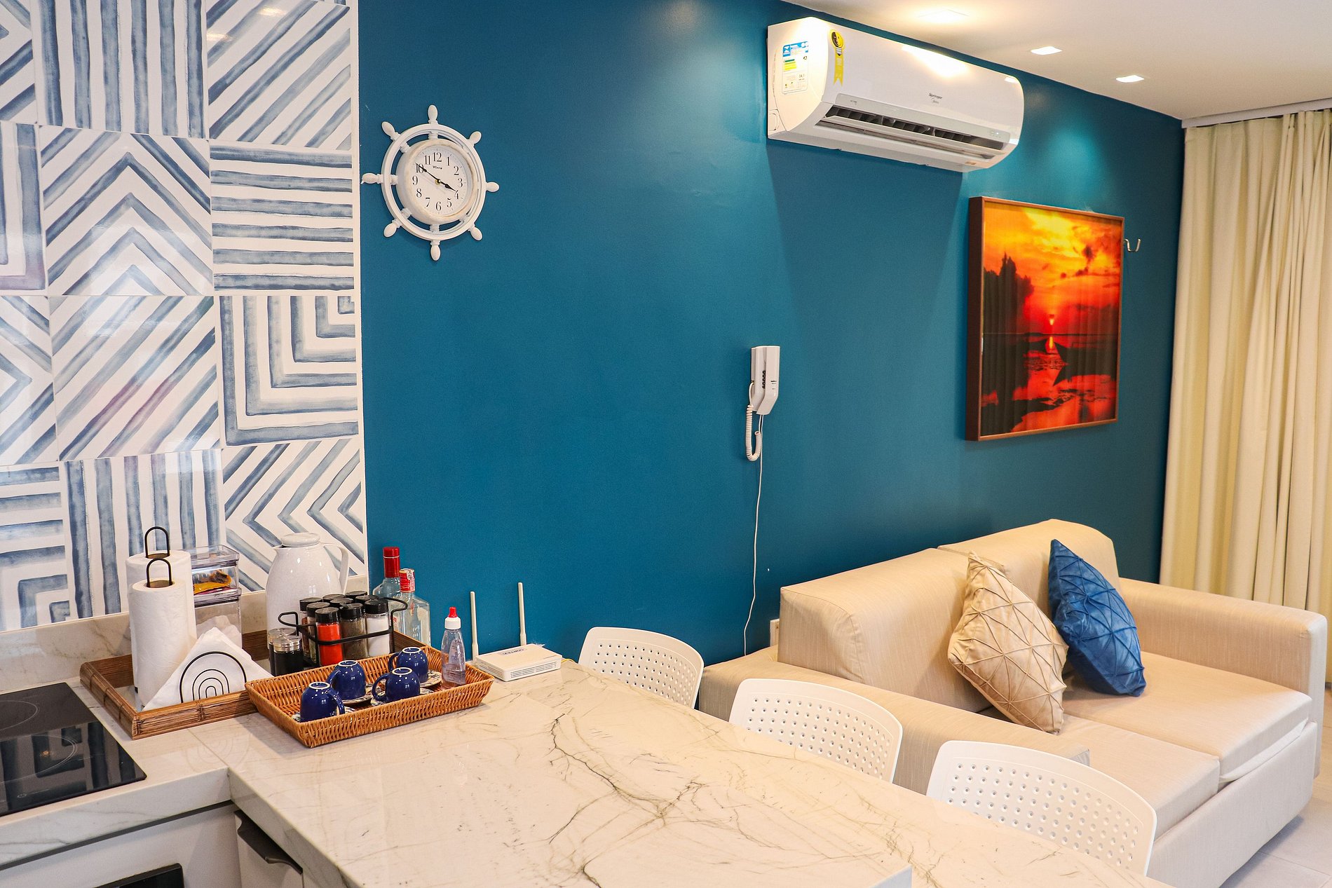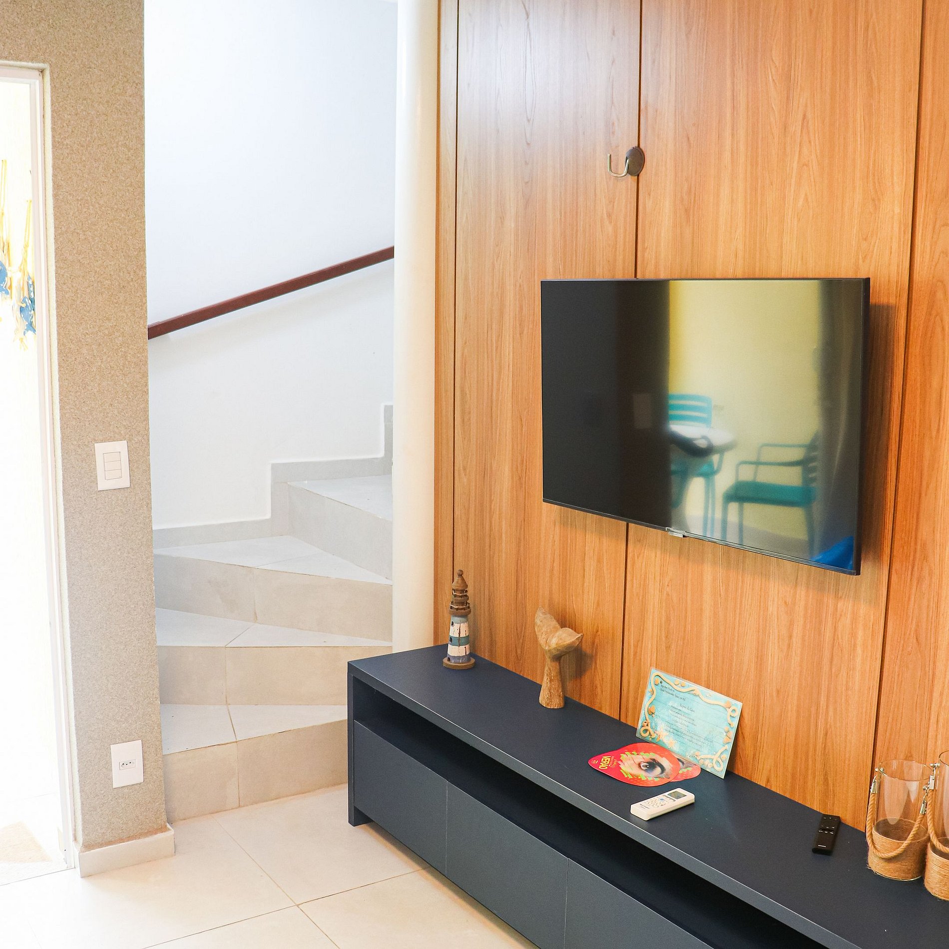 Sala/sala de jantar: sofá-cama casal, ar condicionado, Smart-TV, mesa e cadeiras.