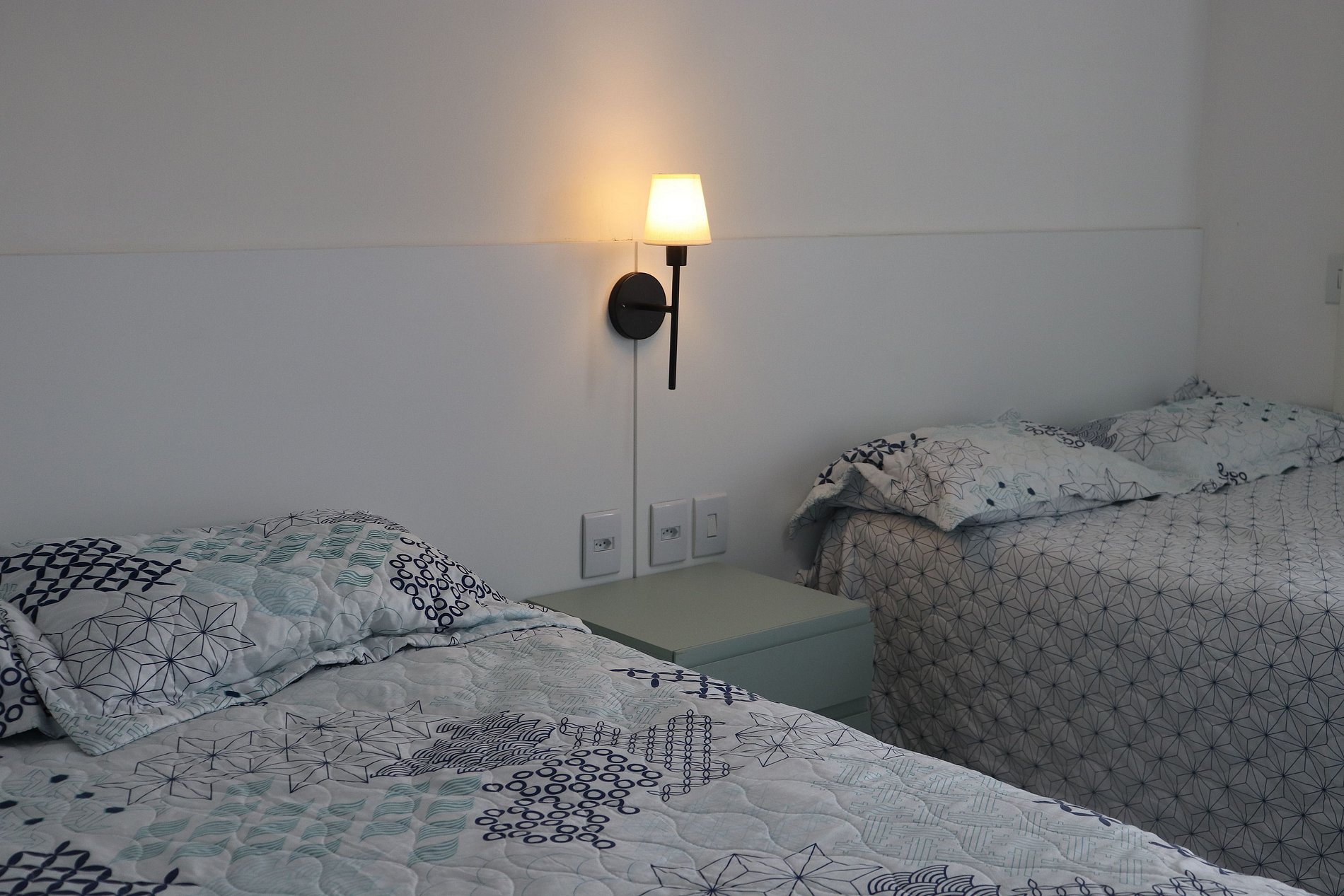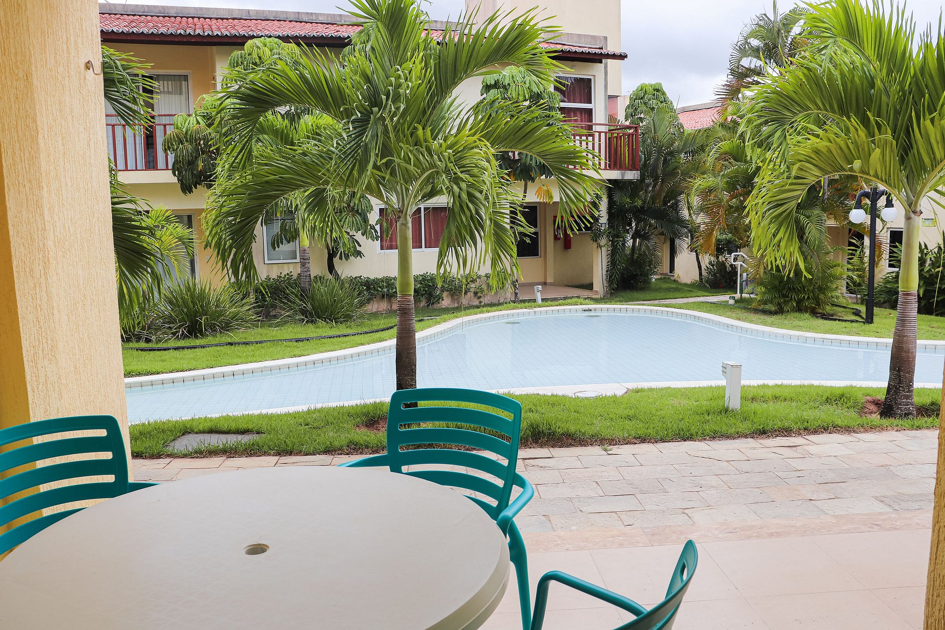 O apartamento é um triplex com 2 quartos, 1 banheiro e 1/2, varanda que dá acesso ao segundo andar (onde há um solário com vista para a piscina principal) e 1 vaga de garagem (rotativa, do condomínio).
