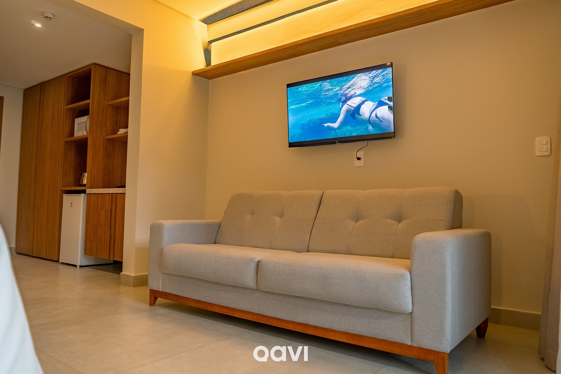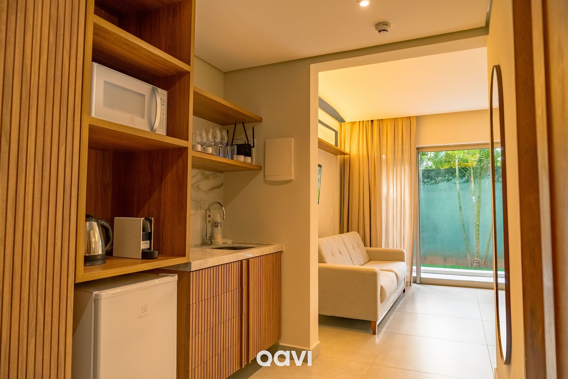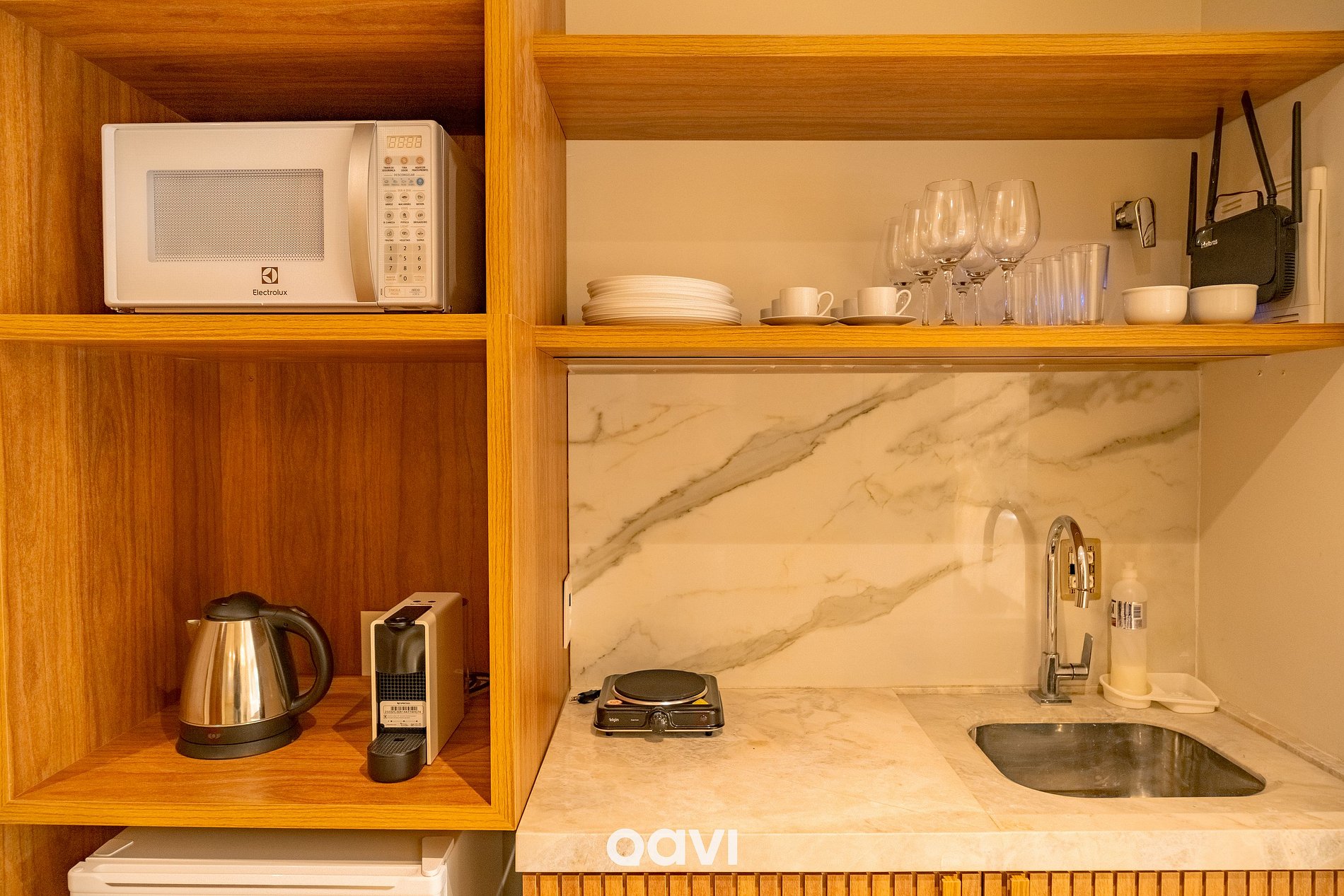 - Cozinha compacta com frigobar, microondas, fogão elétrico, cafeteira de cápsulas e utensílios básicos (pratos, copos, talheres e panelas);