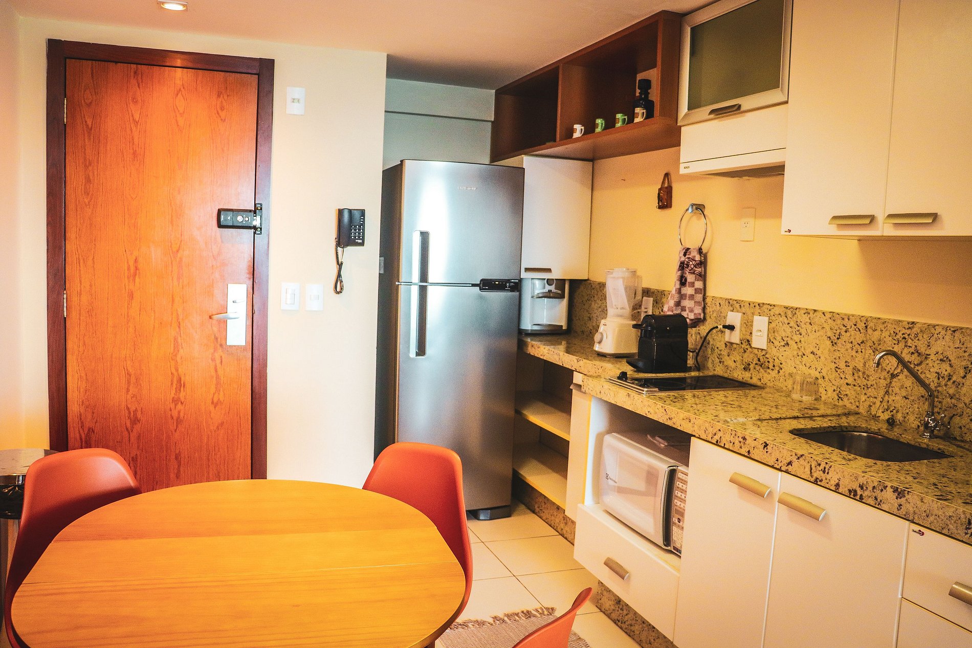 Cozinha: Geladeira, fogão por indução duas bocas, gelágua, micro-ondas, cafeteira, liquidificador, mesa com 4 cadeiras e demais utensílios de cozinha.