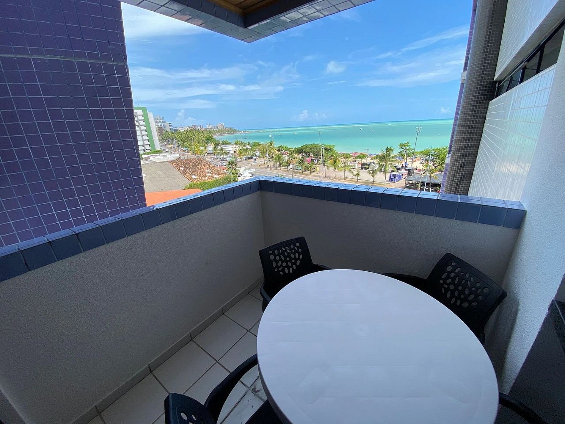 Varanda: vista para o mar, com mesa e cadeiras
