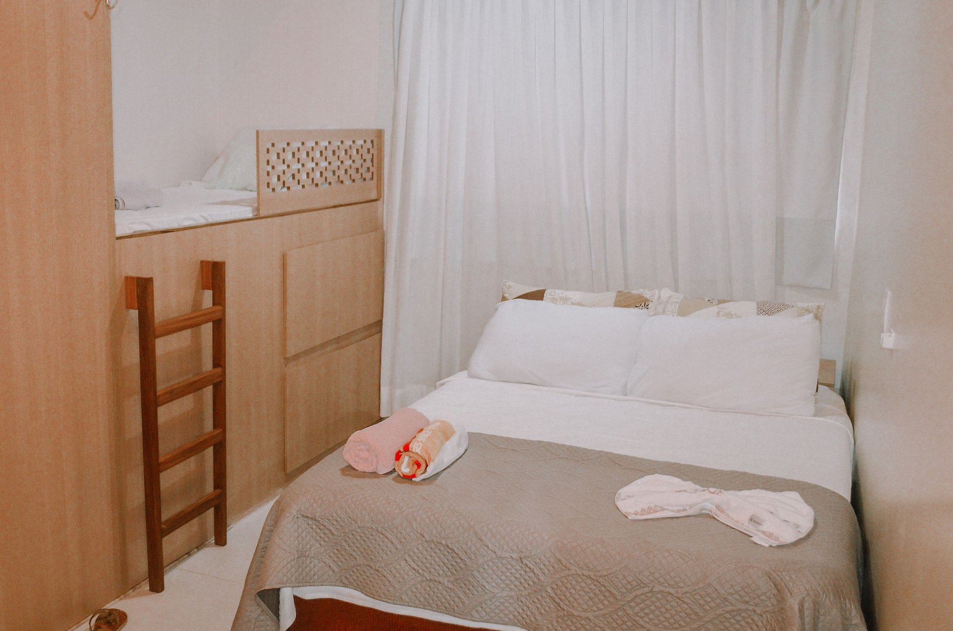 • Suíte com cama de casal + cama de solteiro, ar-condicionado, armário e rede;