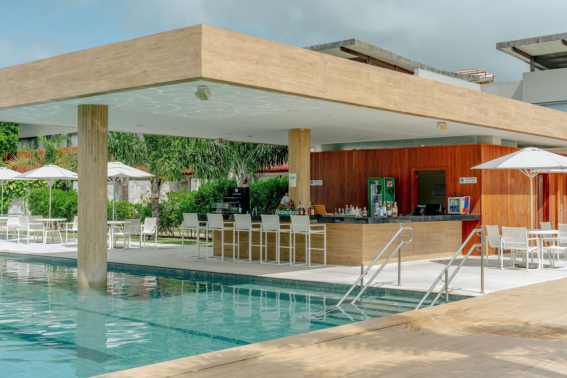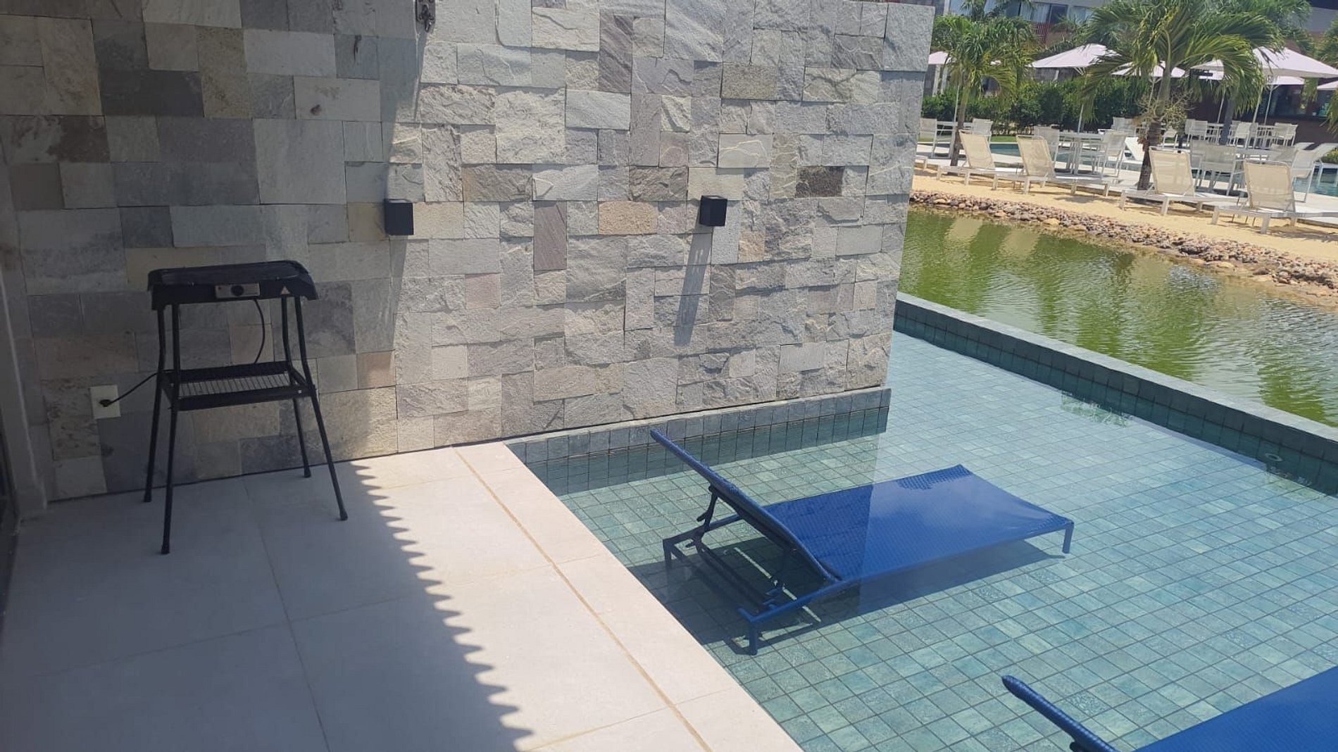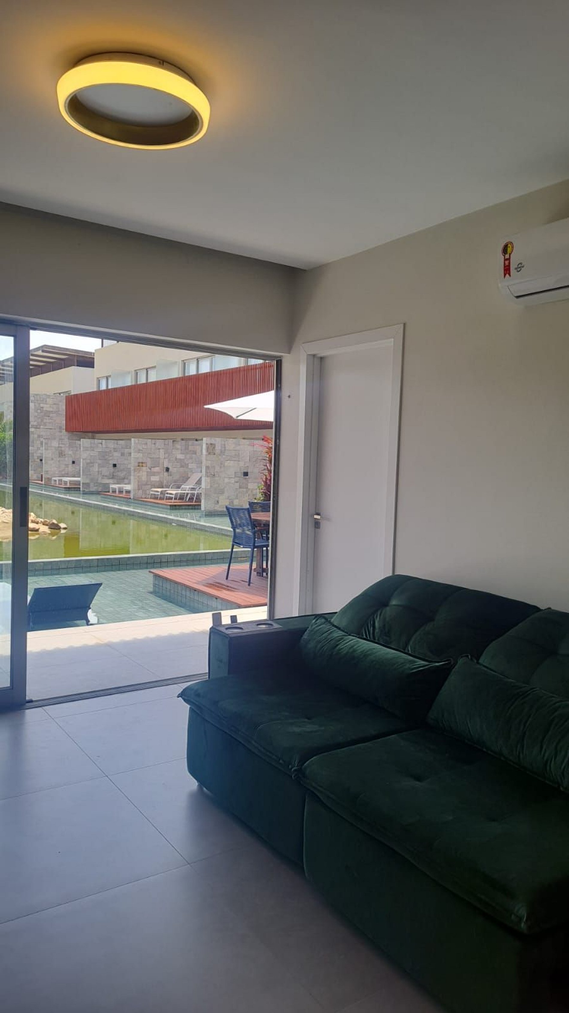 Varanda com vista para a piscina do condomínio.