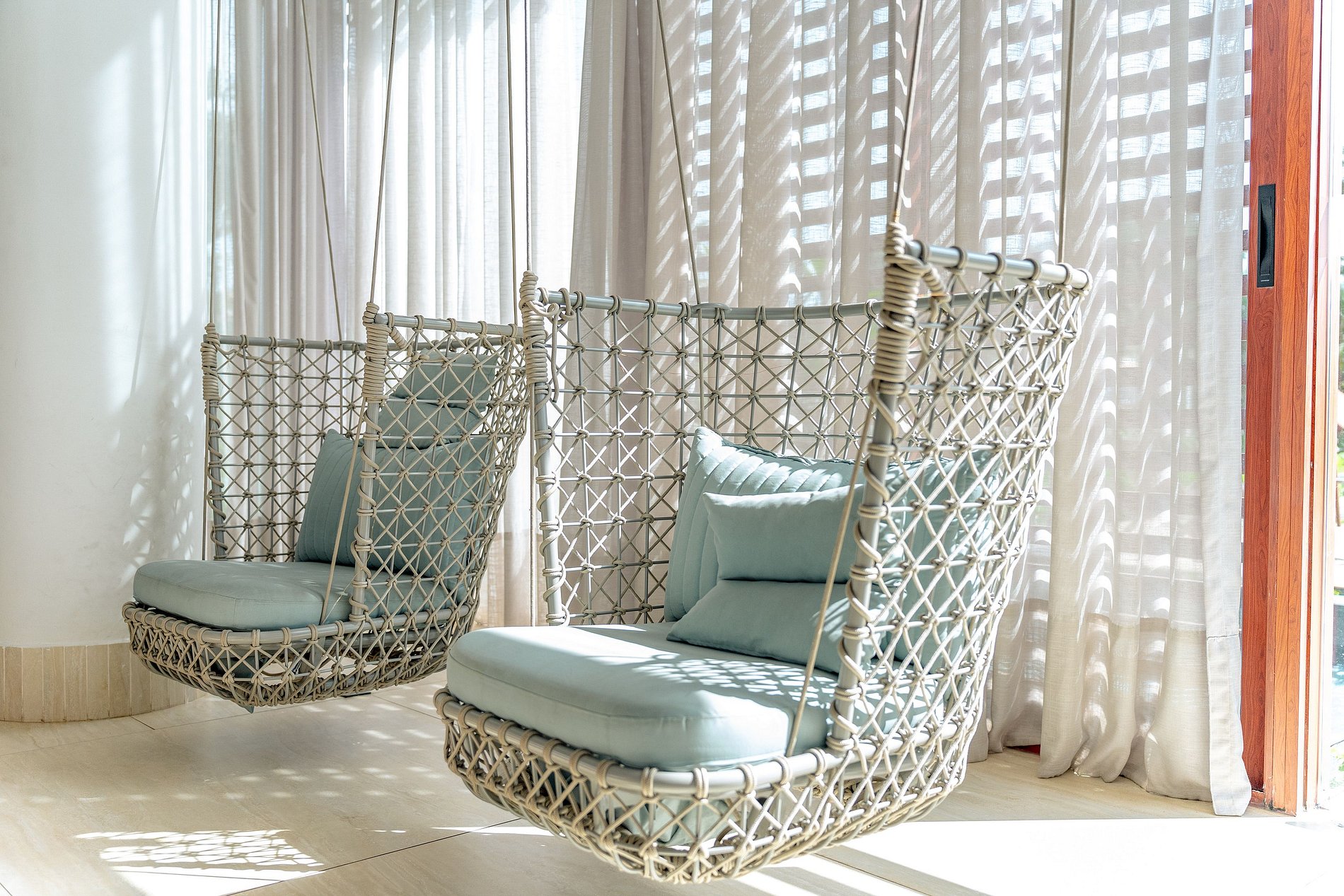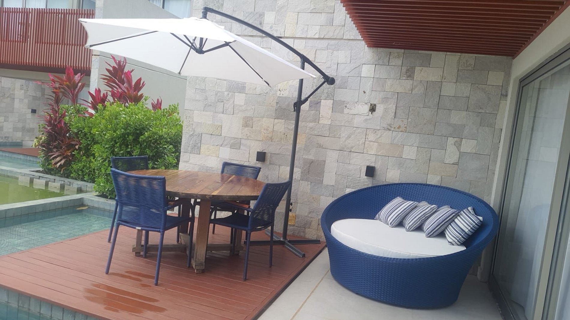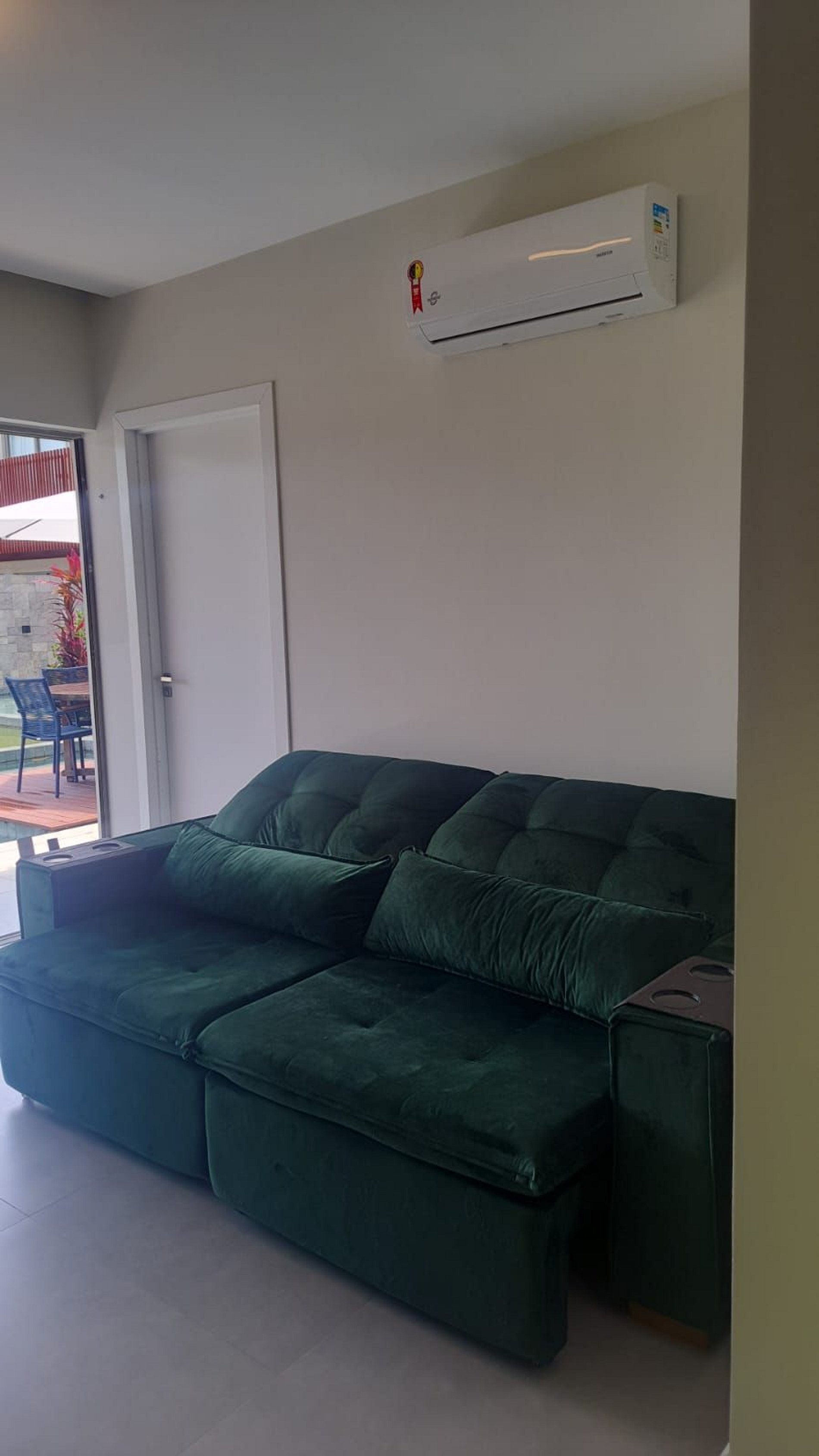 Varanda com vista para a piscina do condomínio.