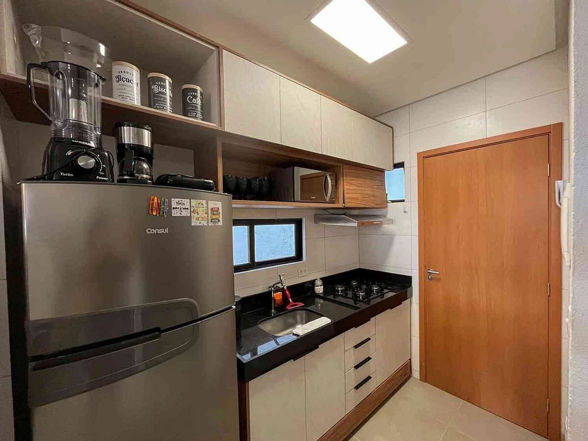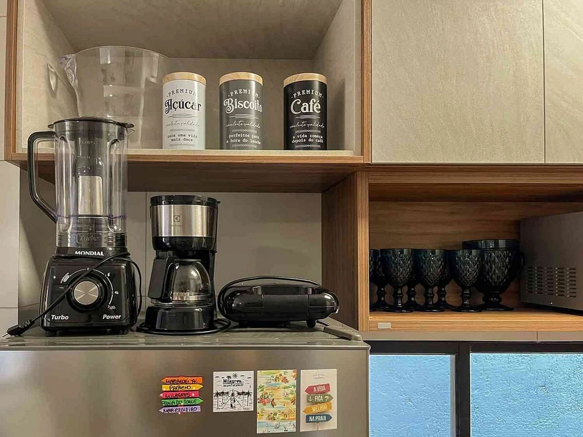 Cozinha americana completa: Equipada com fogão, geladeira, microondas, liquidificador, torradeira, cafeteira elétrica, bebedouro e utensílios básicos para preparo de refeições