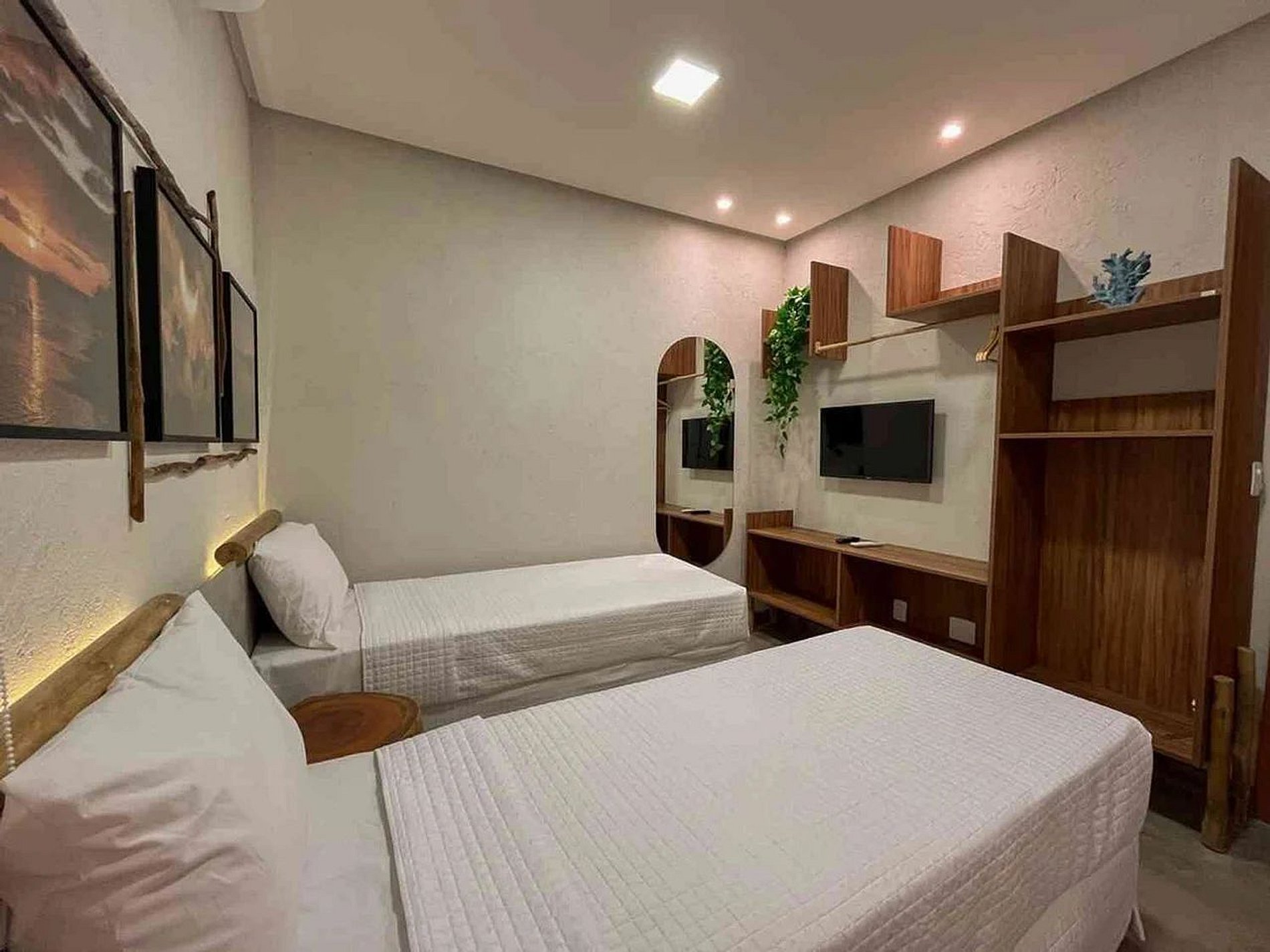 01 suíte com 02 camas de solteiro, TV, ar-condicionado e armário com cabides