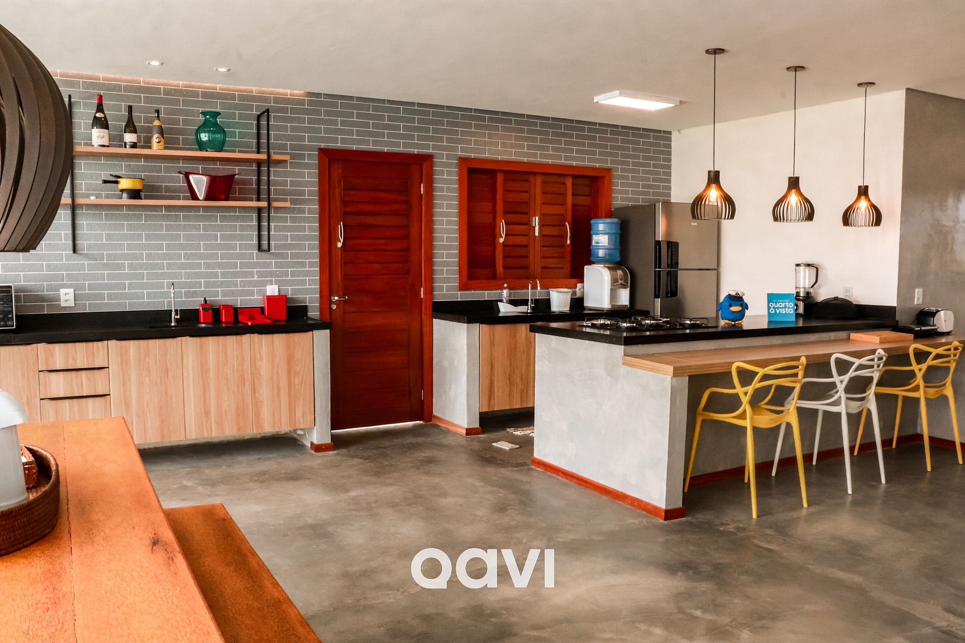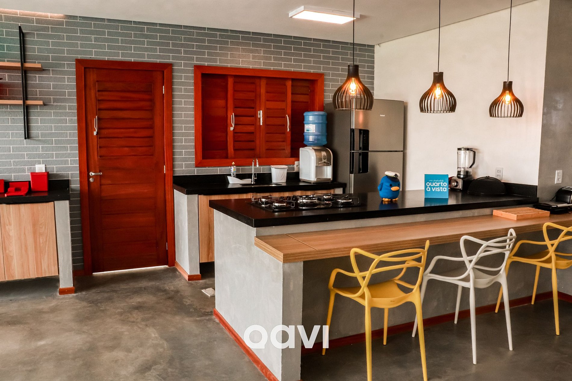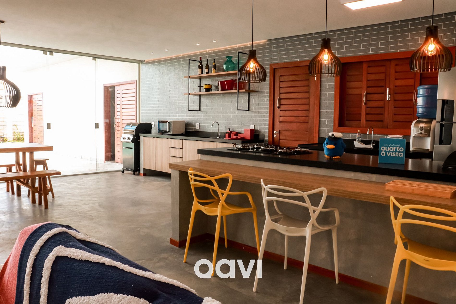 A cozinha é completa, com fogão cooktop 5 bocas, forno elétrico, duas pias, geladeira, gelágua, micro-ondas, torradeira, grill, liquidificador e todos os utensílios básicos para preparar refeições com praticidade.