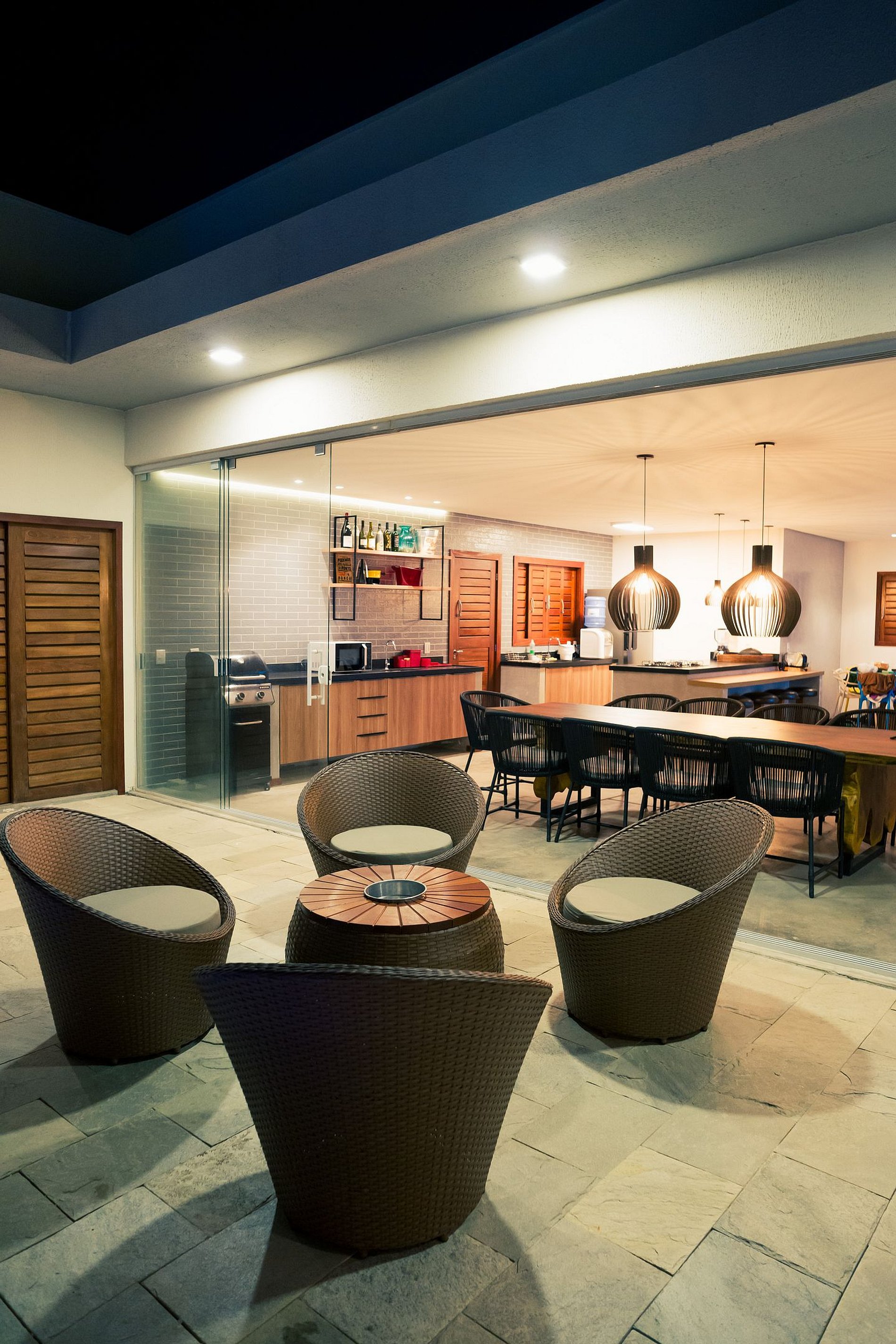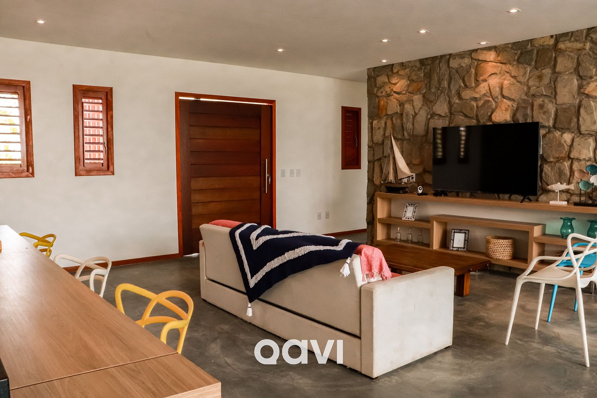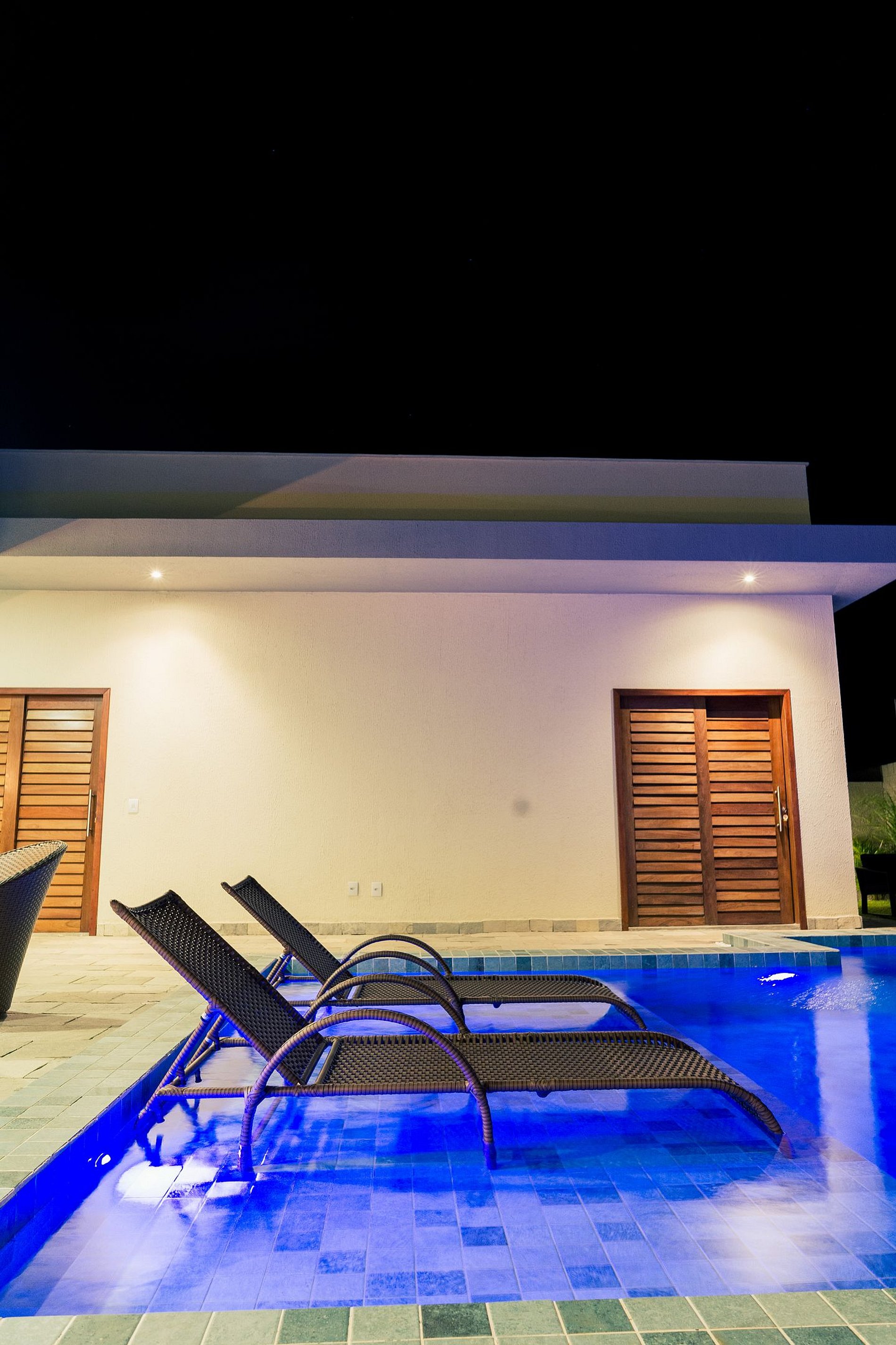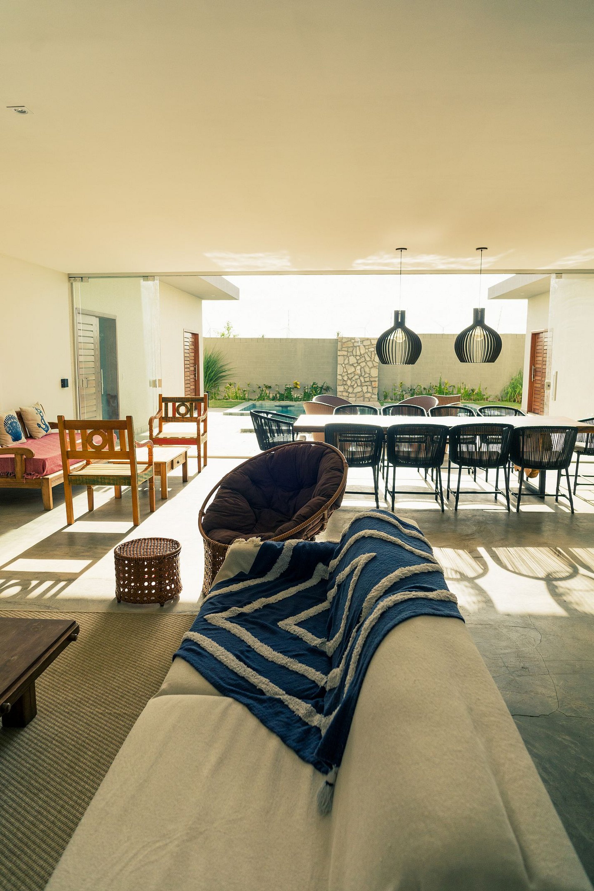 Na casa, o destaque é a piscina integrada à sala e cozinha, separada apenas por uma elegante cortina de vidro retrátil. Além de um ambiente amplo e moderno, com sofá, Smart TV, mesa de jantar em madeira maciça, mesa redonda com cadeiras, e bancada americana.