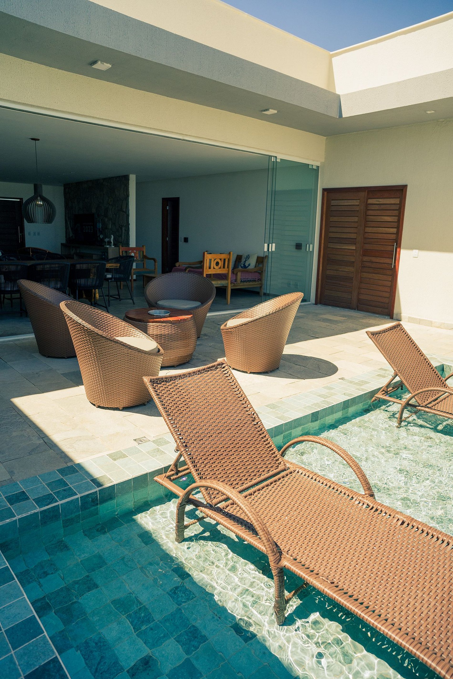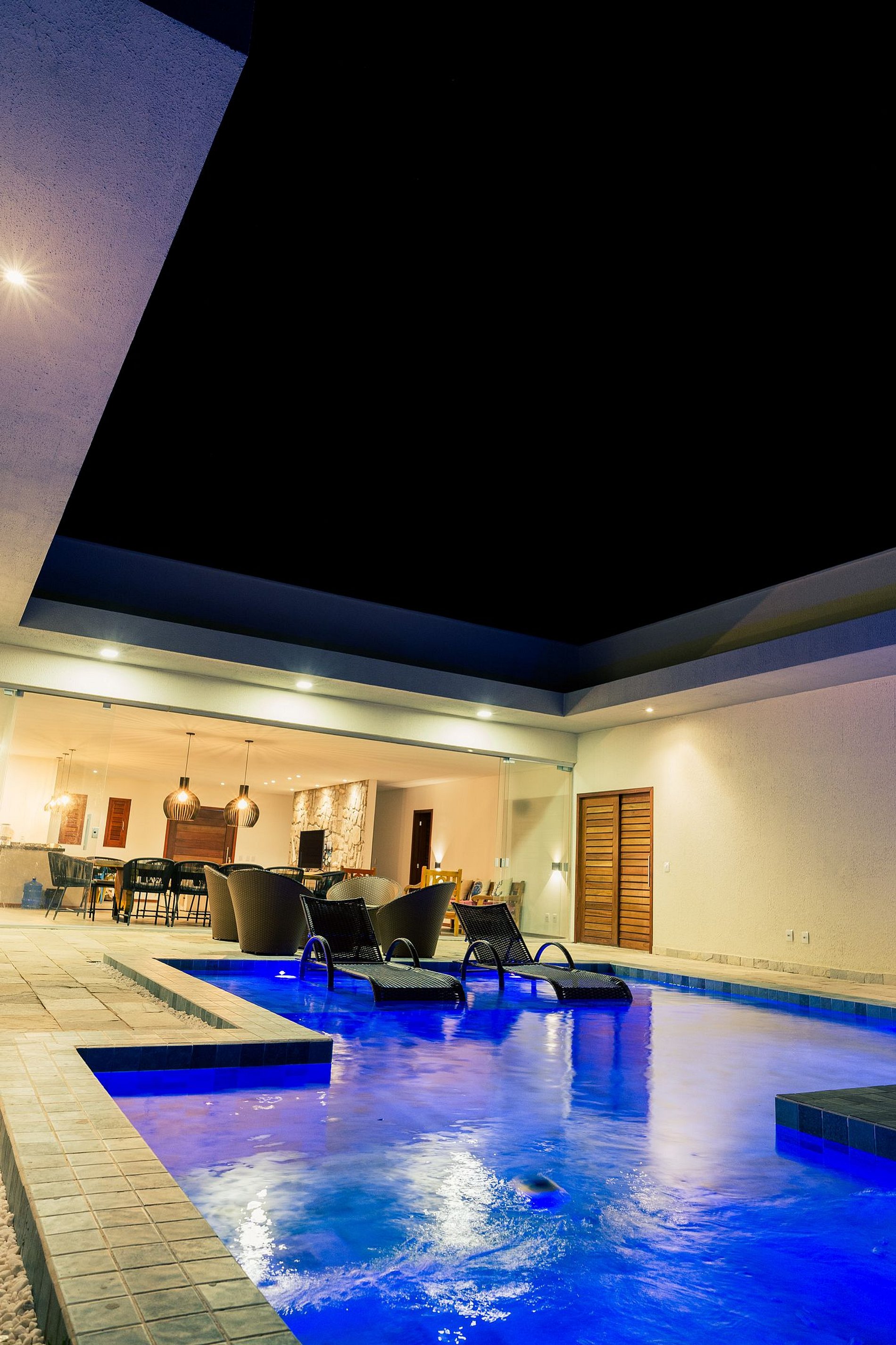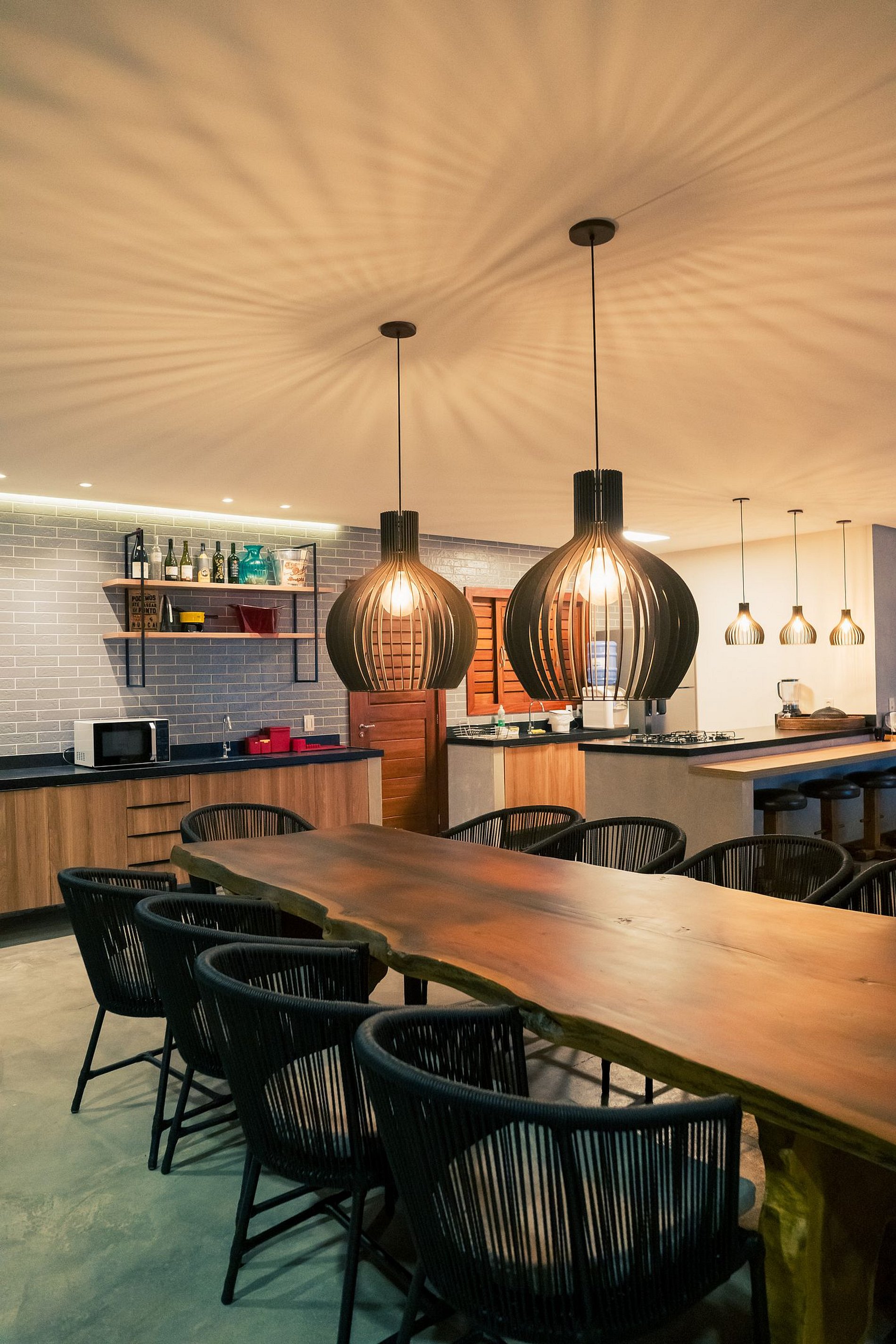 Na casa, o destaque é a piscina integrada à sala e cozinha, separada apenas por uma elegante cortina de vidro retrátil. Além de um ambiente amplo e moderno, com sofá, Smart TV, mesa de jantar em madeira maciça, mesa redonda com cadeiras, e bancada americana.