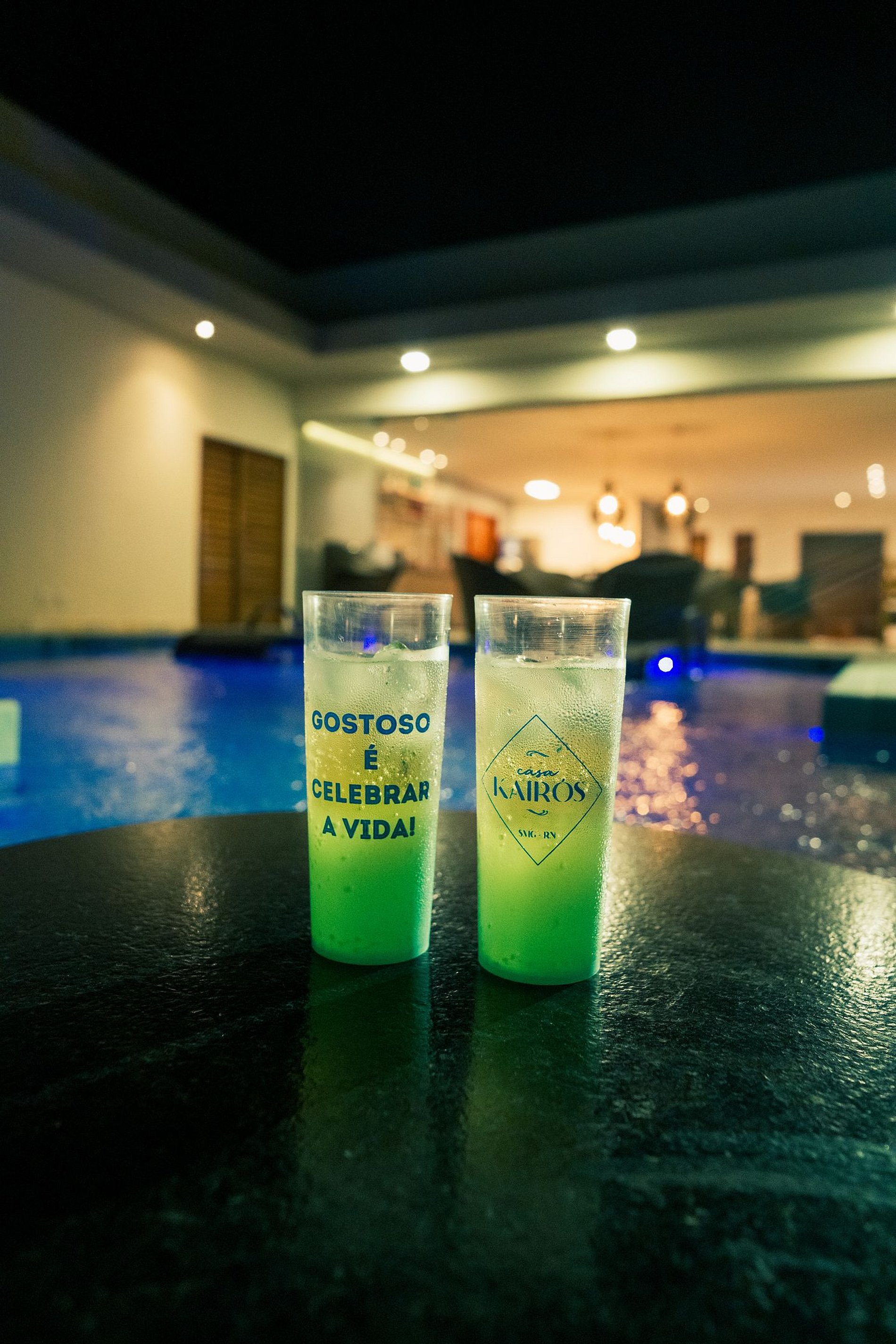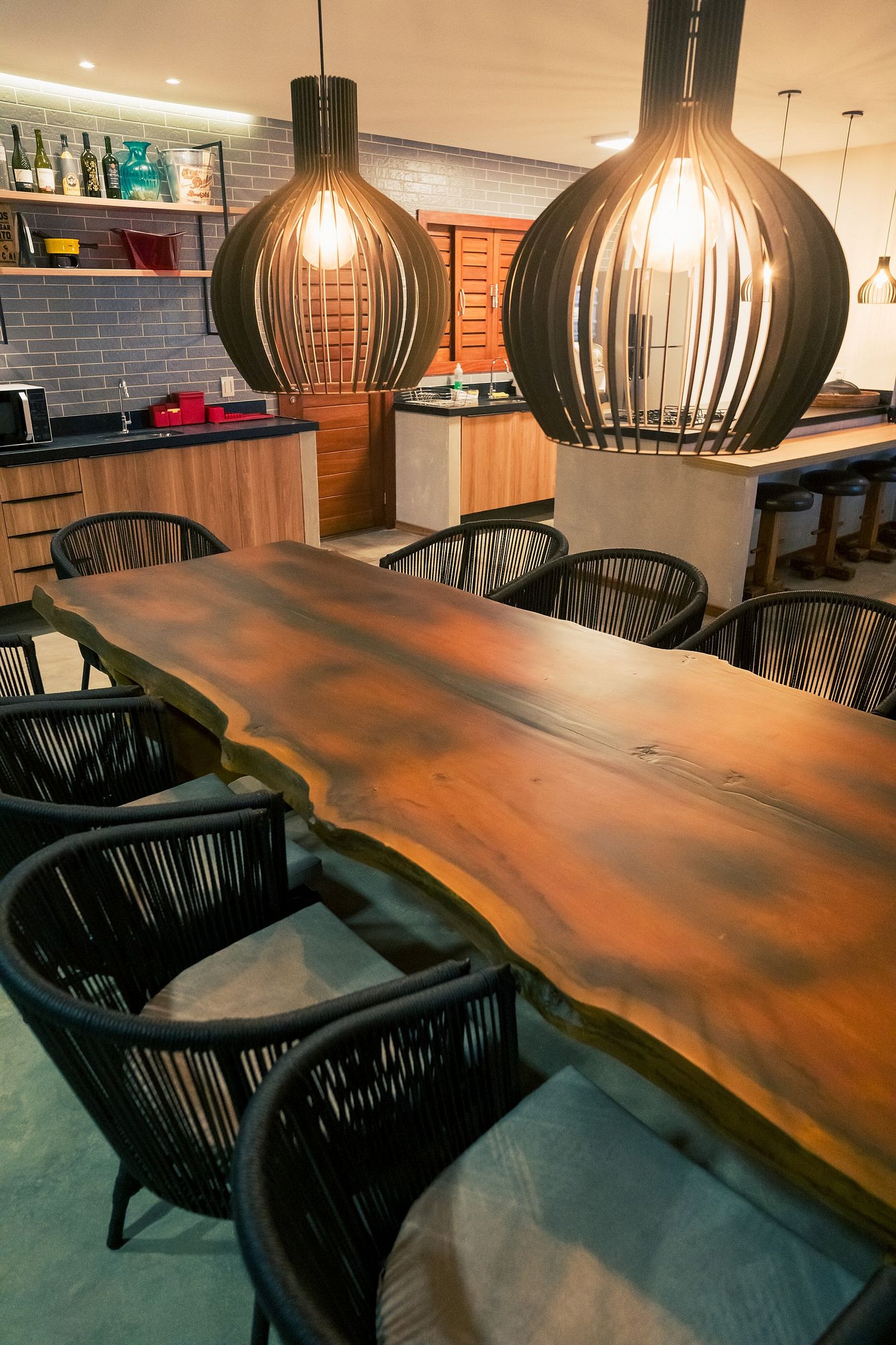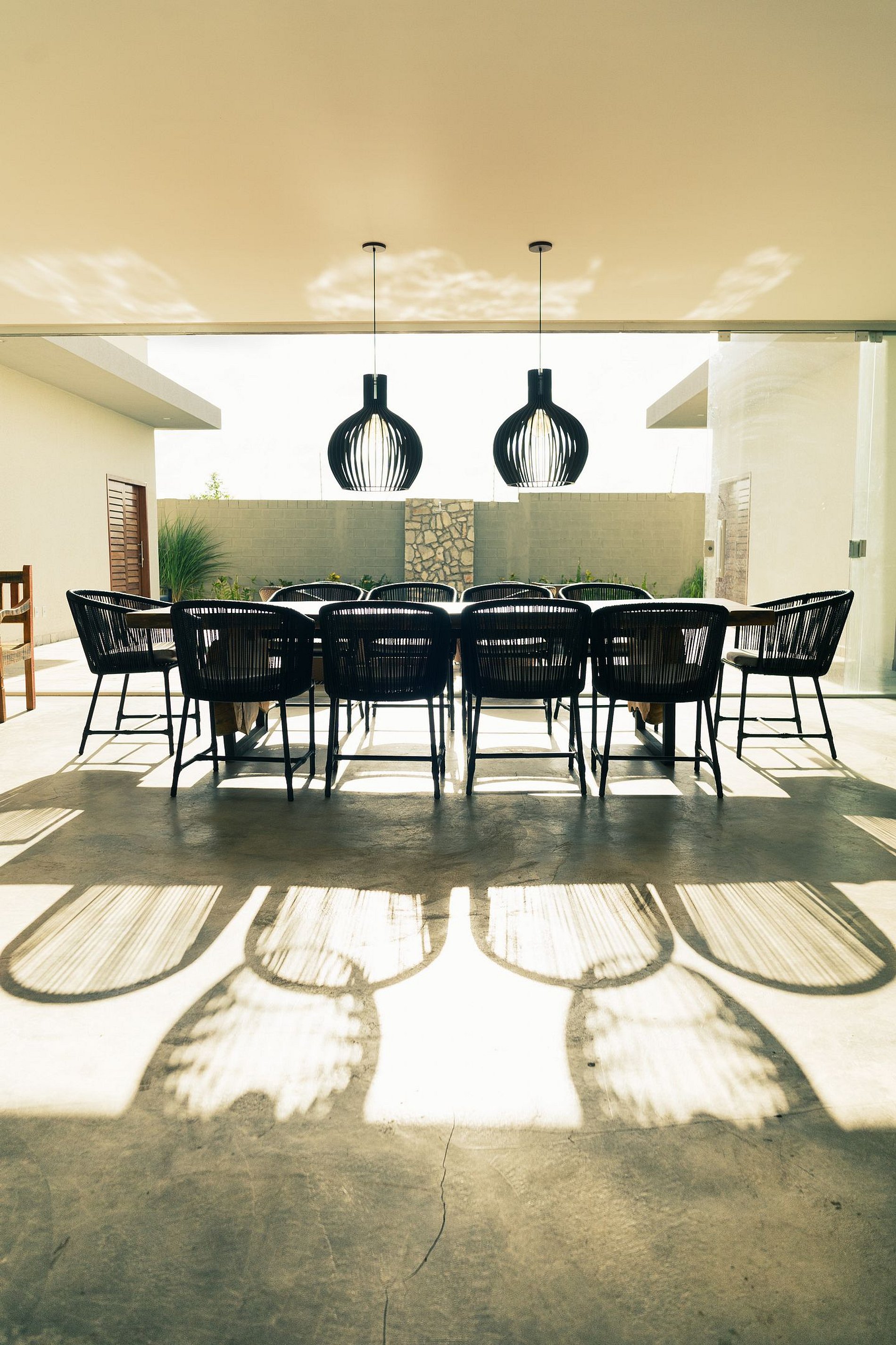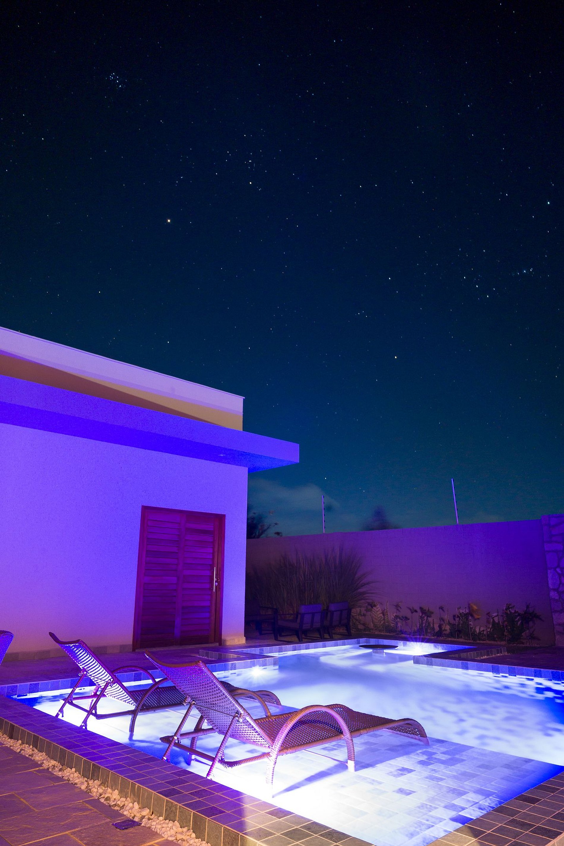 Na casa, o destaque é a piscina integrada à sala e cozinha, separada apenas por uma elegante cortina de vidro retrátil. Além de um ambiente amplo e moderno, com sofá, Smart TV, mesa de jantar em madeira maciça, mesa redonda com cadeiras, e bancada americana.