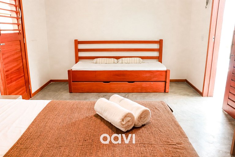 A casa possui 5 suítes climatizadas, todas com cama queen, frigobar, Smart TV, guarda-roupas e banheiro privativo. Duas das suítes contam ainda com bicama adicional, acomodando confortavelmente famílias e grupos maiores. Lençóis, toalhas e enxoval básico estão inclusos. Quatro suítes dispõem de redes para descanso.
