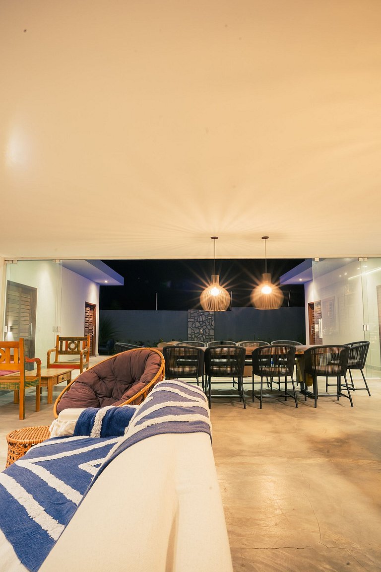 Na casa, o destaque é a piscina integrada à sala e cozinha, separada apenas por uma elegante cortina de vidro retrátil. Além de um ambiente amplo e moderno, com sofá, Smart TV, mesa de jantar em madeira maciça, mesa redonda com cadeiras, e bancada americana.