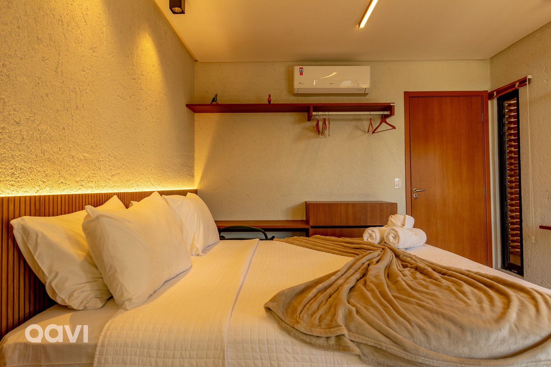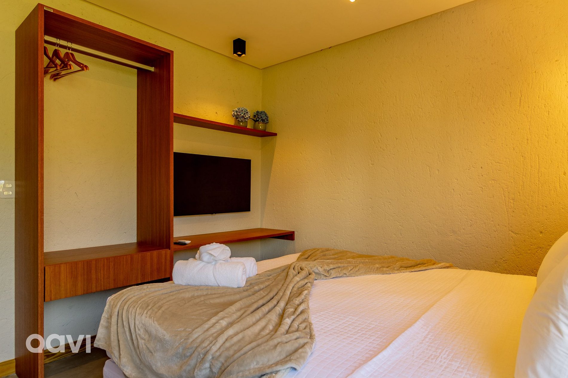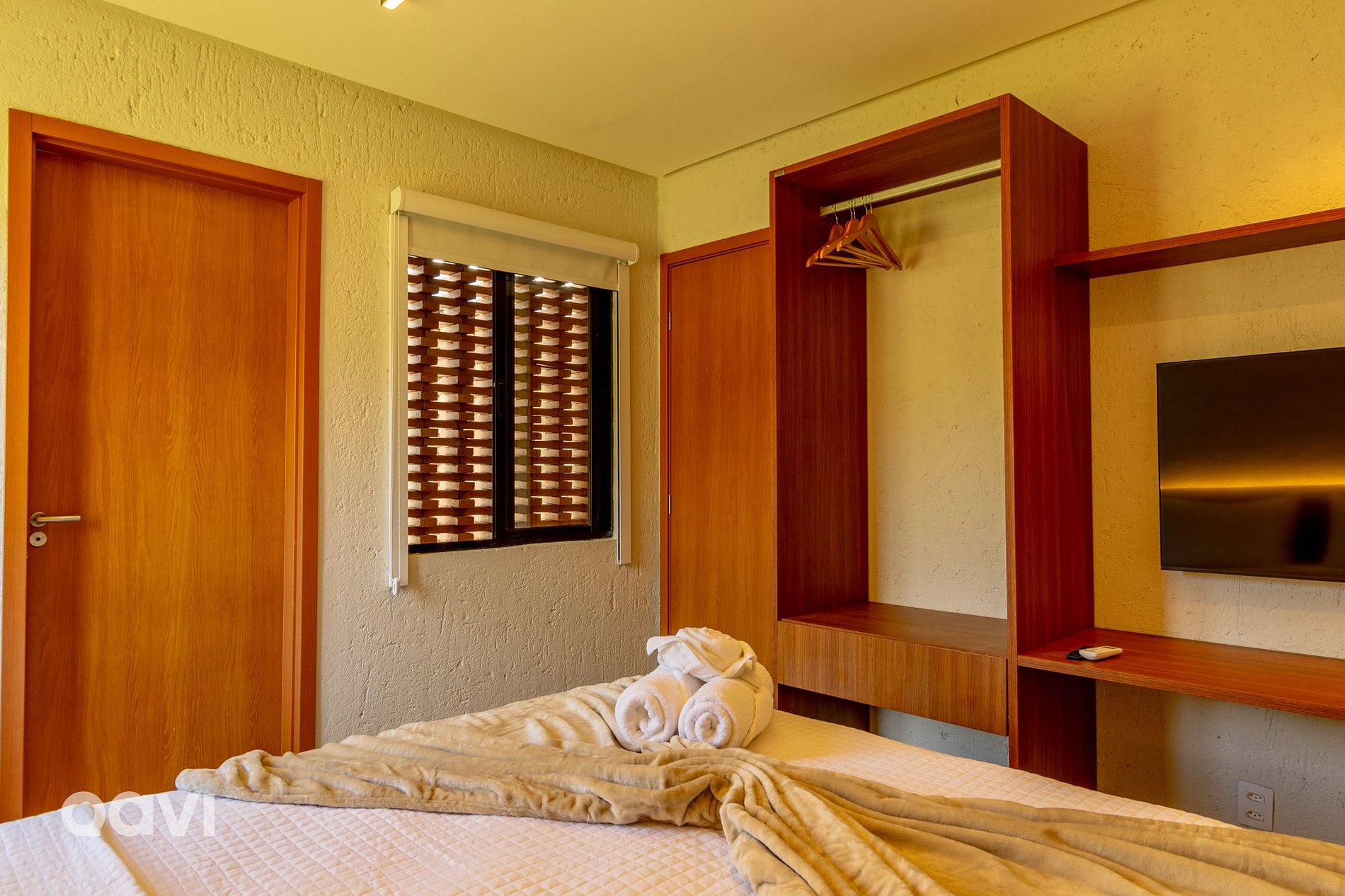 • Suíte 1: Uma cama de casal + 1 solteiro auxiliar, ar-condicionado, TV Smart, armário e blackout nas cortinas;