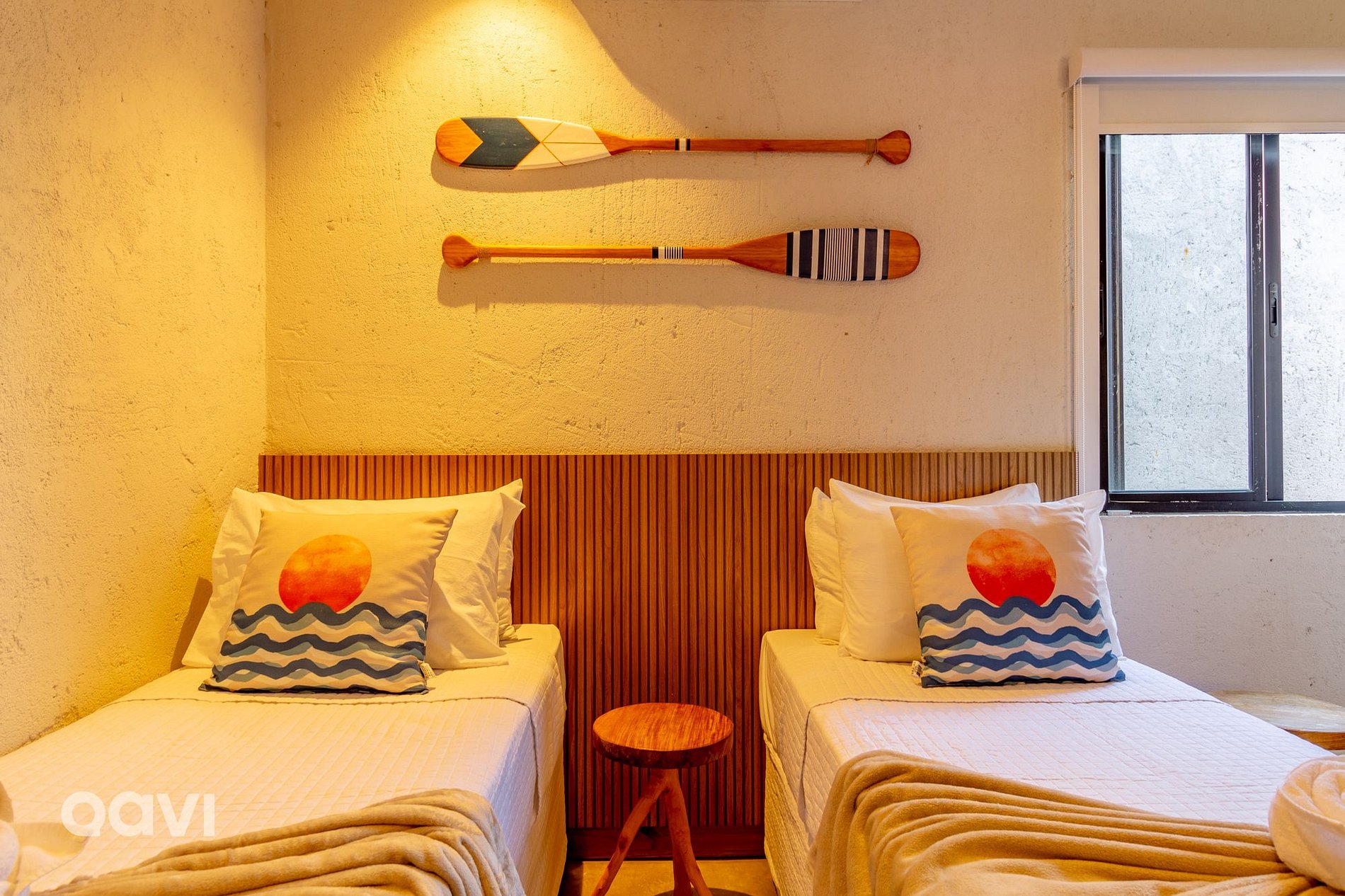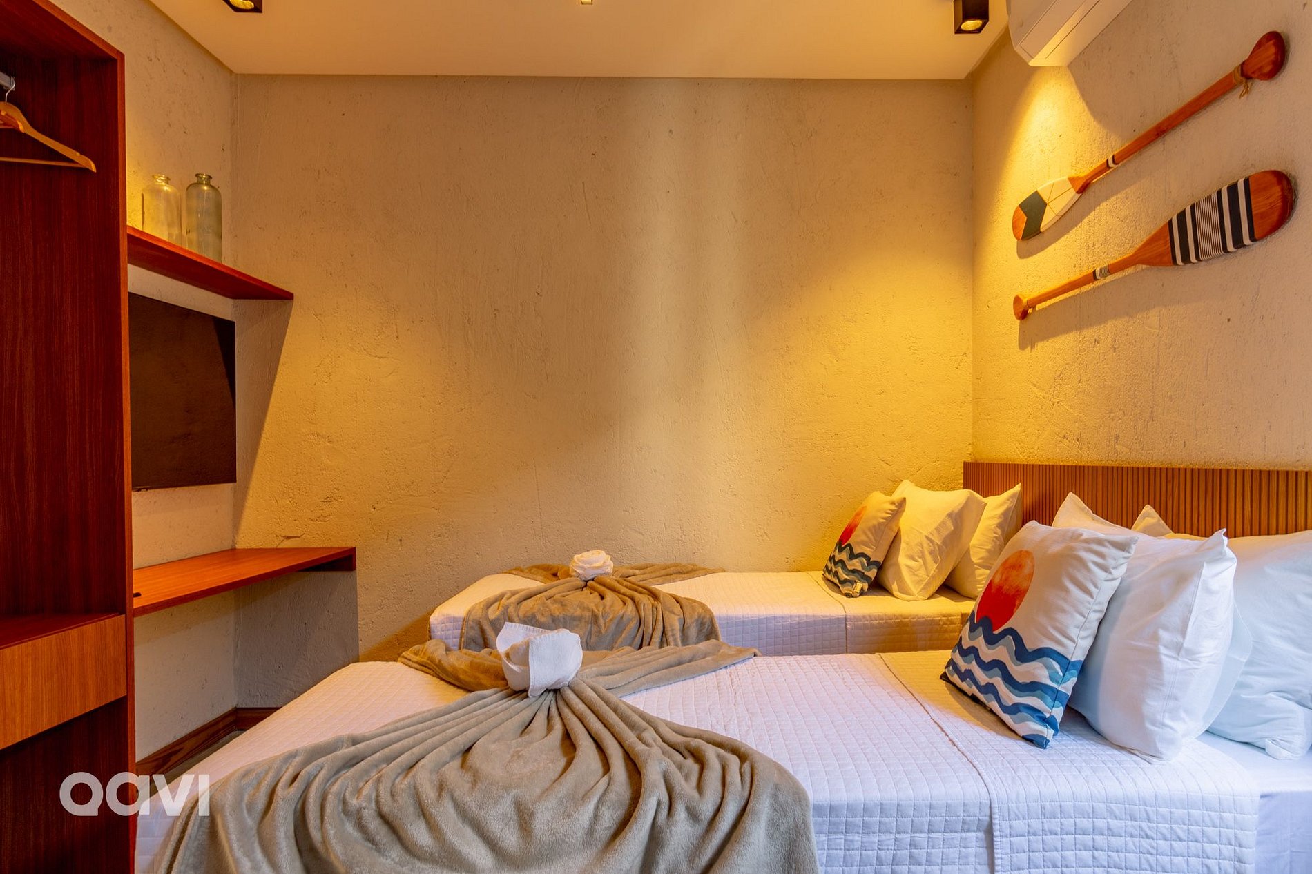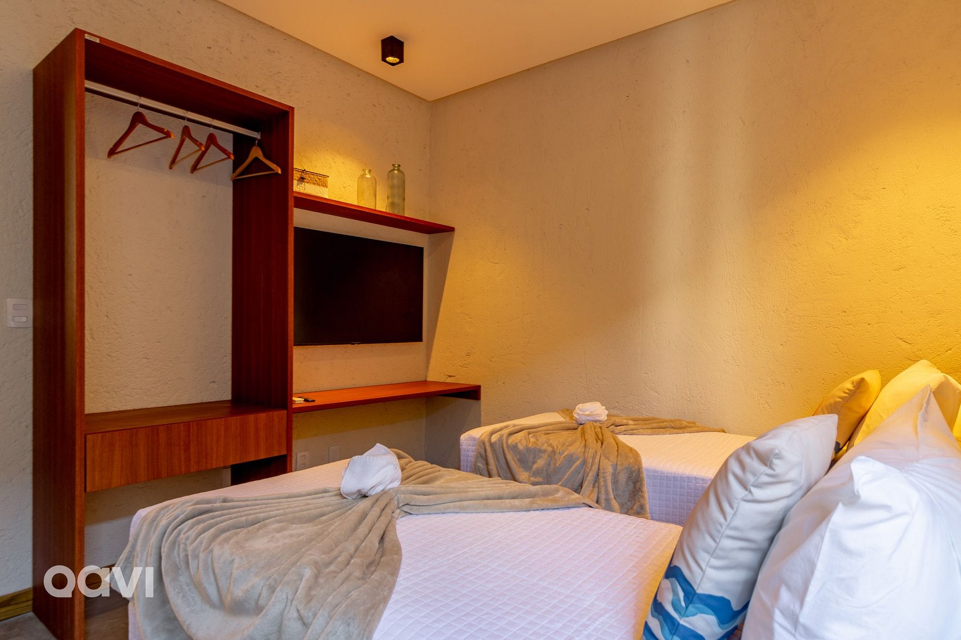 • Suíte 3: Duas camas de solteiro, ar-condicionado, TV Smart, armário e blackout nas cortinas;