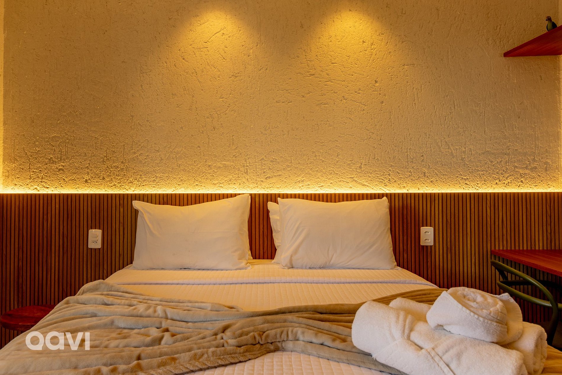 • Suíte 1: Uma cama de casal + 1 solteiro auxiliar, ar-condicionado, TV Smart, armário e blackout nas cortinas;