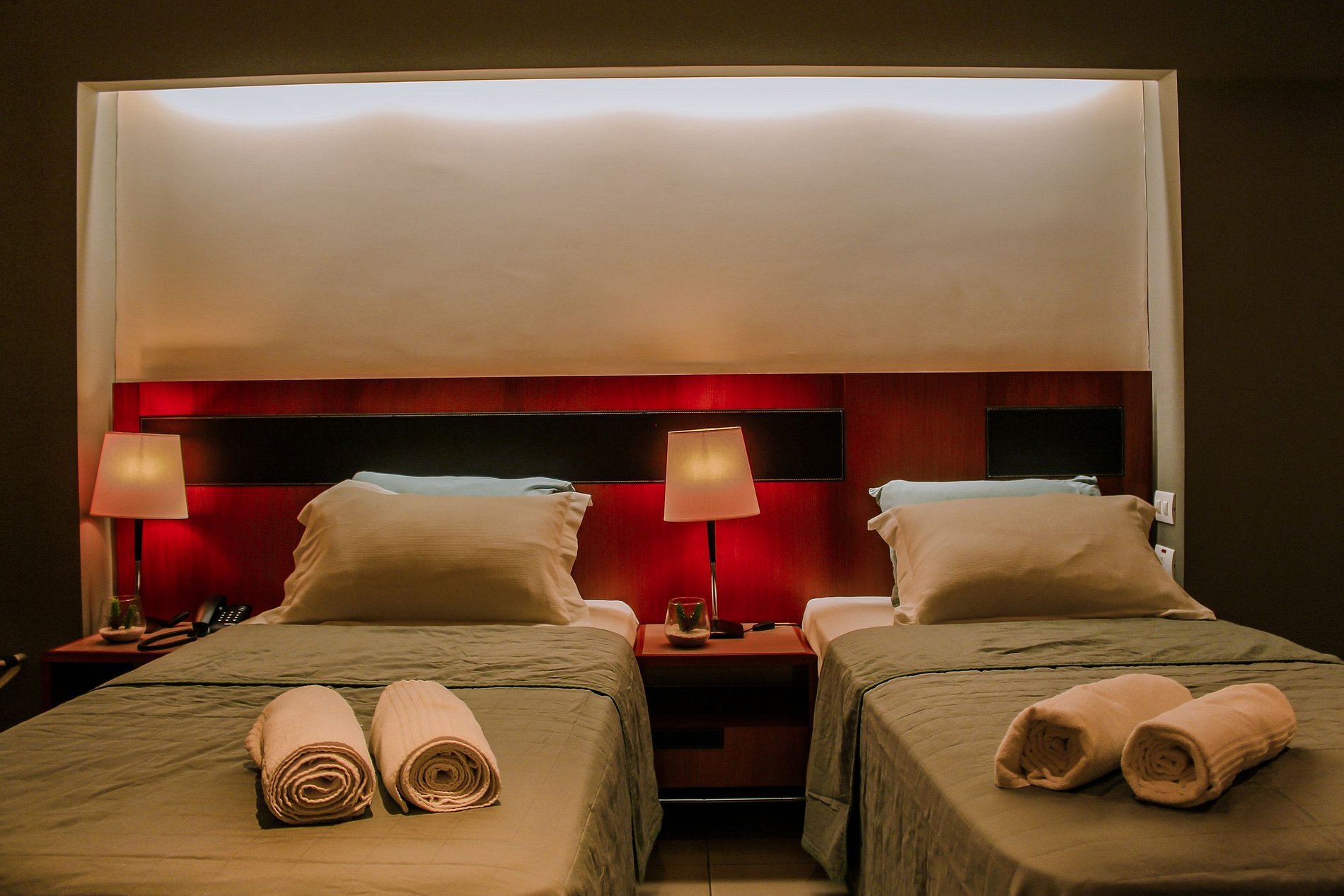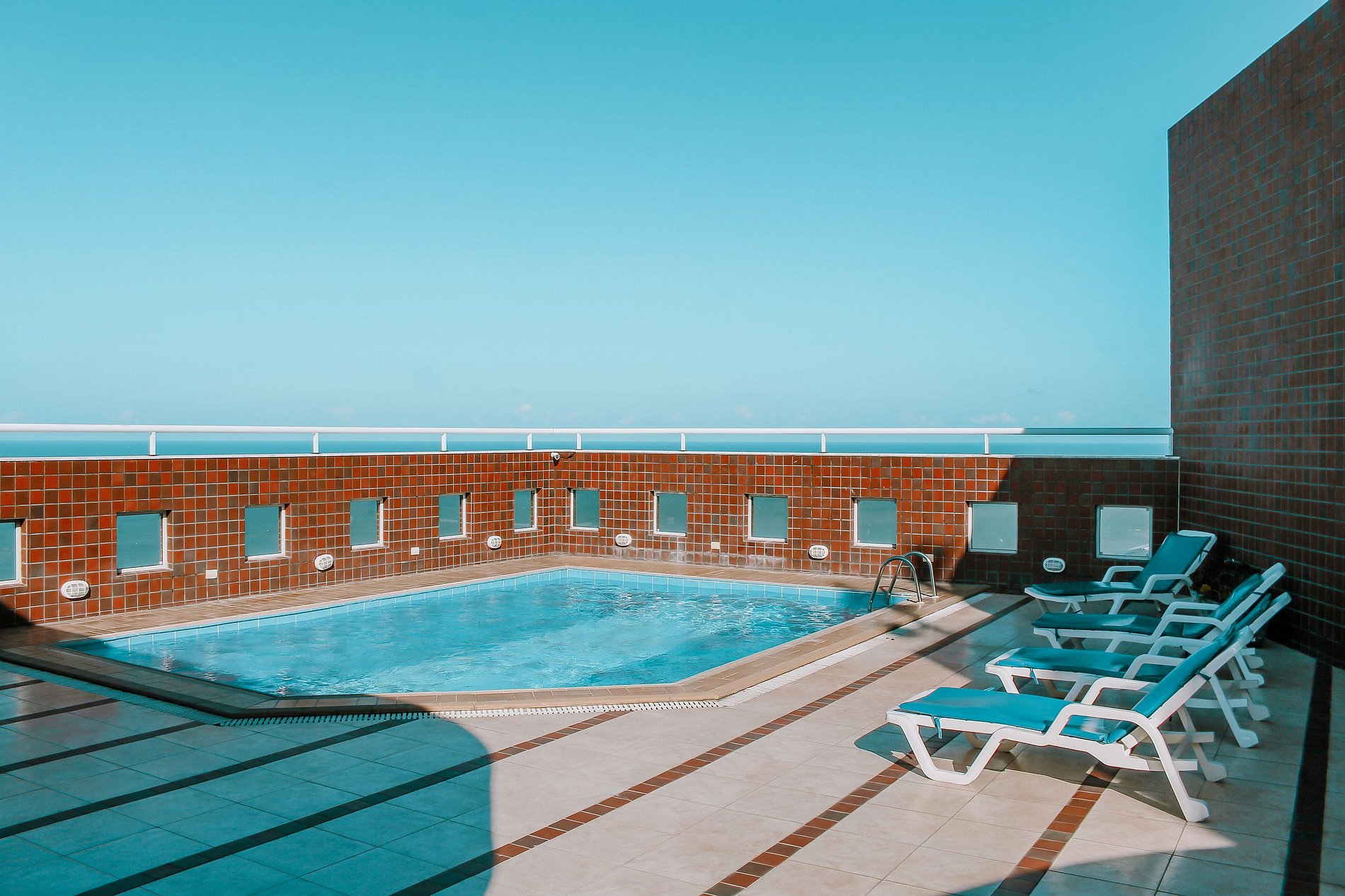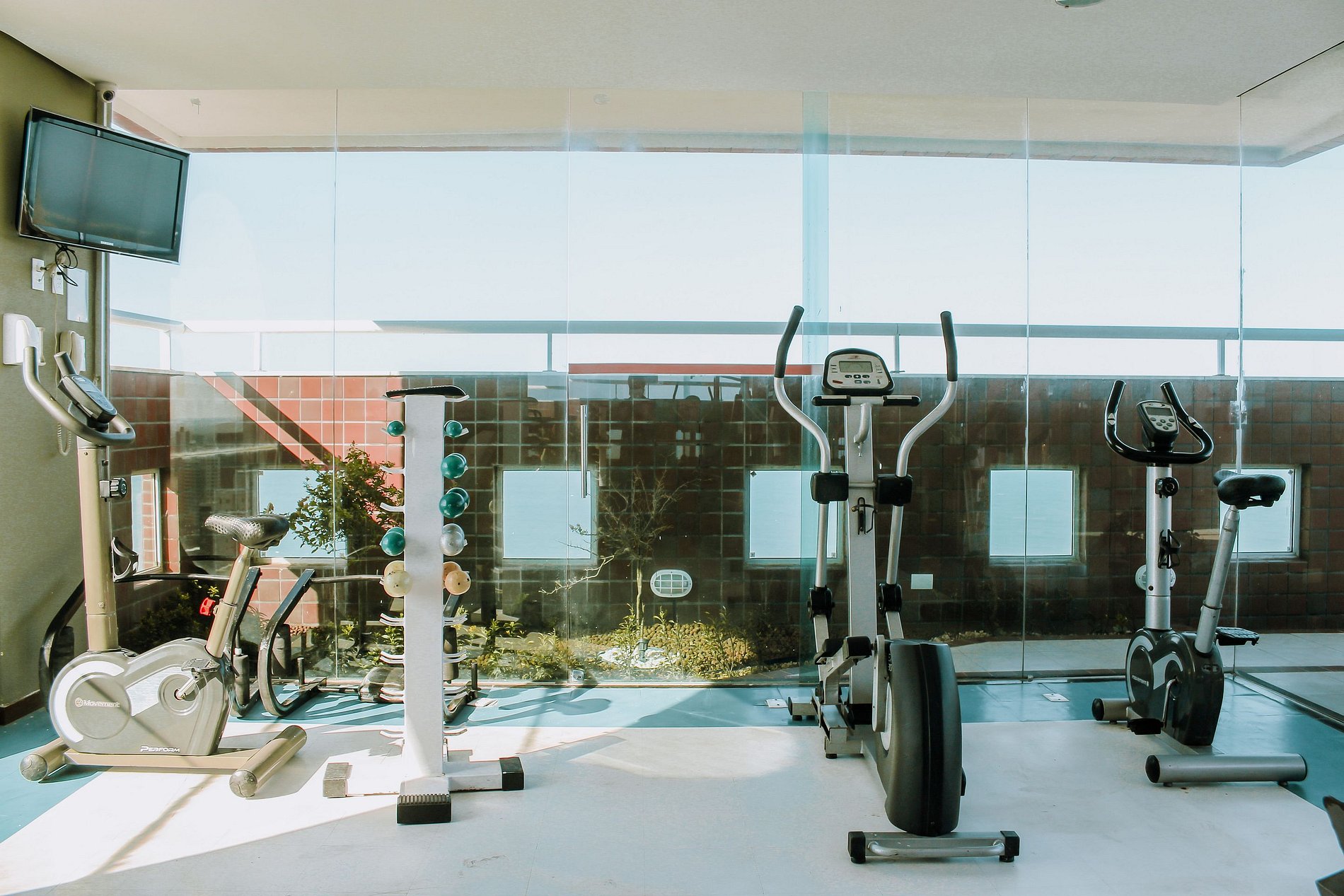 O quarto, com vista lateral para o mar, possui: cama de casal, frigobar, cofre pessoal, poltrona relaxante, cozinha compacta com mesa de apoio, mesa de jantar com 2 cadeiras, wifi, mesa de cabeceira com abajur, armário e cabides, ar-condicionado, banheiro com chuveiro quente e secador, TV com canais a cabo e interfone. .