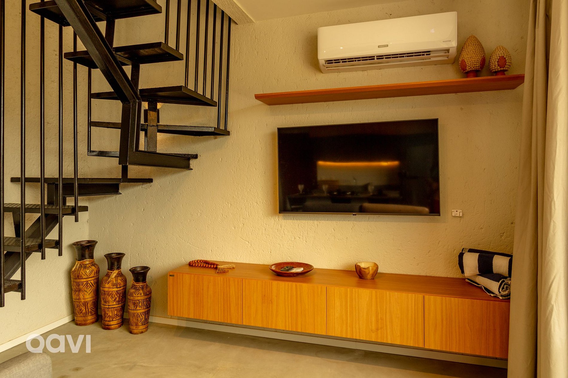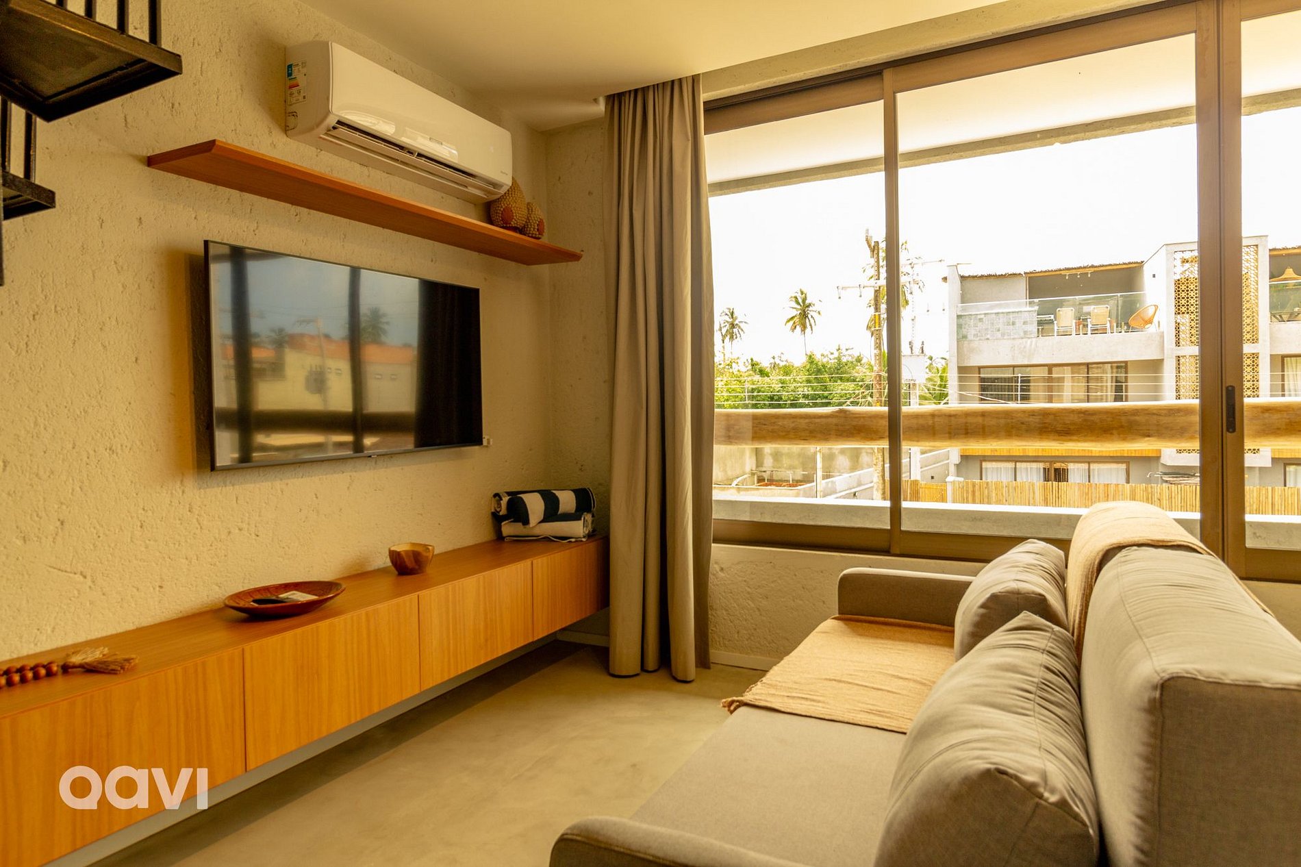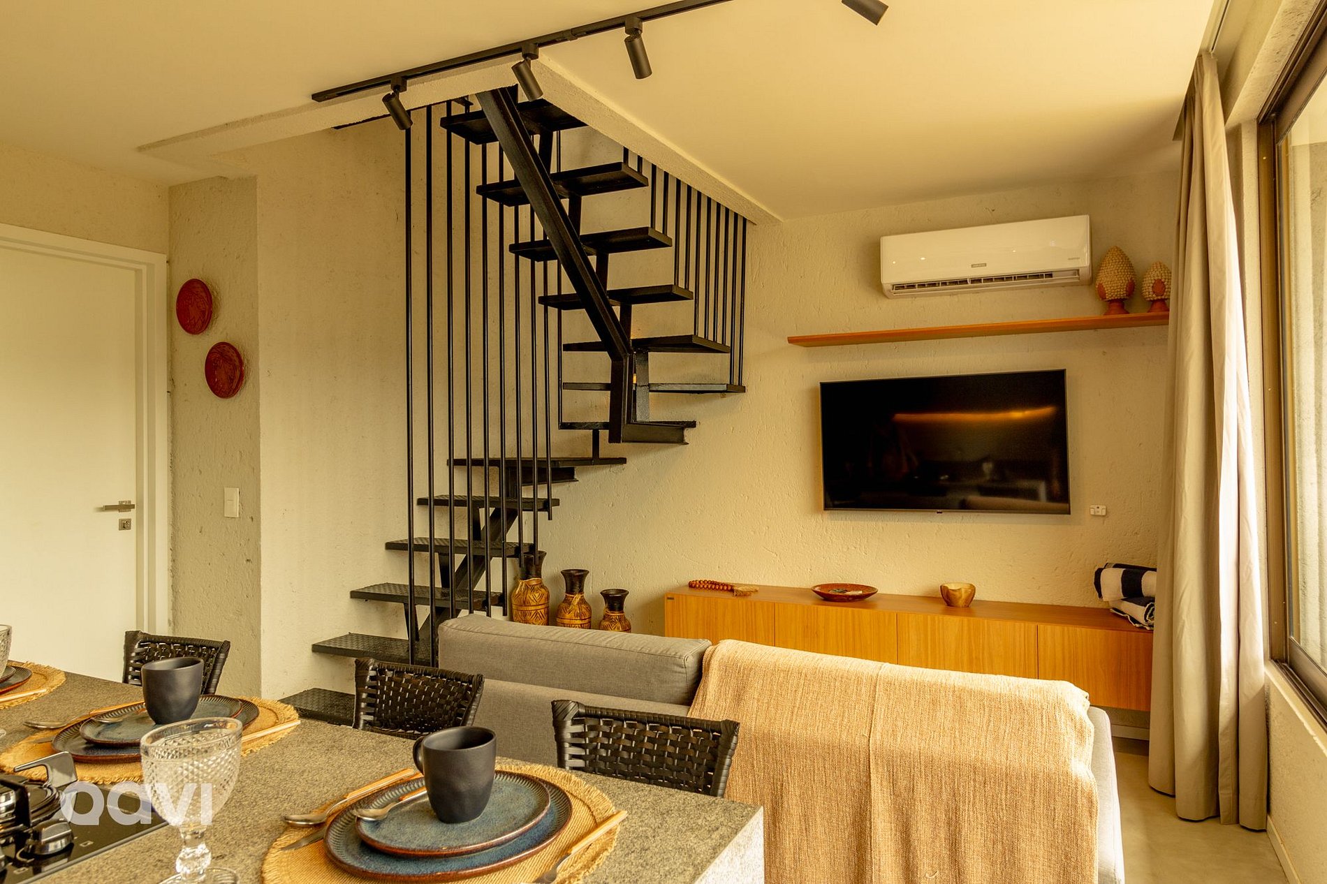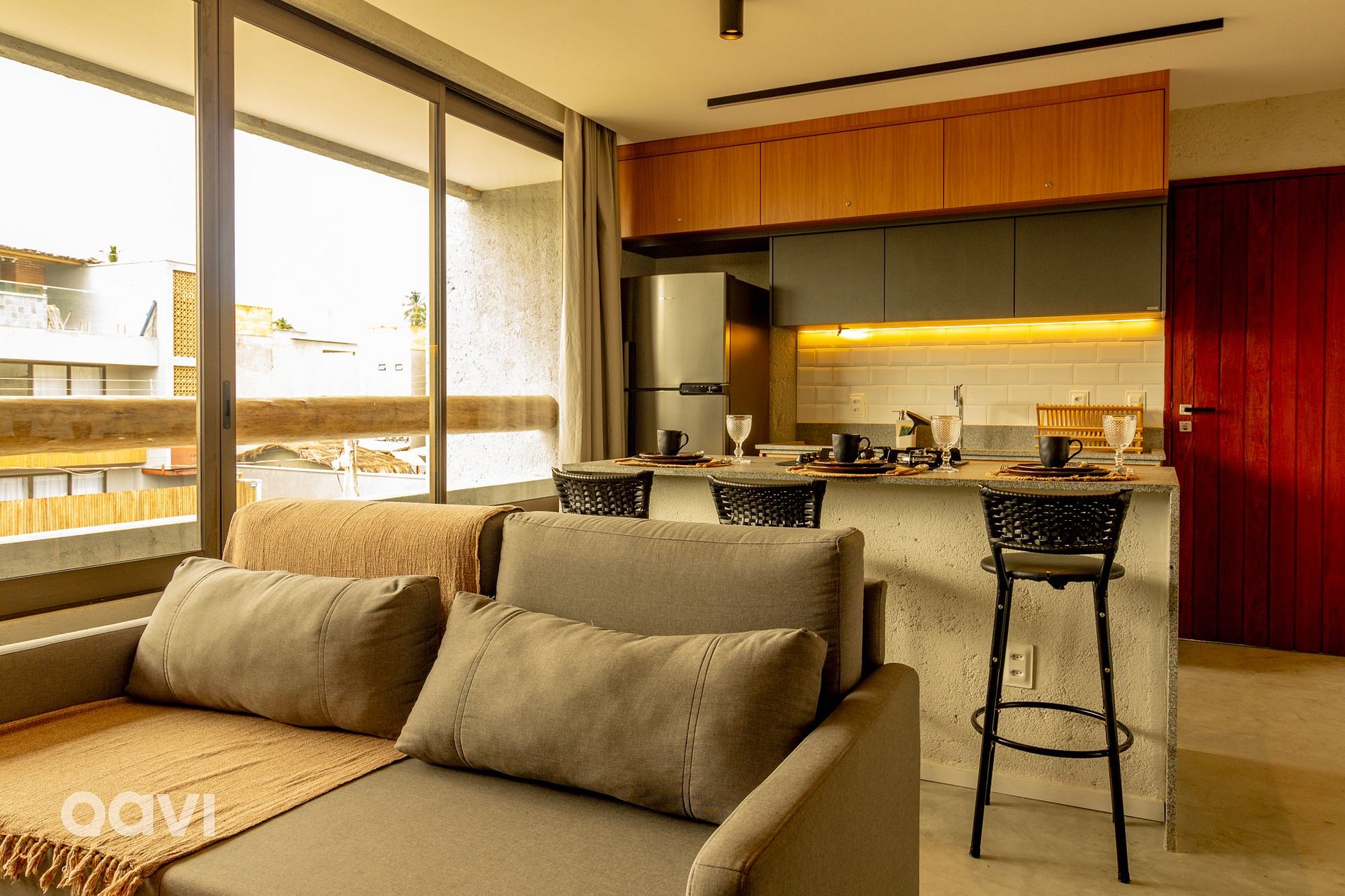• Sala: Espaço amplo com ambiente integrado, sofá-cama e televisão Smart, ilha para refeições e integração com a cozinha;