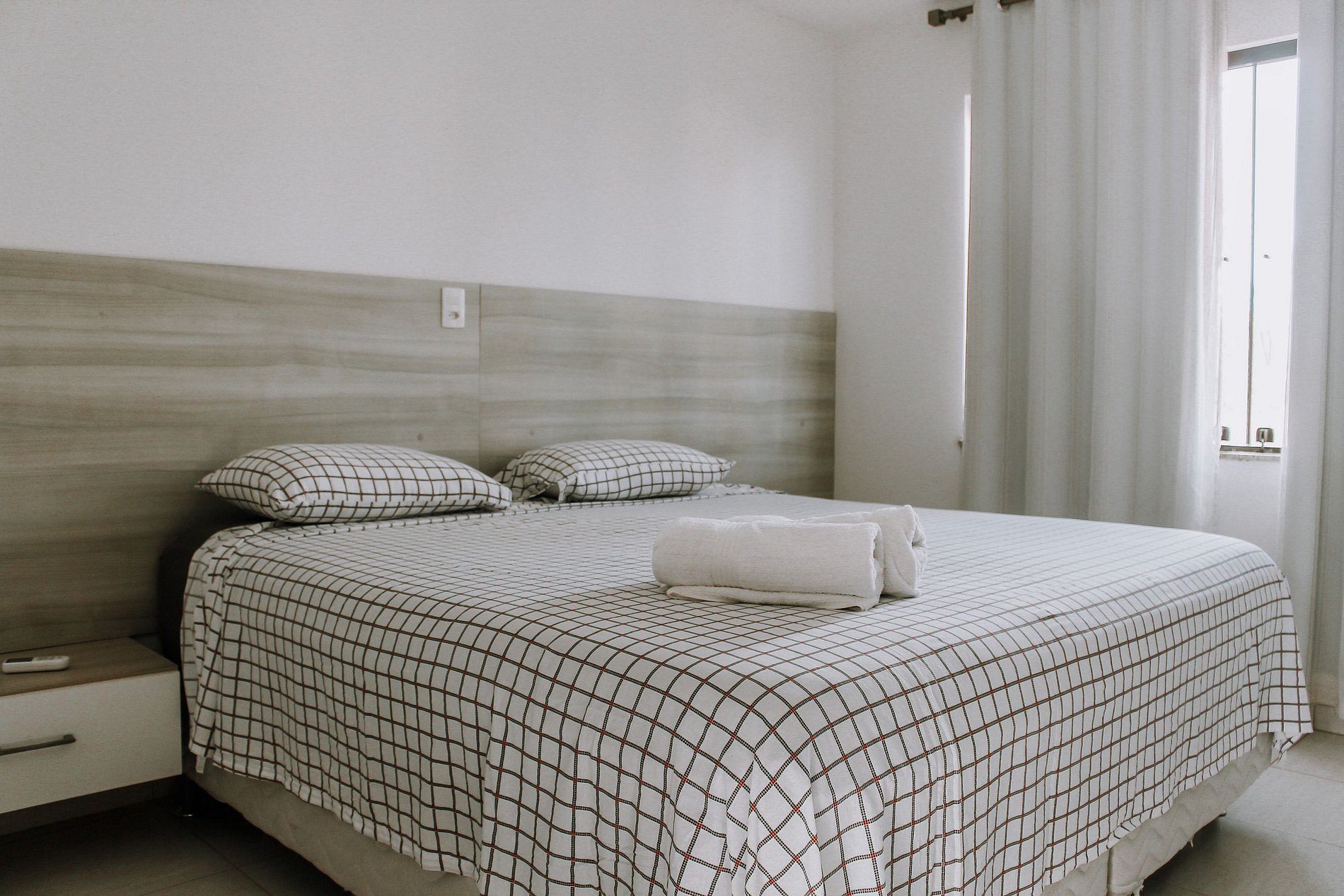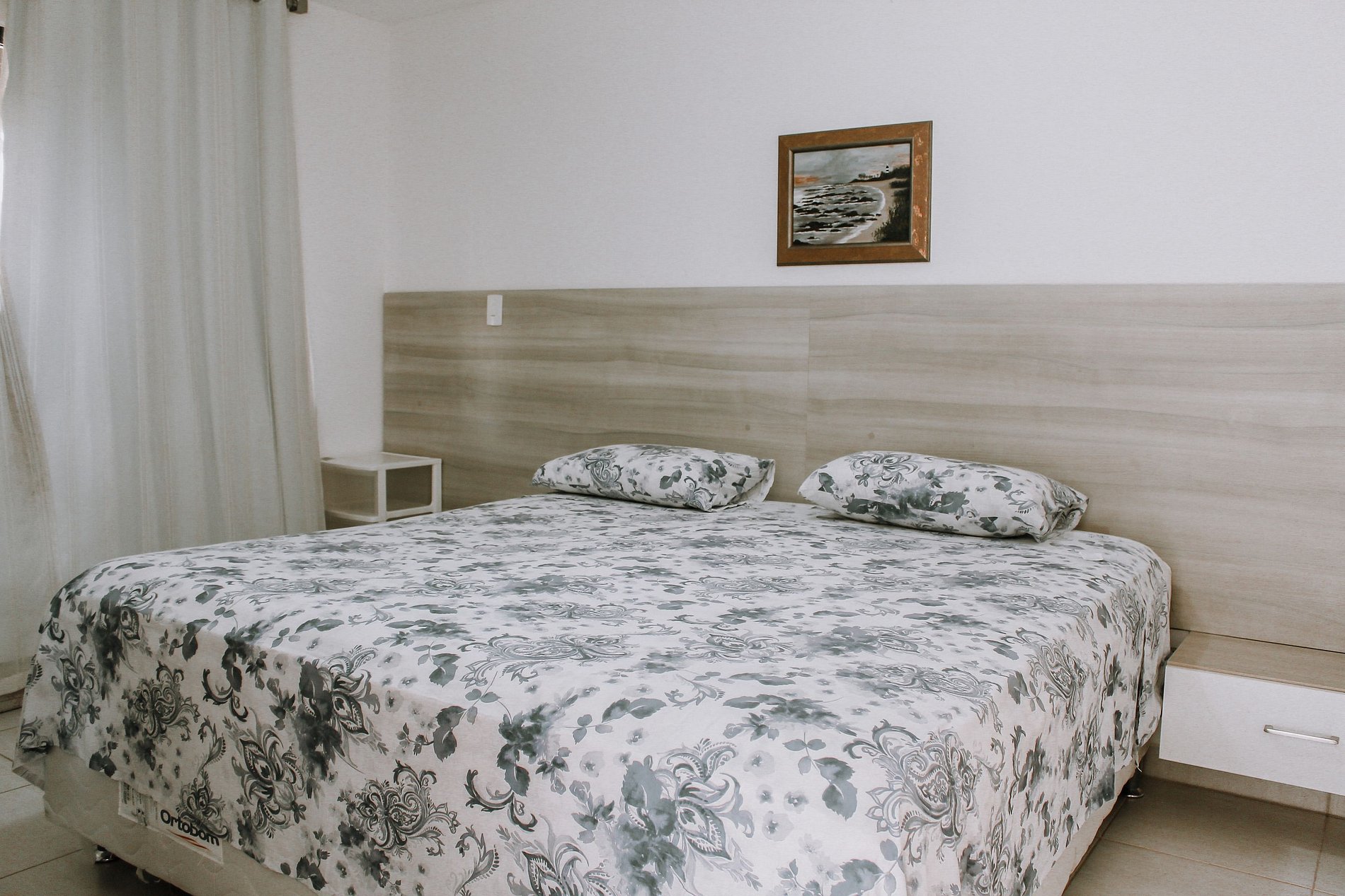 Suíte 1: Cama de casal king-size bem grande e super confortável, guarda-roupa, ar condicionado, ventilador, armário e duas mesas de cabeceira.