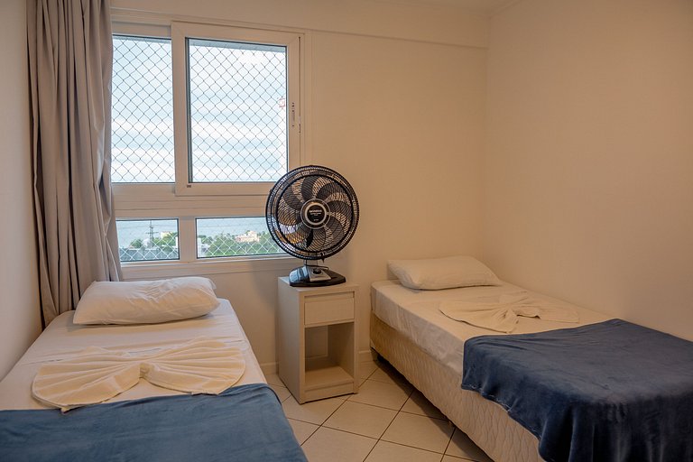 -Quarto 2: 2 camas de solteiro, mesa de cabeceira, ar-condicionado e guarda-roupa.