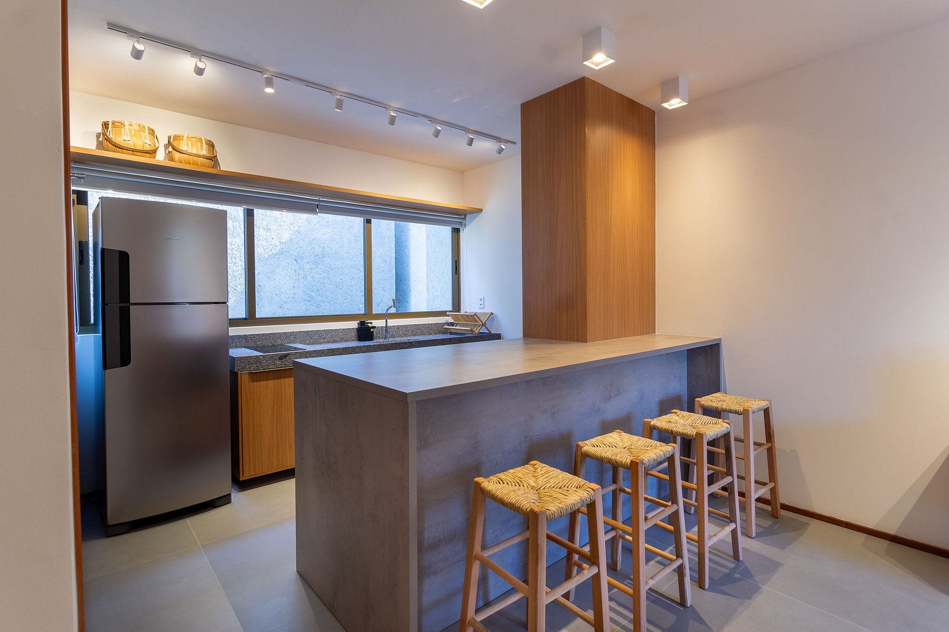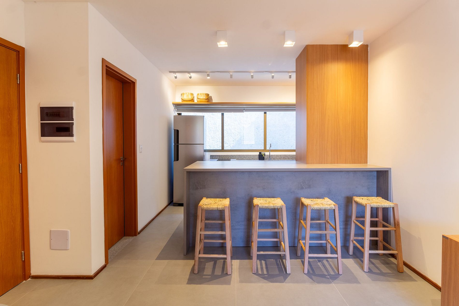Sala e cozinha integradas: O design aberto da sala e da cozinha promove um espaço arejado e perfeito para recepção de amigos e familiares.