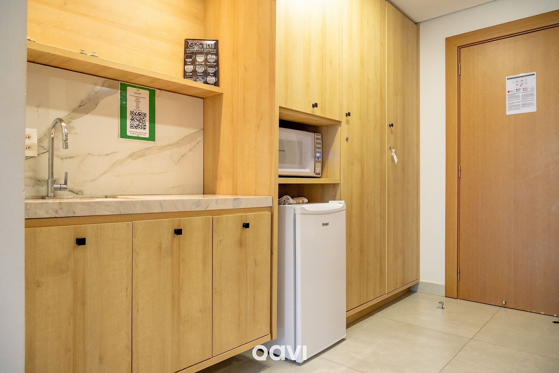 • Cozinha compacta e funcional (fogão elétrico, frigobar, micro-ondas, torradeira e utensílios básicos);