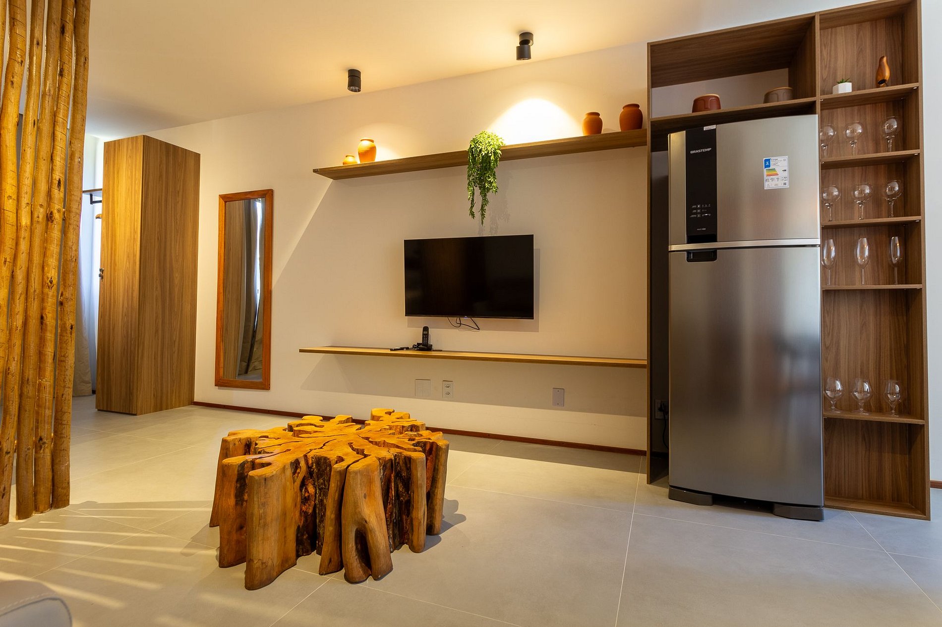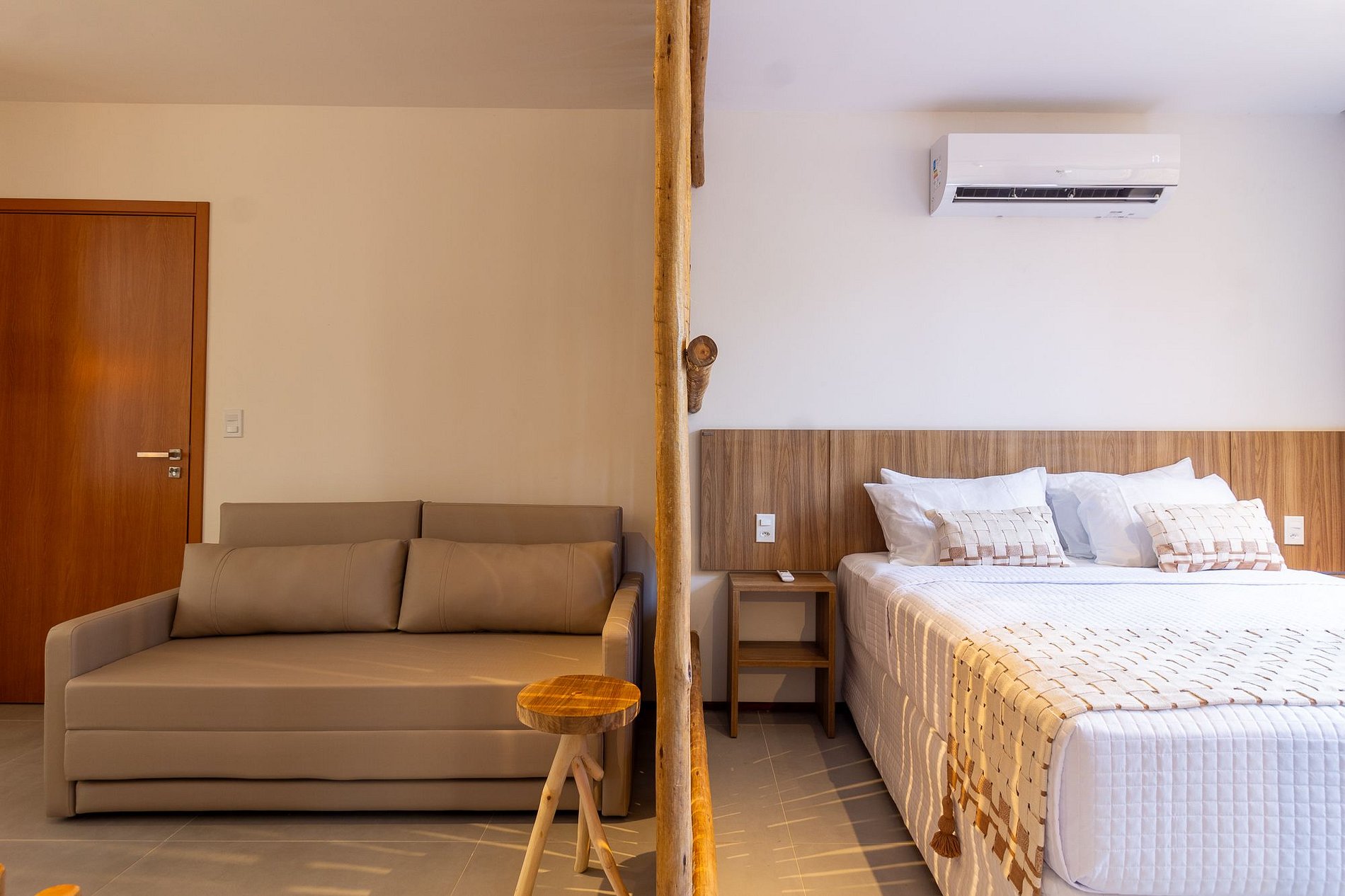 • Estúdio: sofá-cama de casal, cama de casal, ar condicionado, Smart TV, cortinas blackout, armário, banheiro privativo;