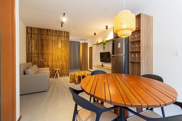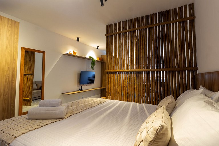 • Estúdio: sofá-cama de casal, cama de casal, ar condicionado, Smart TV, cortinas blackout, armário, banheiro privativo;