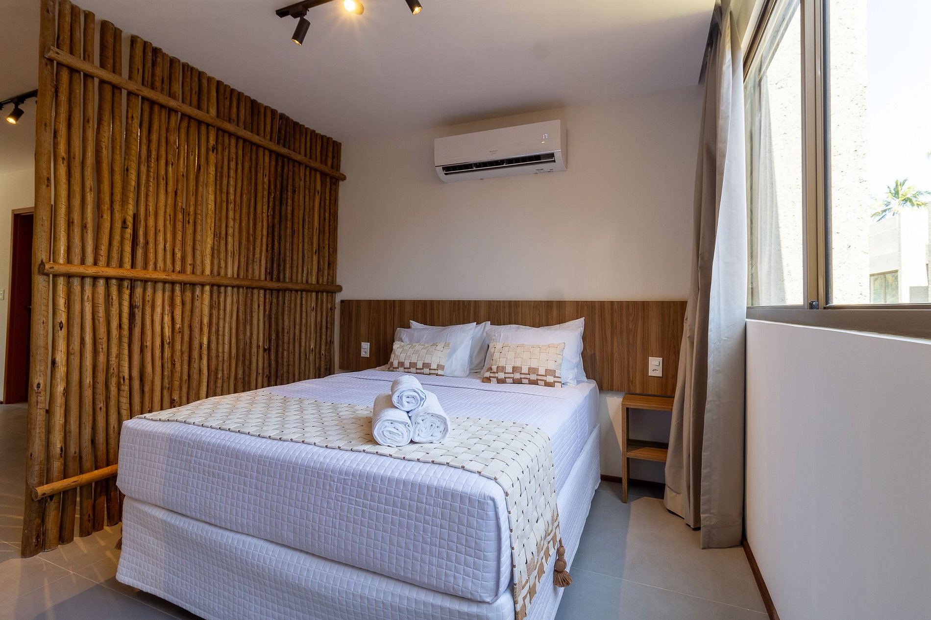 • Estúdio: sofá-cama de casal, cama de casal, ar condicionado, Smart TV, cortinas blackout, armário, banheiro privativo;
