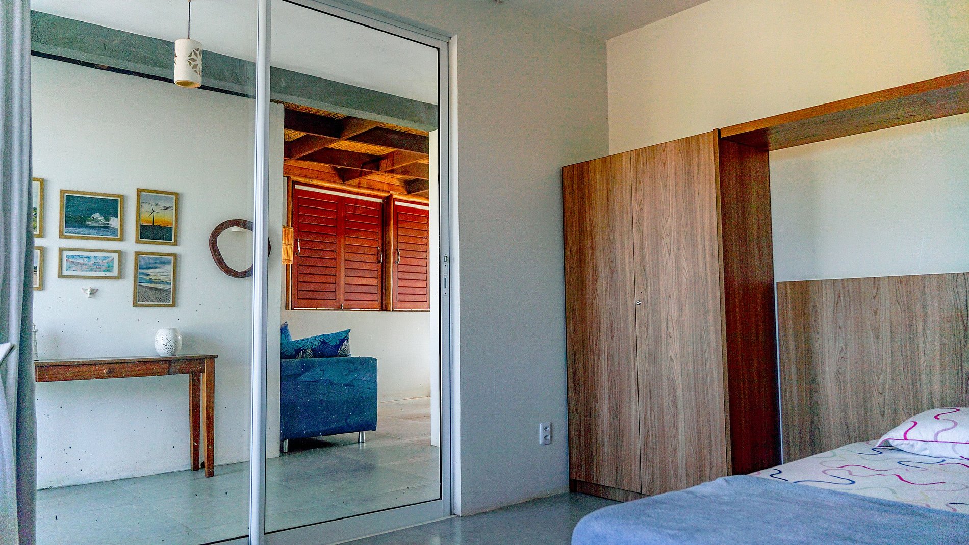 Quarto 3: Quarto: Cama de casal Queen, ar-condicionado, cortina blackout, guarda roupas e espelho pequeno.