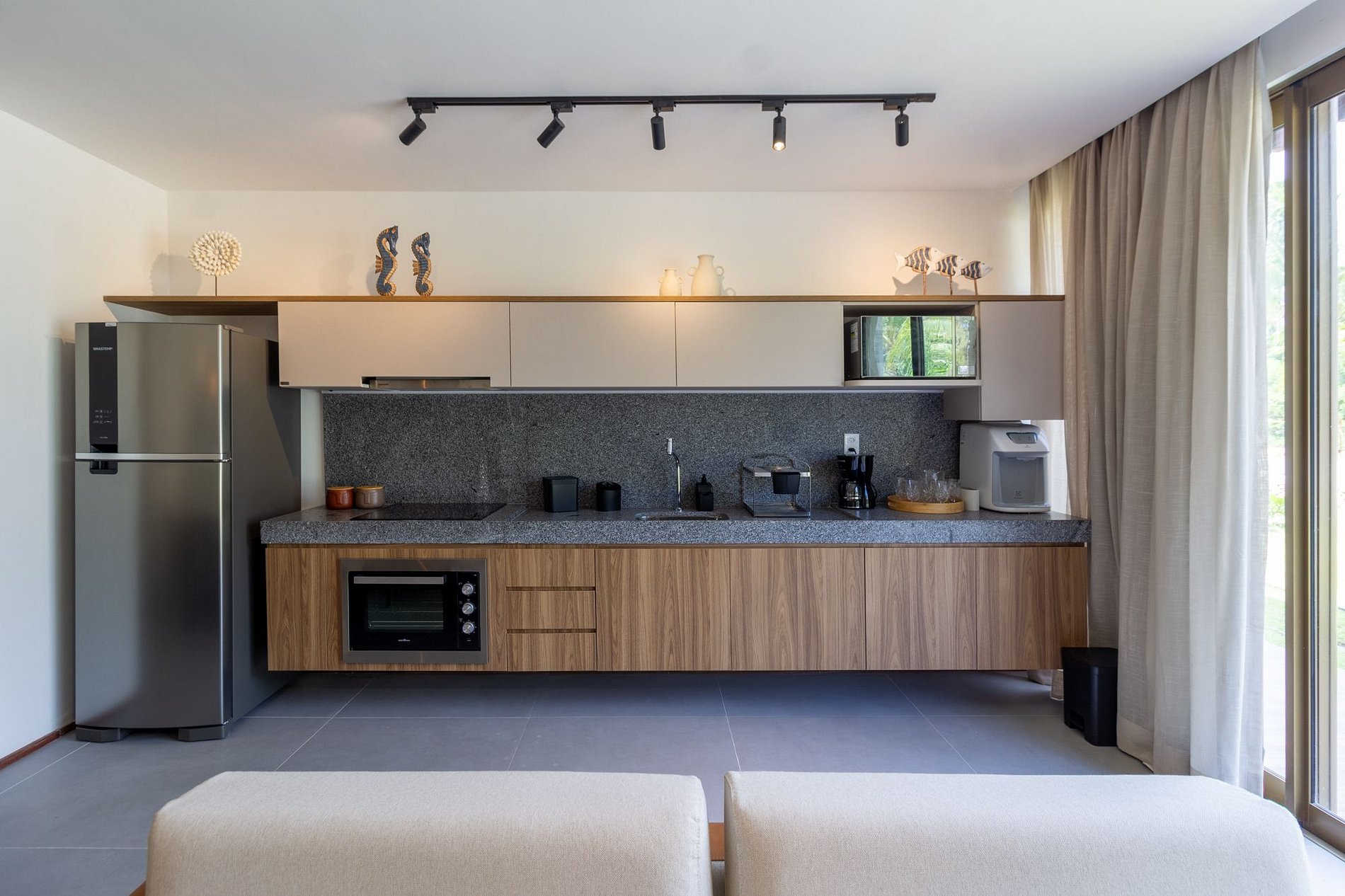 • Cozinha: Geladeira, fogão por indução, cutelaria básica.