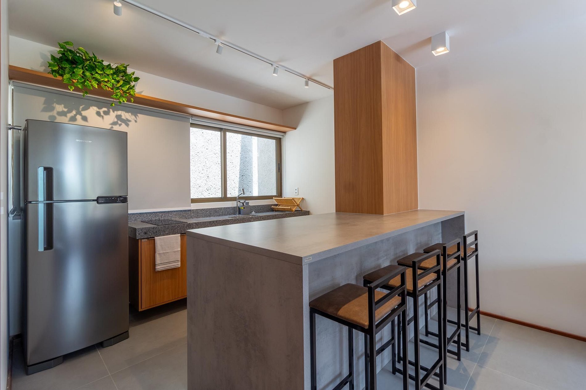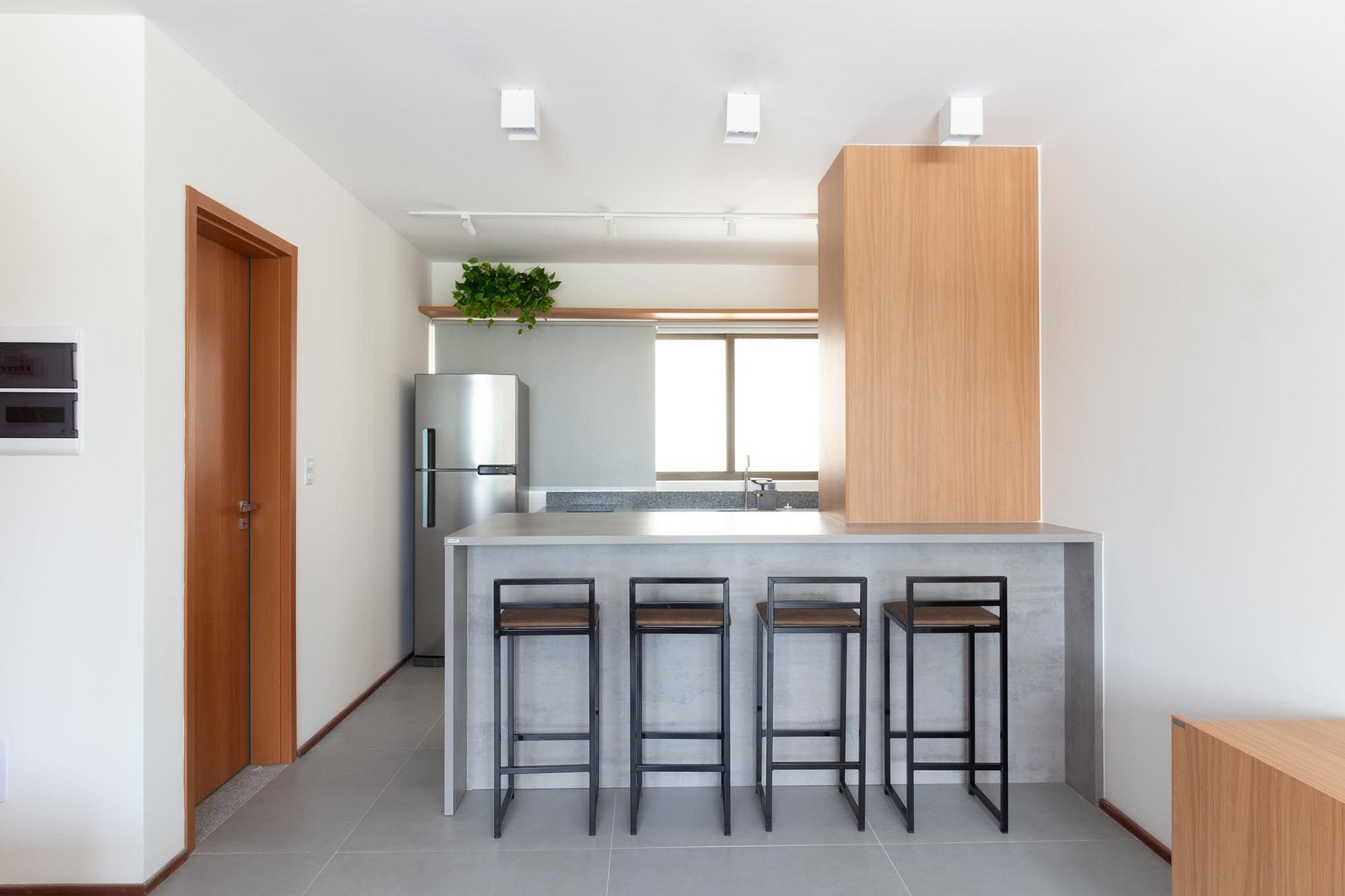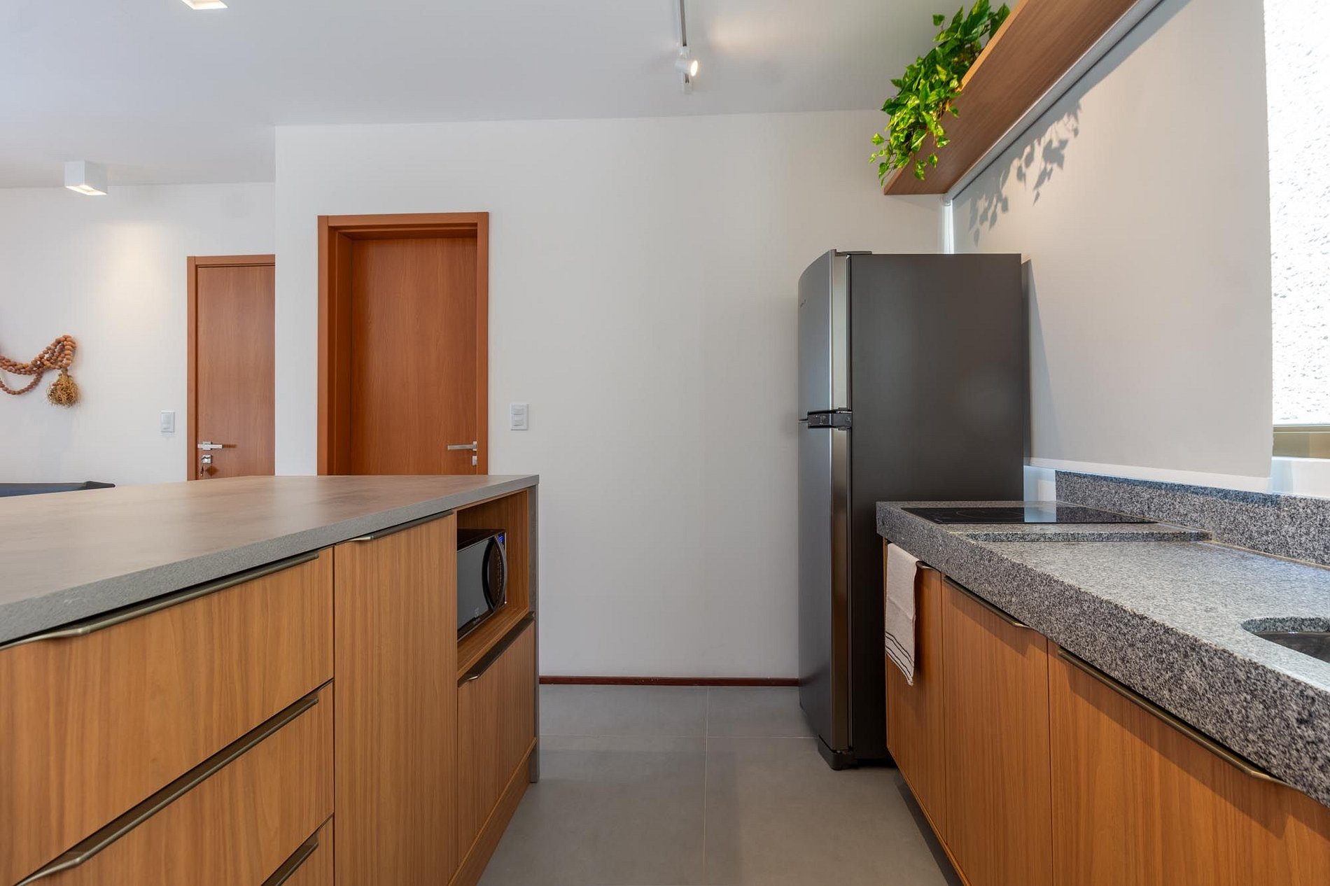 Sala e cozinha integradas: O design aberto da sala e da cozinha promove um espaço arejado e perfeito para recepção de amigos e familiares.