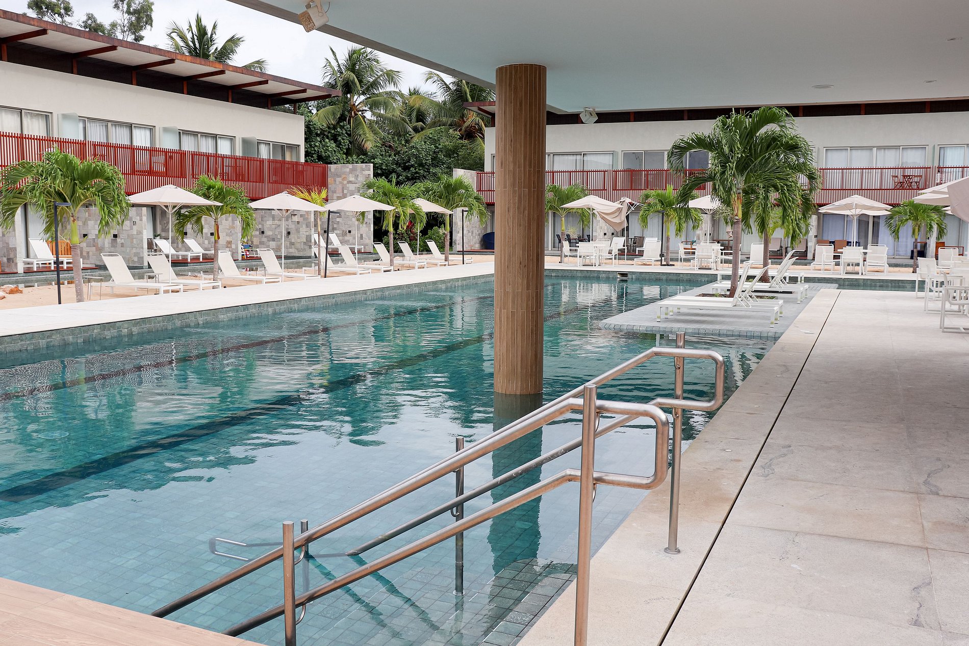 Varanda: piscina, duas espreguiçadeiras, mesa redonda, 3 cadeiras.