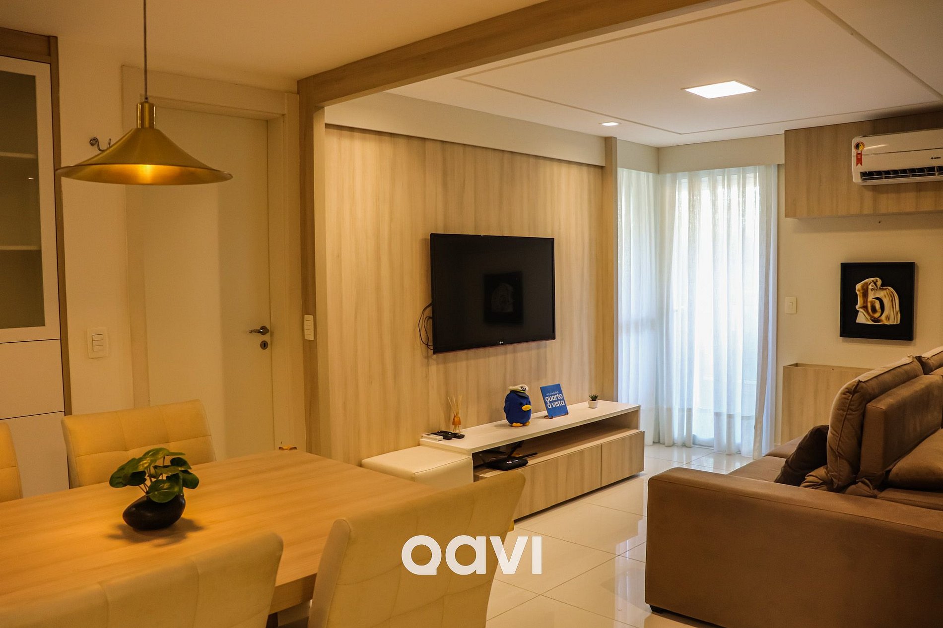 Sofá confortável, TV, Acesso à varanda com vista lateral para o mar, Ambiente integrado à cozinha