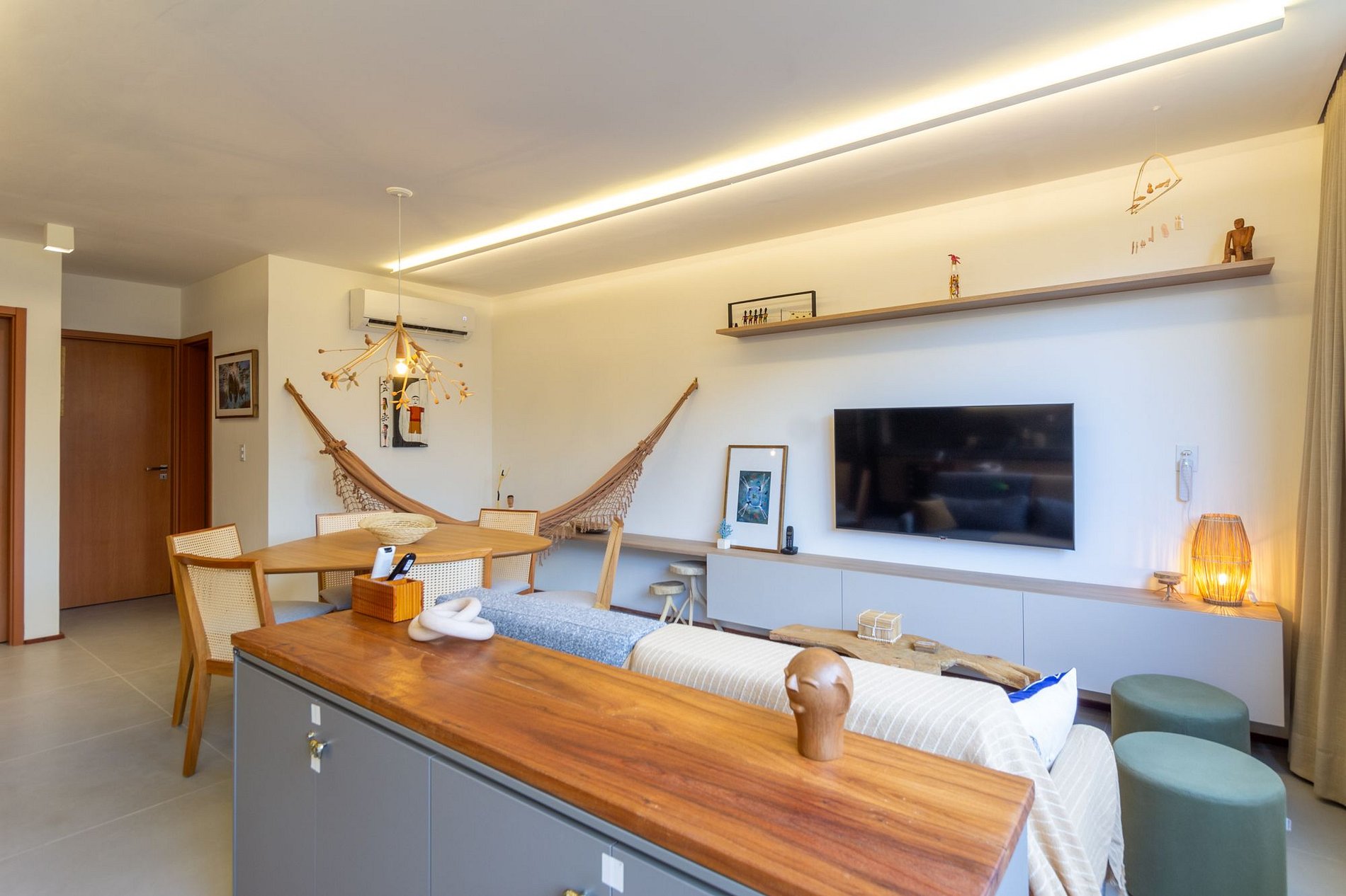 Sala de estar: sofá, mesa para 6 pessoas, Smart TV e ar-condicionado;