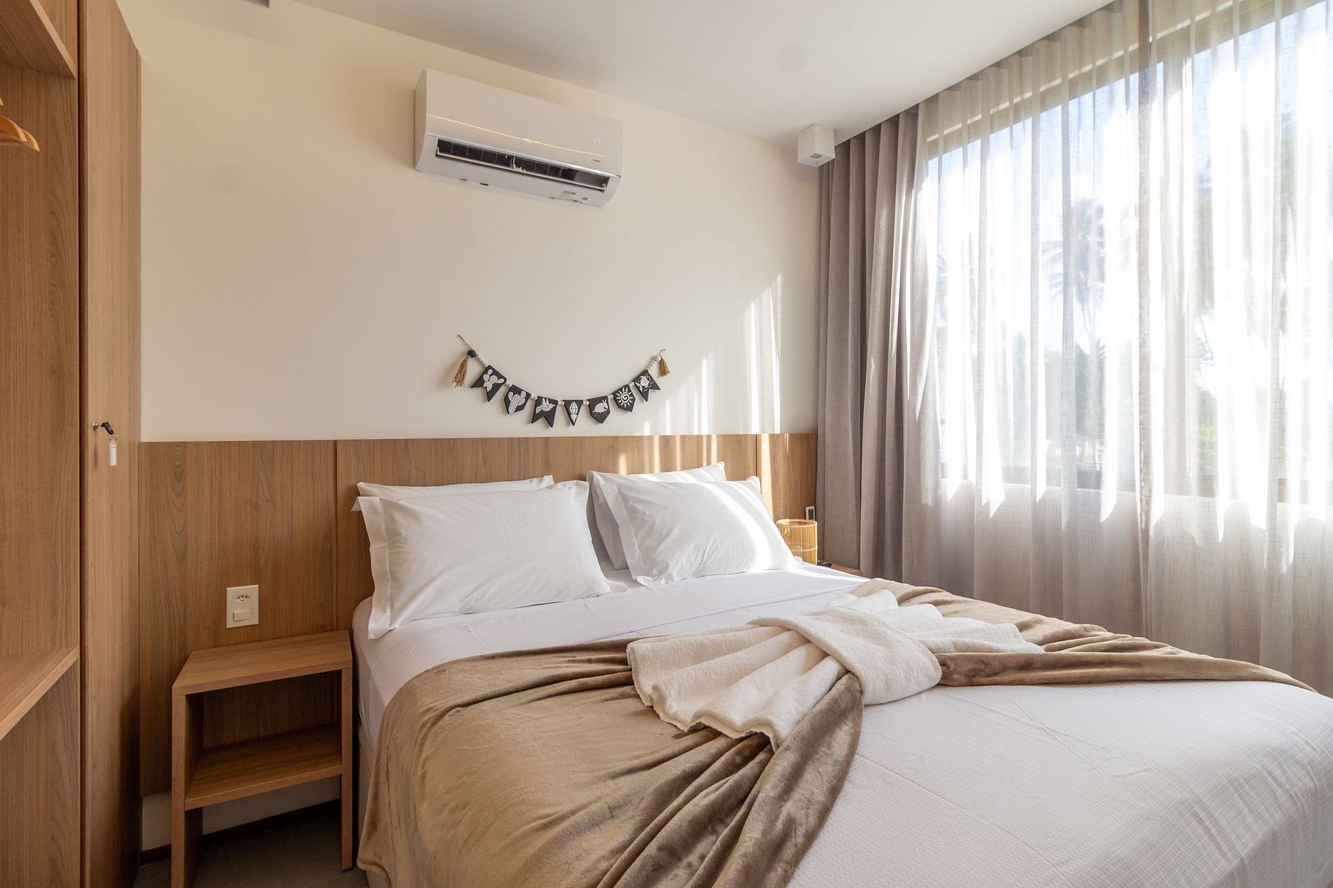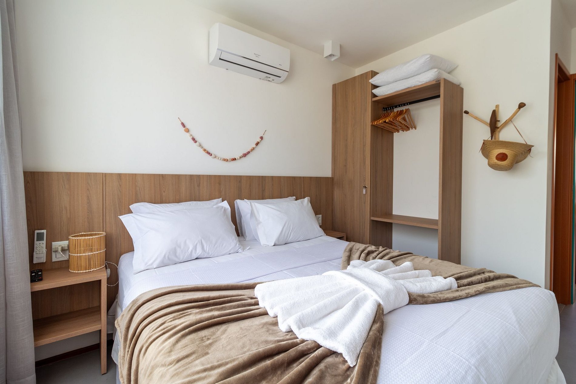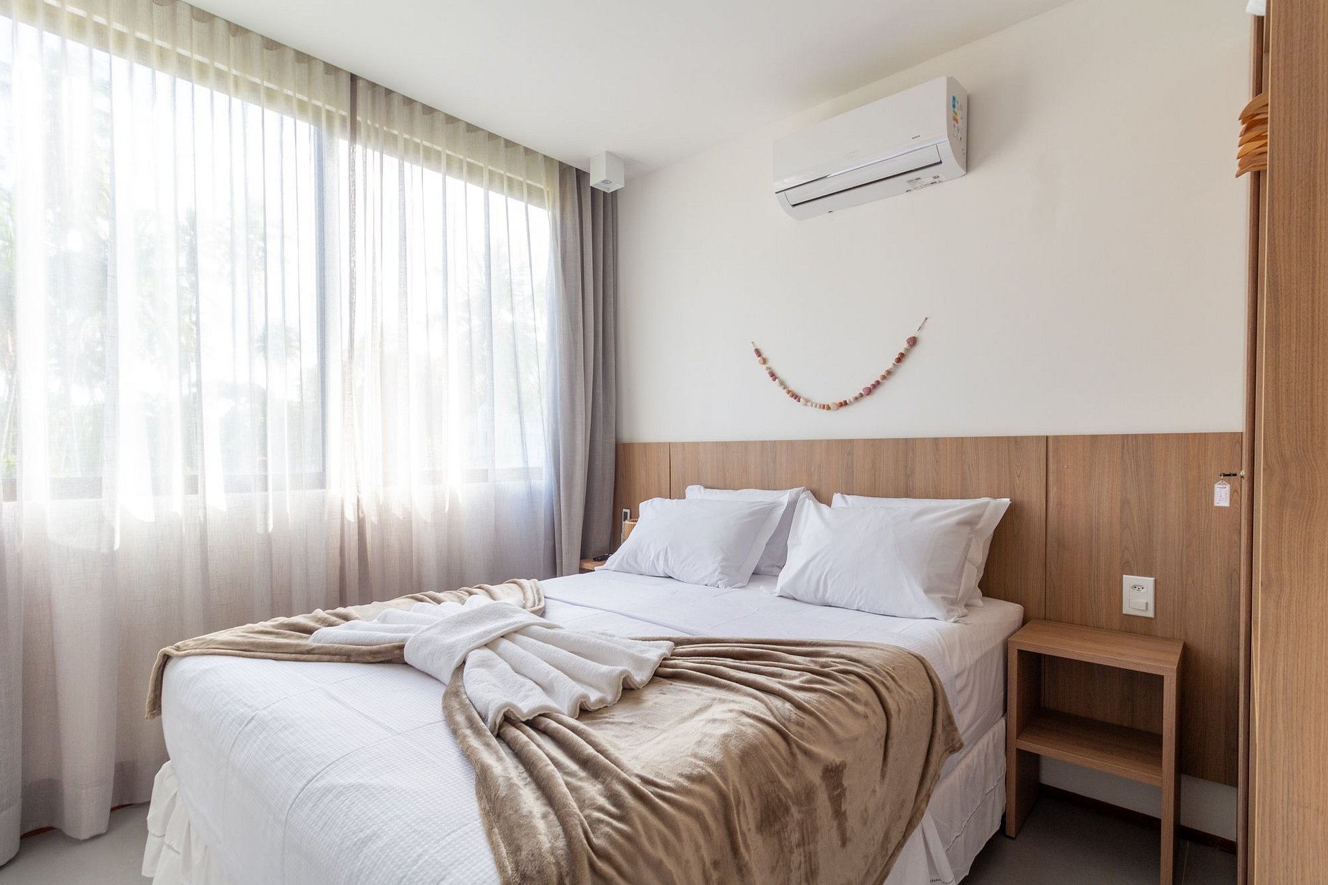 2 suítes: cama de casal, ar-condicionado, armário, Smart TV, cortinas blackout, banheiro;