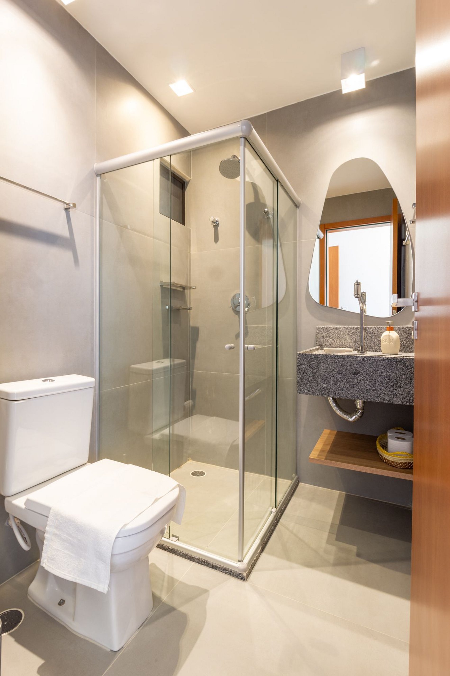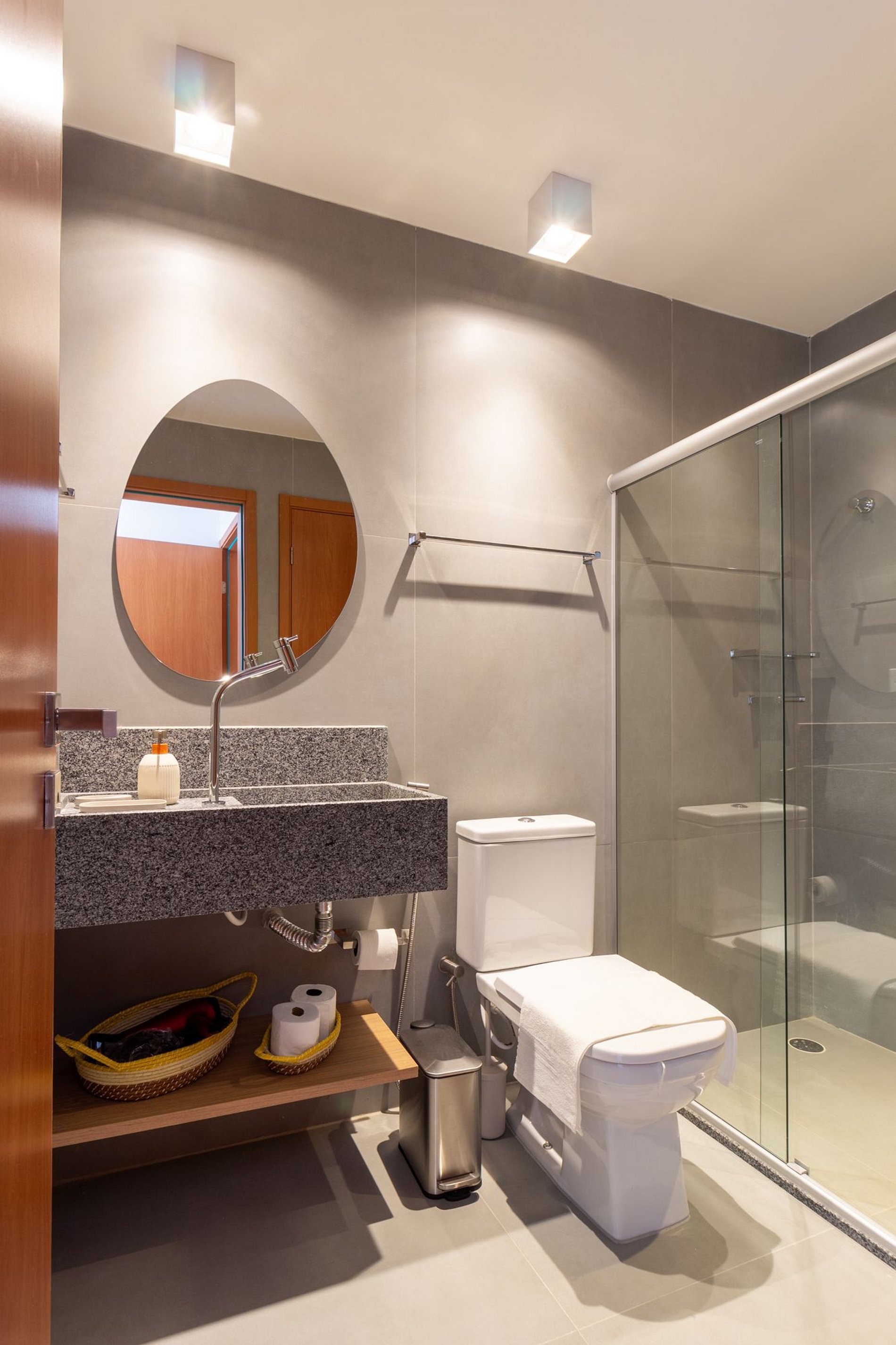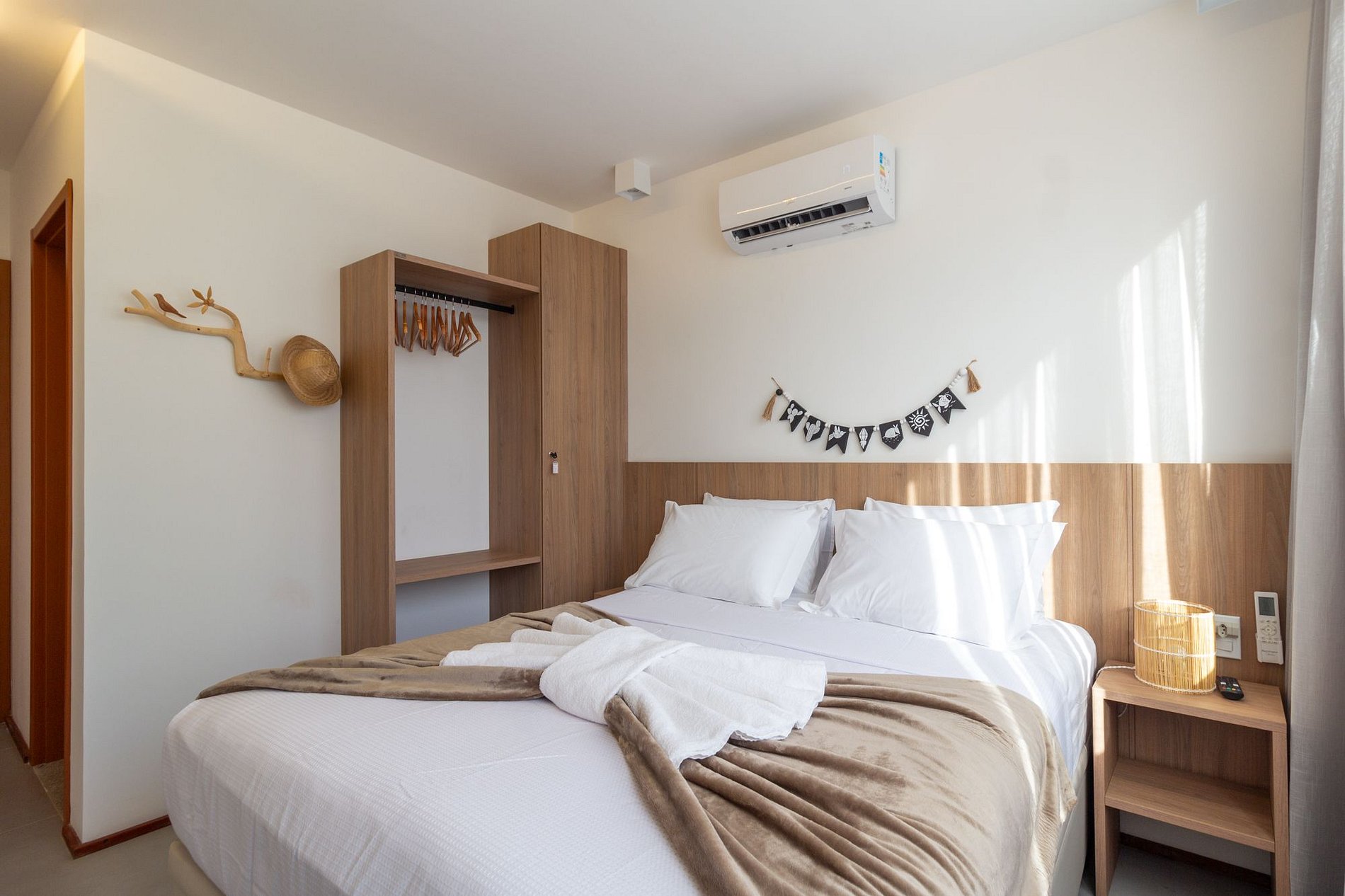 2 suítes: cama de casal, ar-condicionado, armário, Smart TV, cortinas blackout, banheiro;