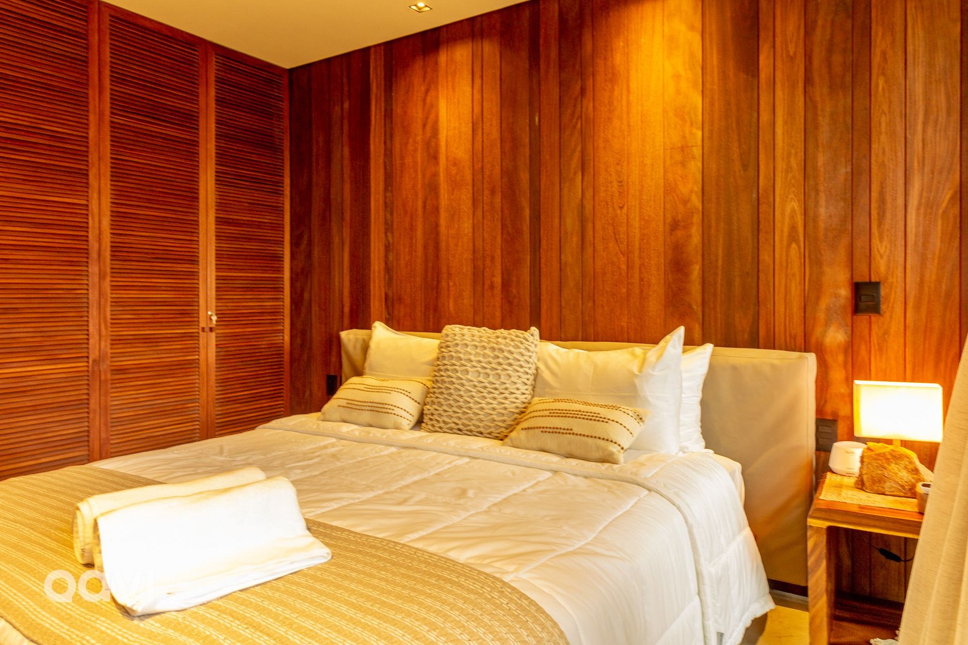 • Suíte 4: cama de casal, ar-condicionado, televisão smart tv, espelho de corpo inteiro, aparelhos decorativos e banheiro com utensílios básicos;