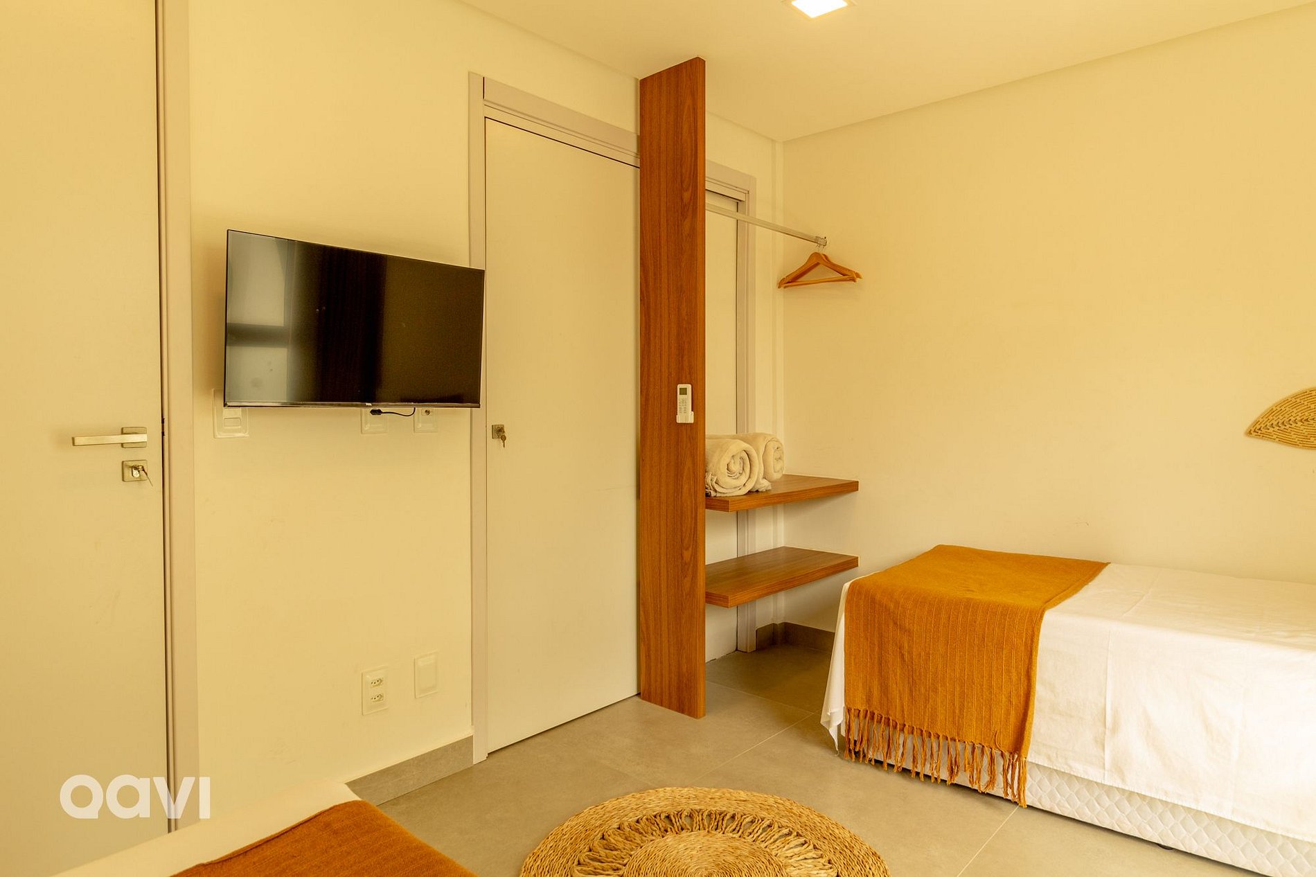 • Suíte 4: 2 camas de solteiro + 2 auxiliar de solteiro, ar-condicionado, itens decorativos e banheiro com utensílios básicos;