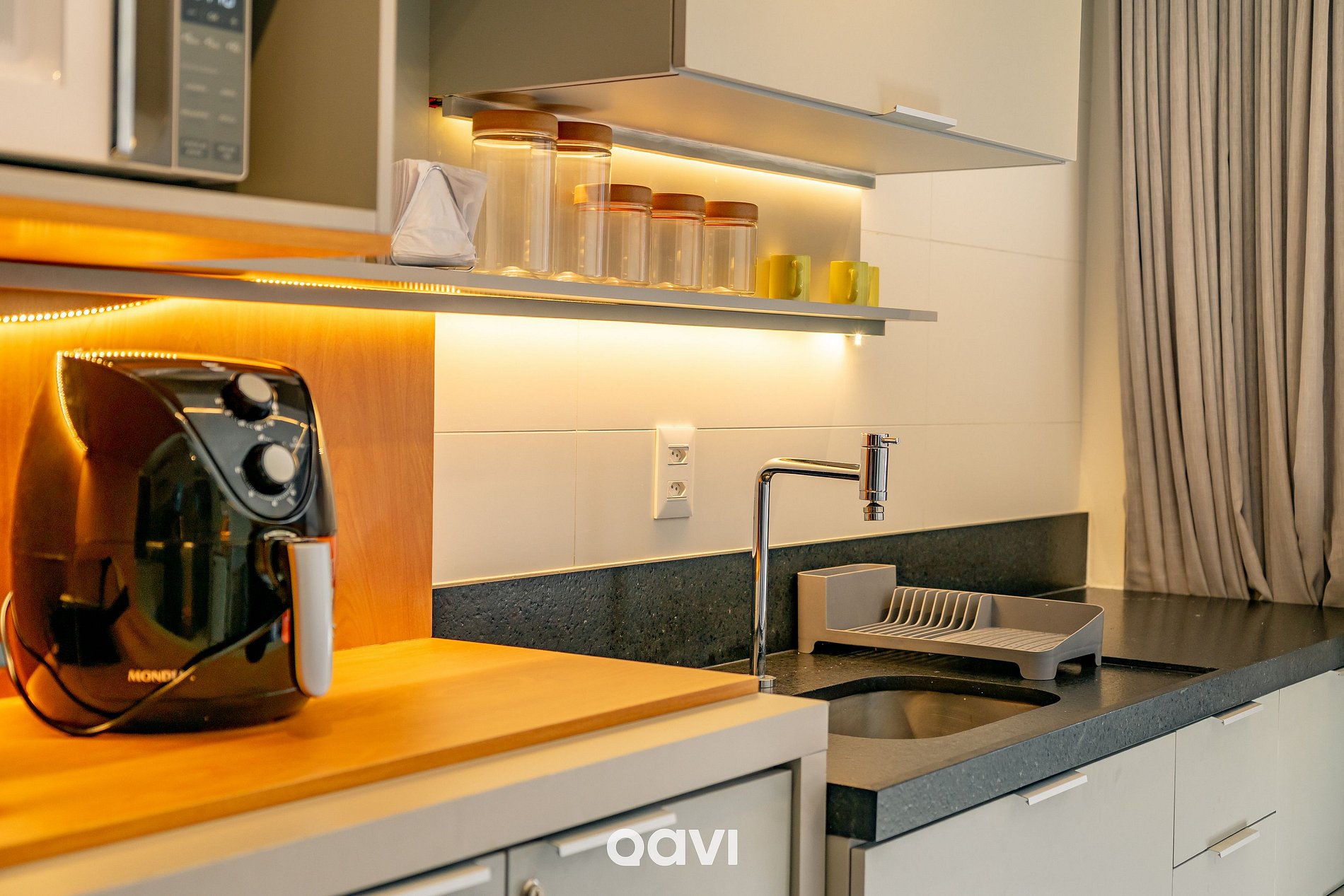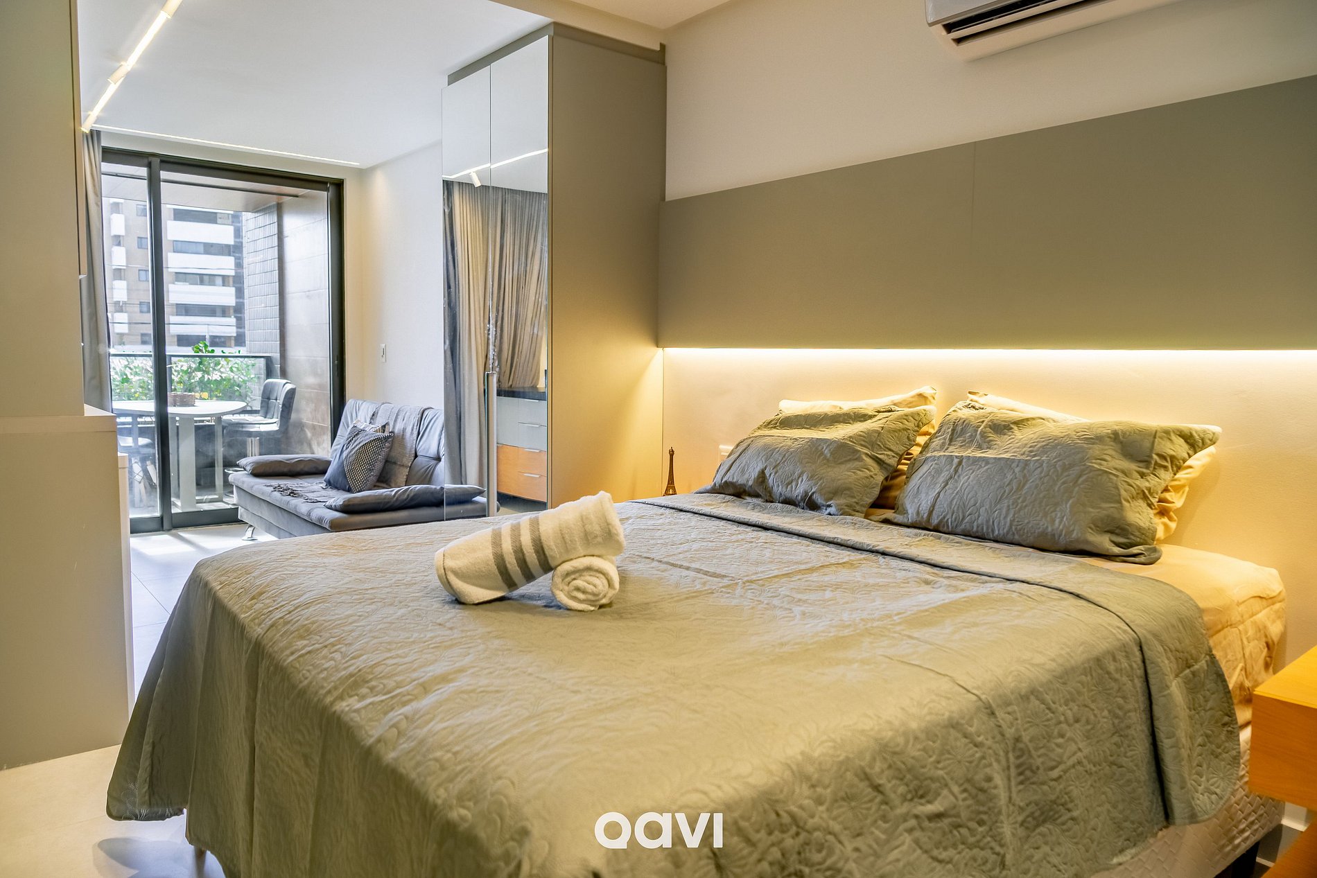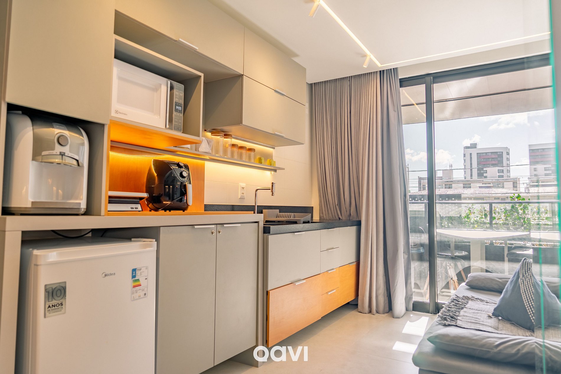 O flat é composto por uma suíte com cama de casal e um sofá cama comportando até 4 pessoas, uma cozinha compacta bem equipada com microondas, airfryer, gelágua e frigobar e uma varanda contendo mesas, cadeiras e TV.