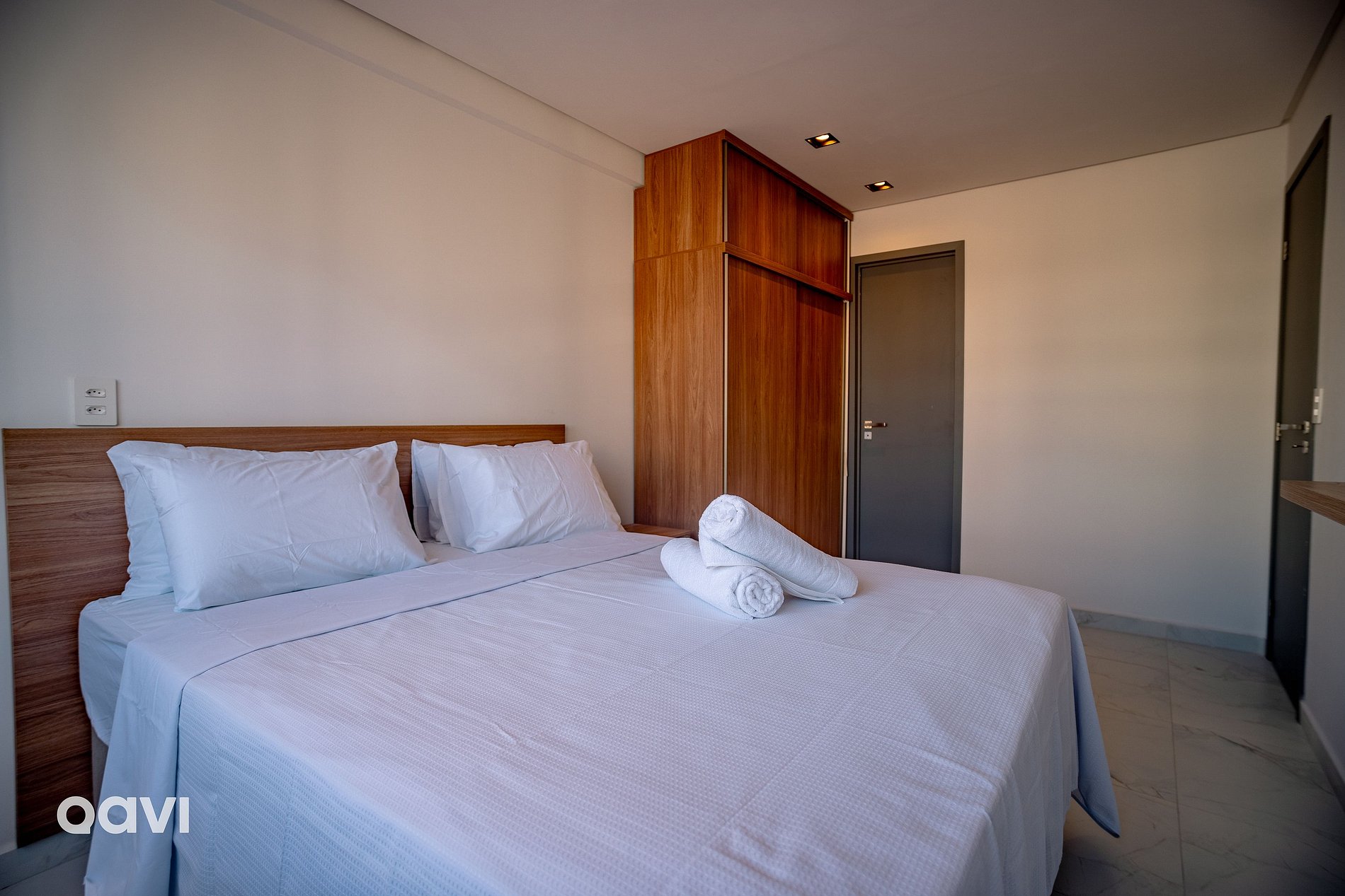 • Suíte (Cama de casal tipo queen, mesa de cabeceira, armário e ar-condicionado e banheiro com chuveiro elétrico e utensílios básicos);