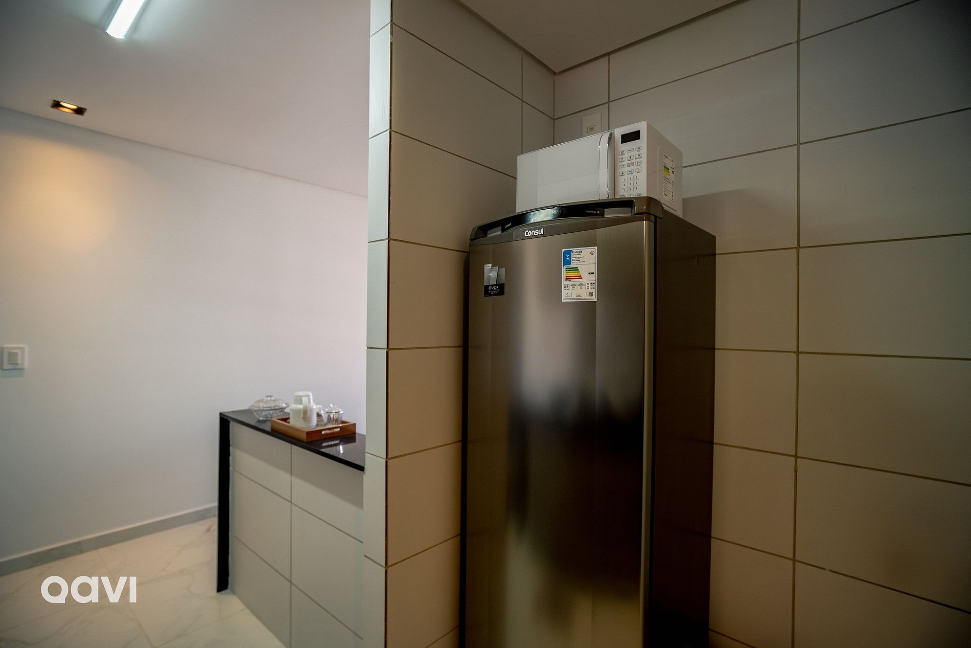 • Cozinha equipada (com geladeira, micro-ondas, liquidificador, torradeira, cafeteira e utensílios).
