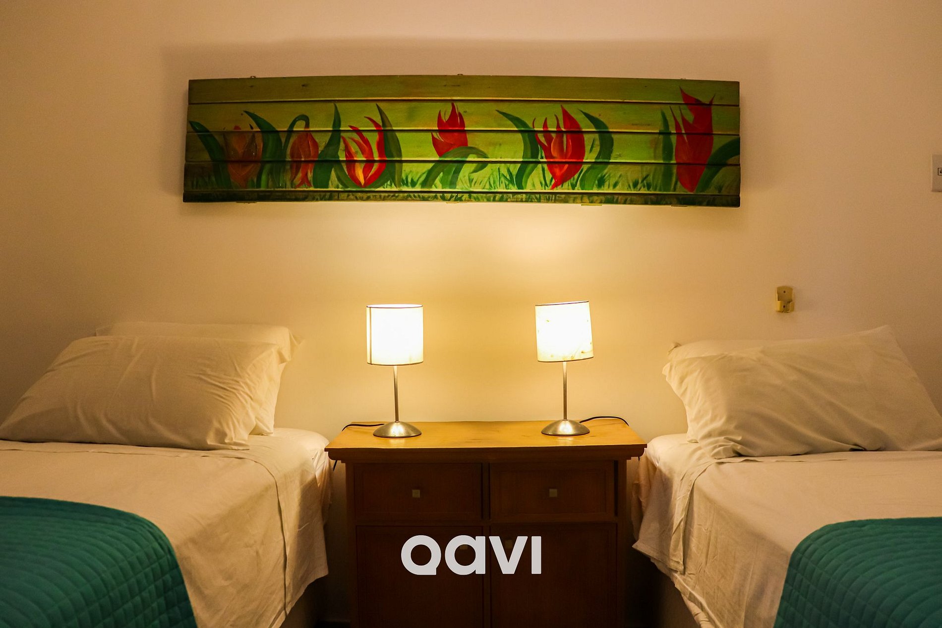 - Suíte 2: Quarto com duas camas de solteiro, arara para roupas, ar-condicionado e banheiro.
