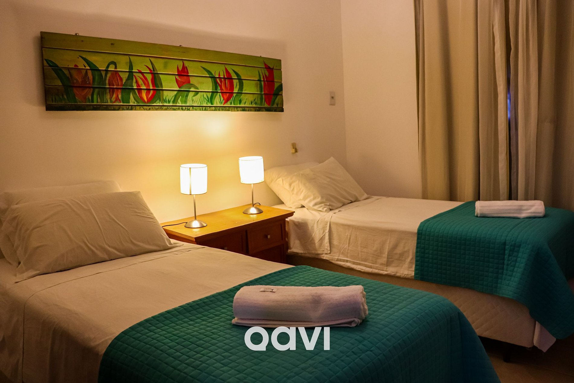 - Suíte 2: Quarto com duas camas de solteiro, arara para roupas, ar-condicionado e banheiro.
