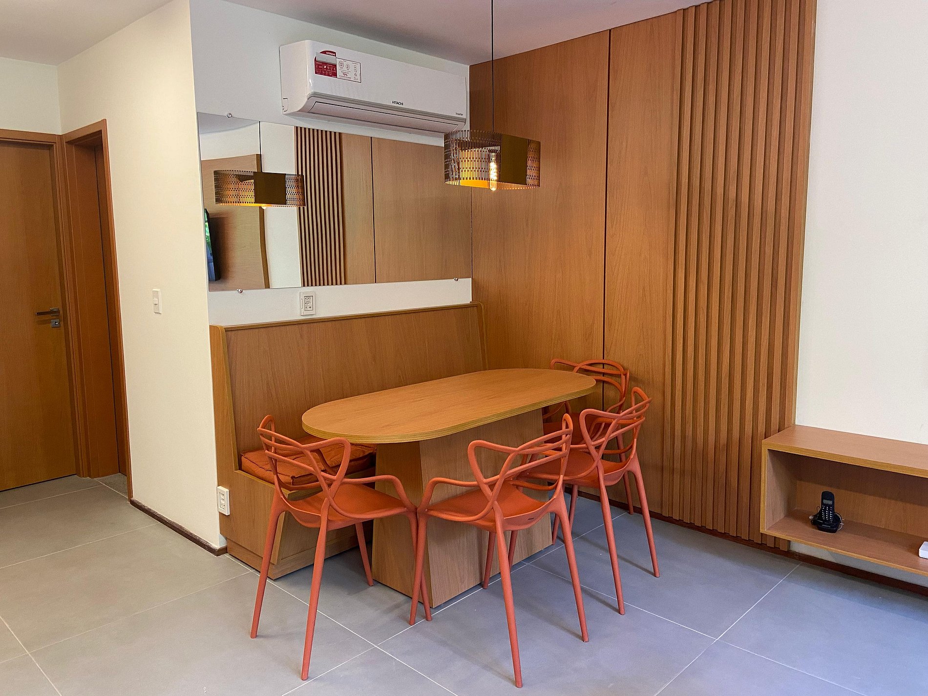 Sala e cozinha integradas: O design aberto da sala e da cozinha promove um espaço arejado e perfeito para recepção de amigos e familiares.