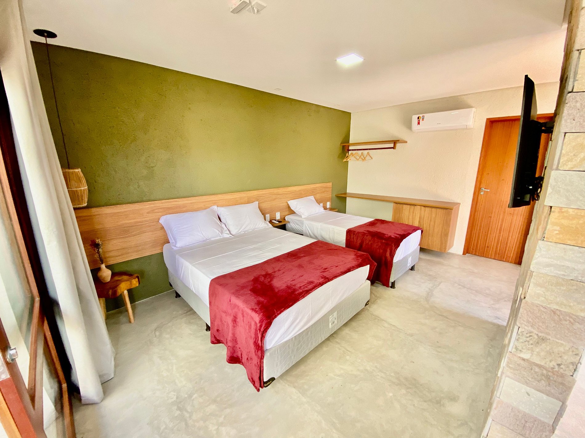 Quarto: 01 cama de casal + 02 camas de solteiro, TV Smart 43", ar-condicionado e ambiente confortável.