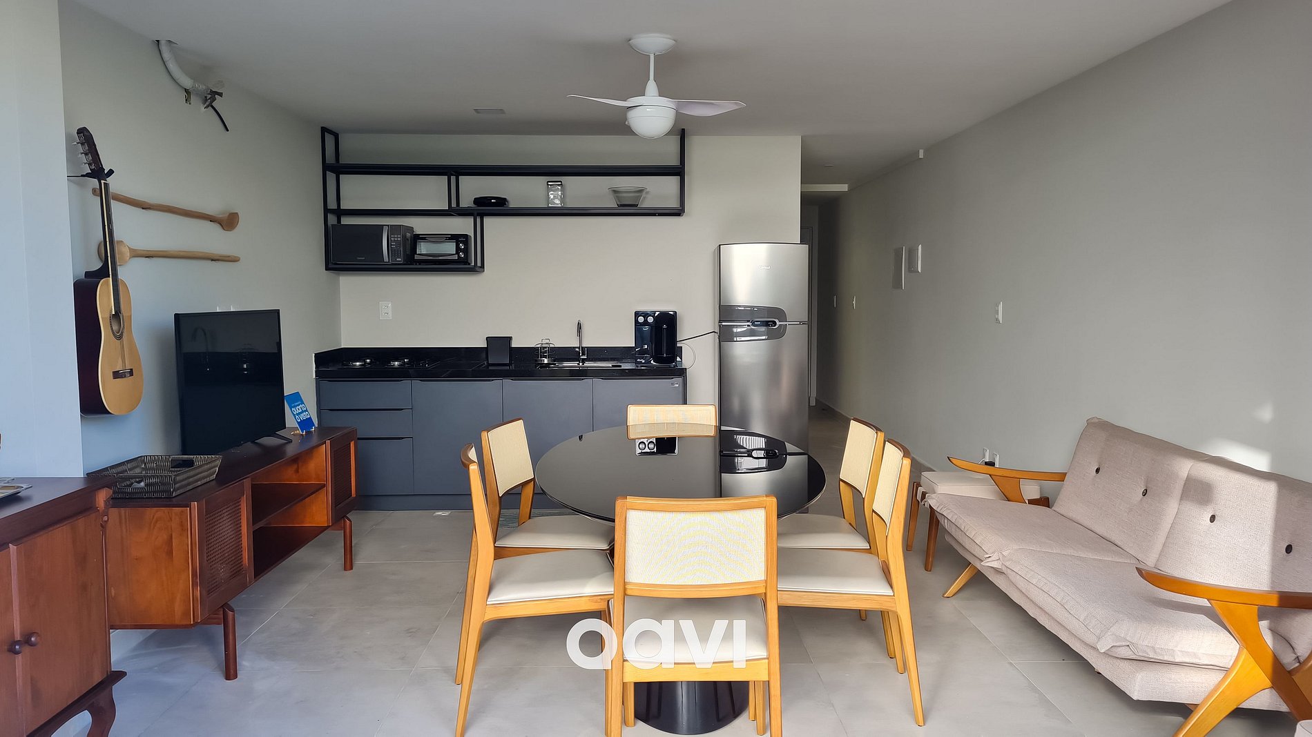 - Sala: Integrada com a cozinha, possui 1 sofá, televisão (Smart TV), ventilador de teto, mesa de jantar com 6 cadeiras, roteador Wi-Fi e acesso a área verde;