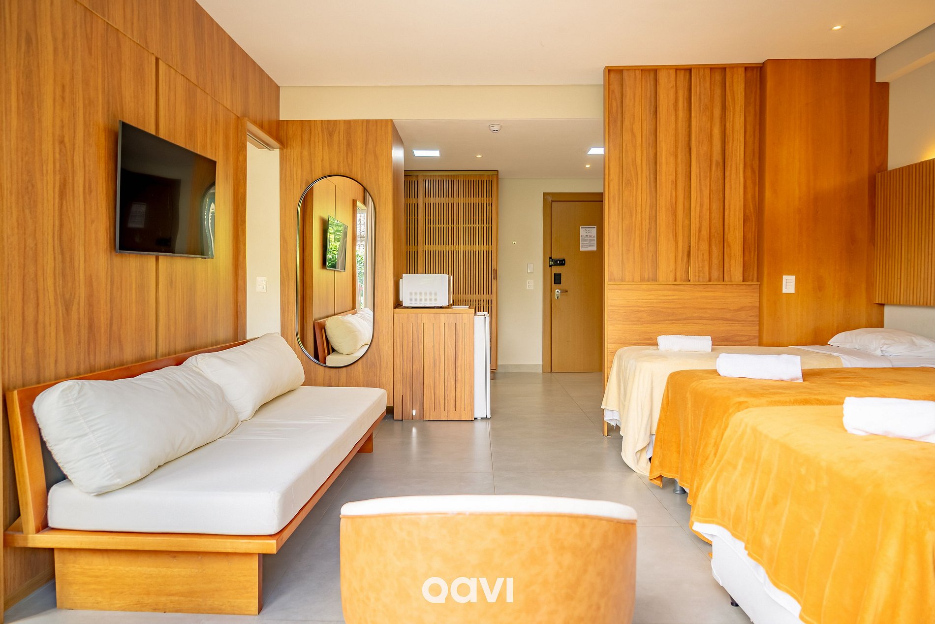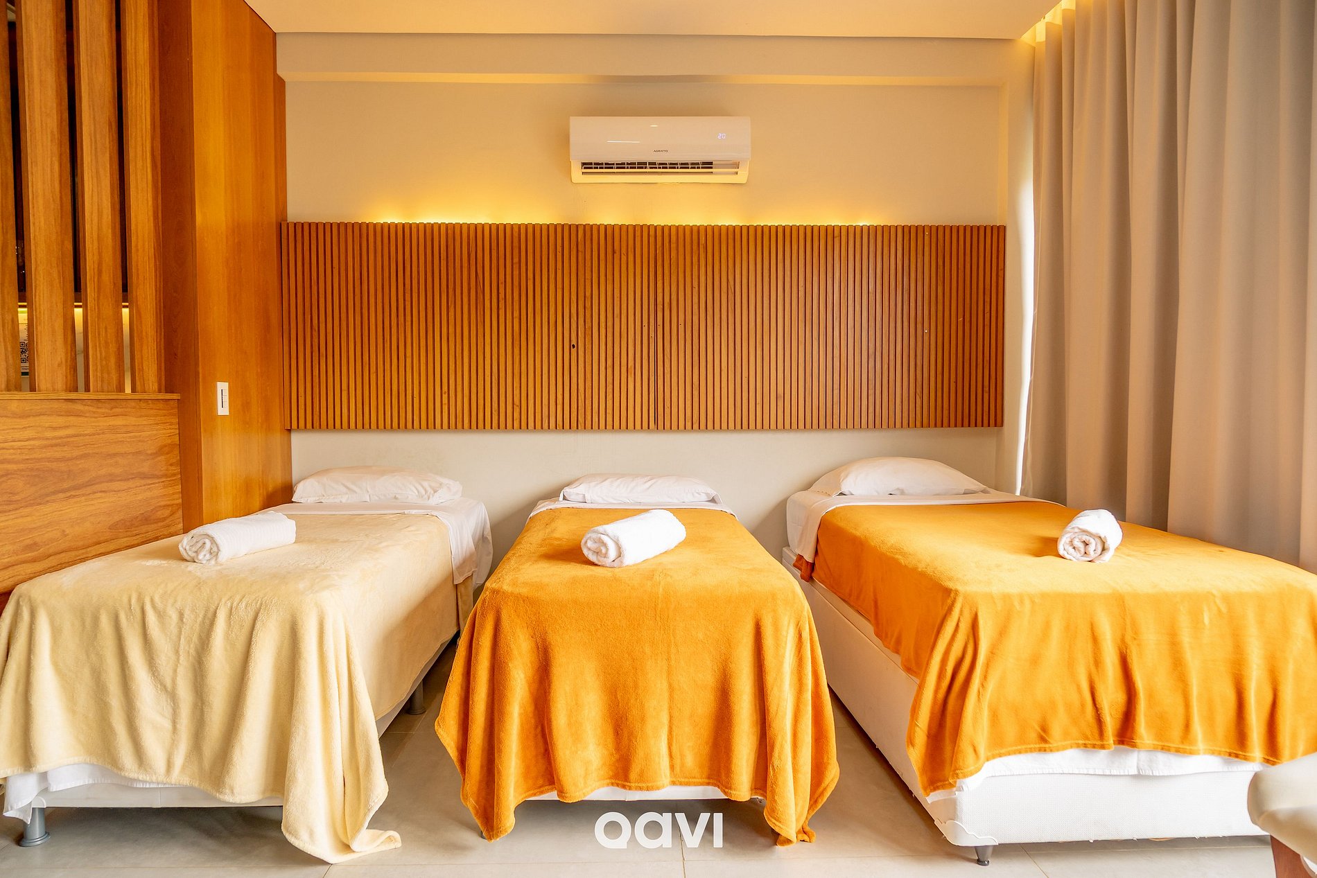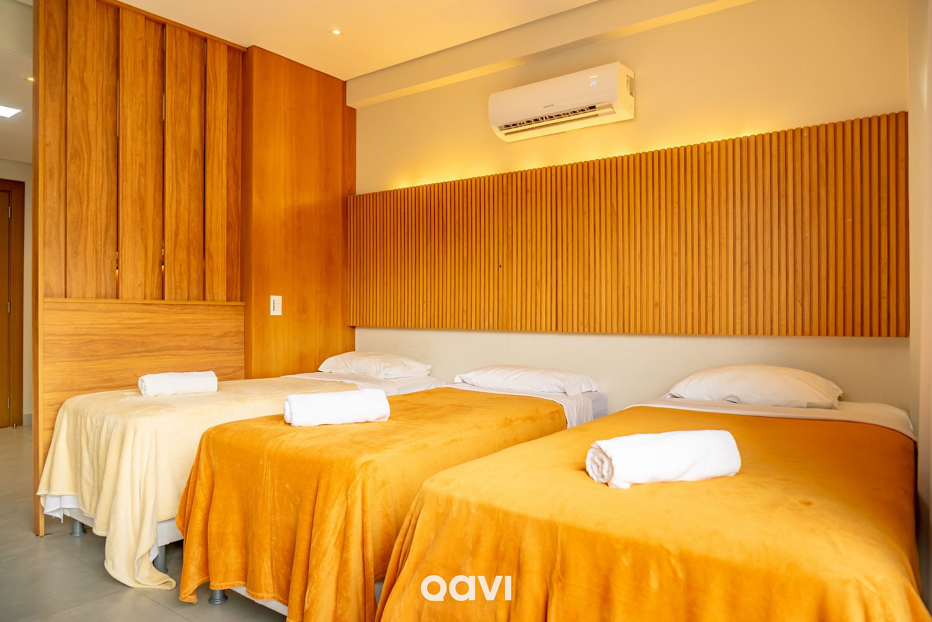 - Quarto: 1 cama de casal, 3 camas de solteiro, sofá, mesas de cabeceira, ar-condicionado;